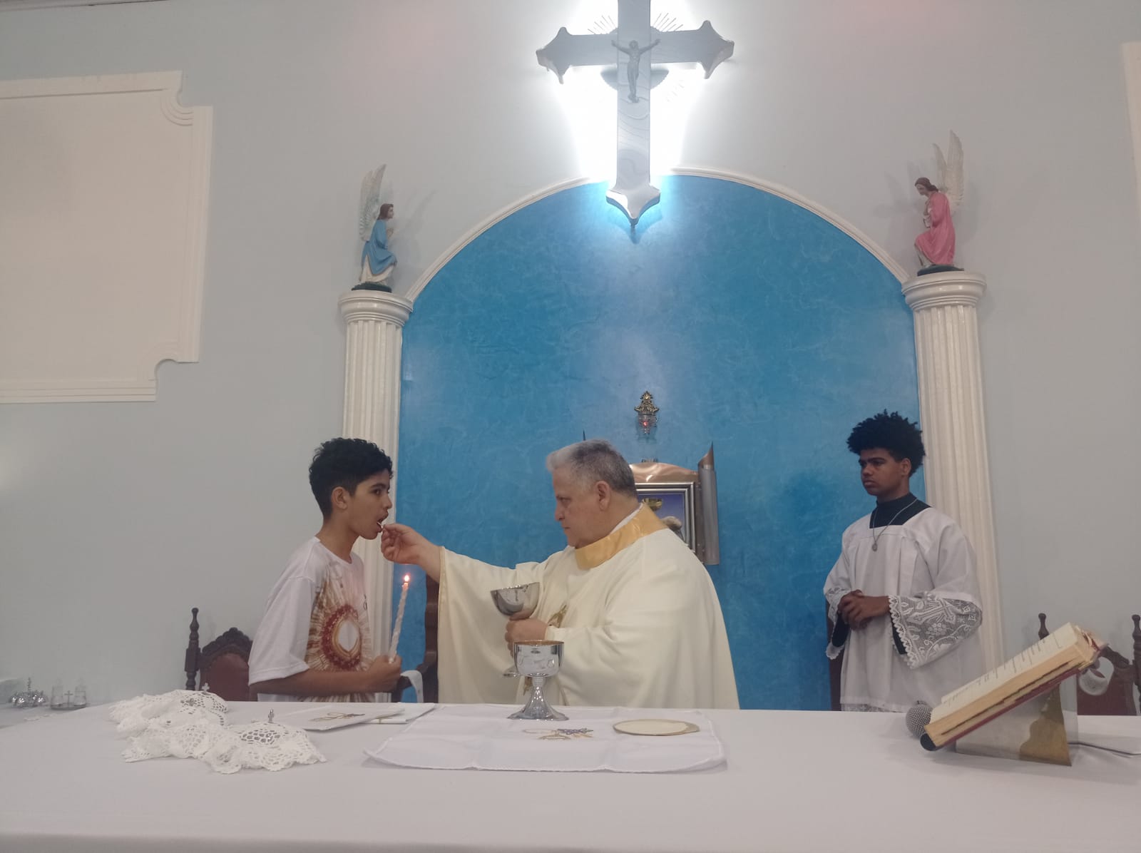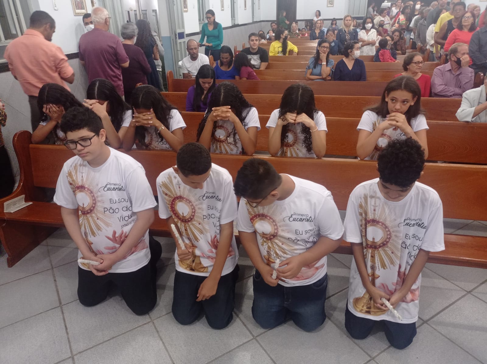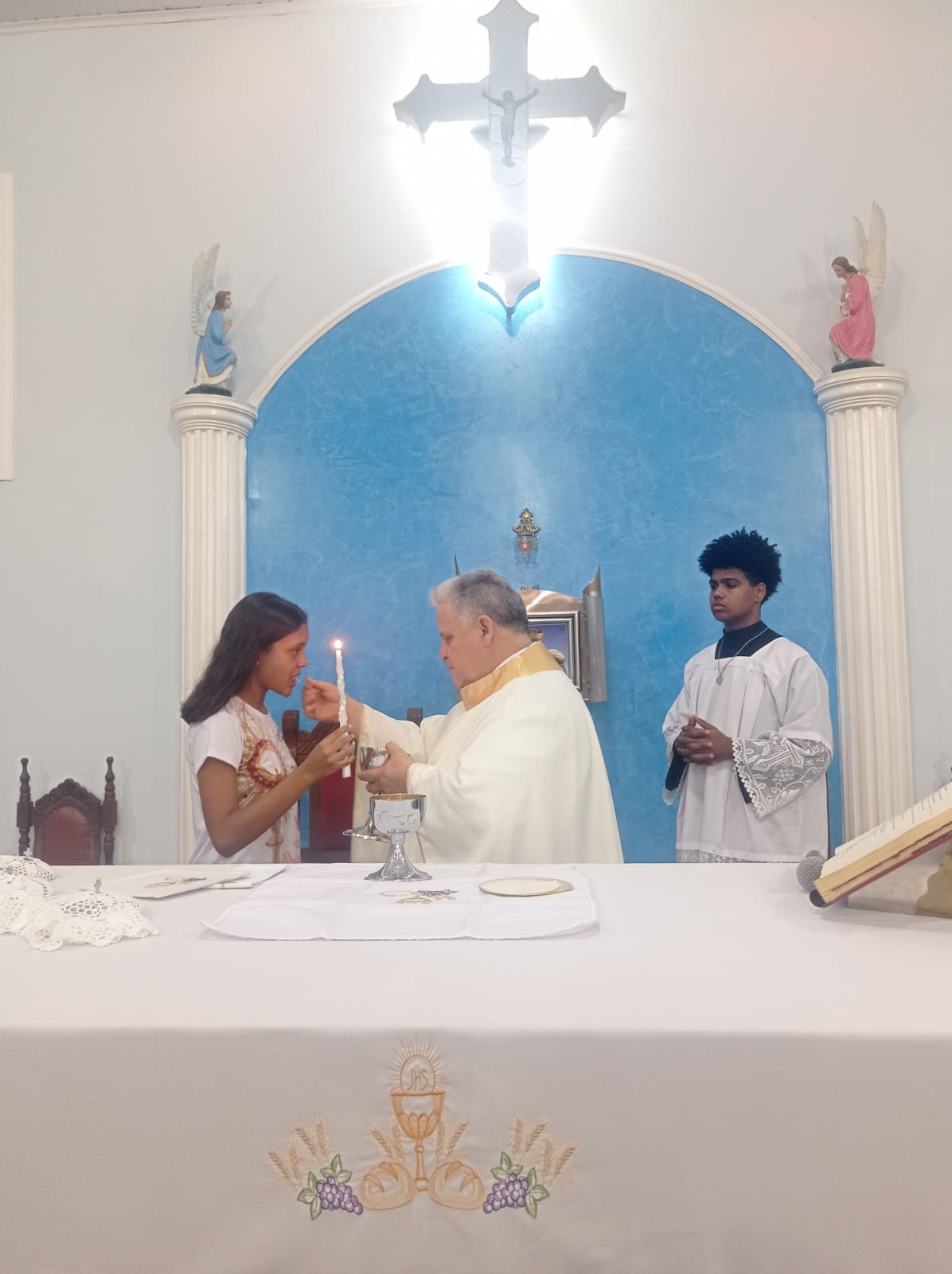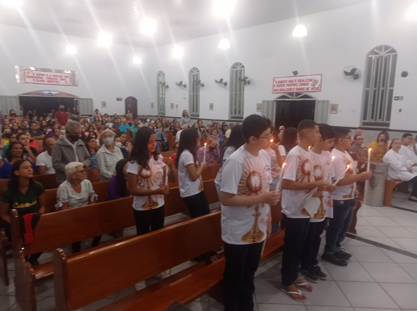 Em seguida, às 18h, o nosso pároco Padre Aloísio Vieira presidiu a Missa da Primeira Eucaristia dos catequizandos da Comunidade Nossa Senhora Aparecida.