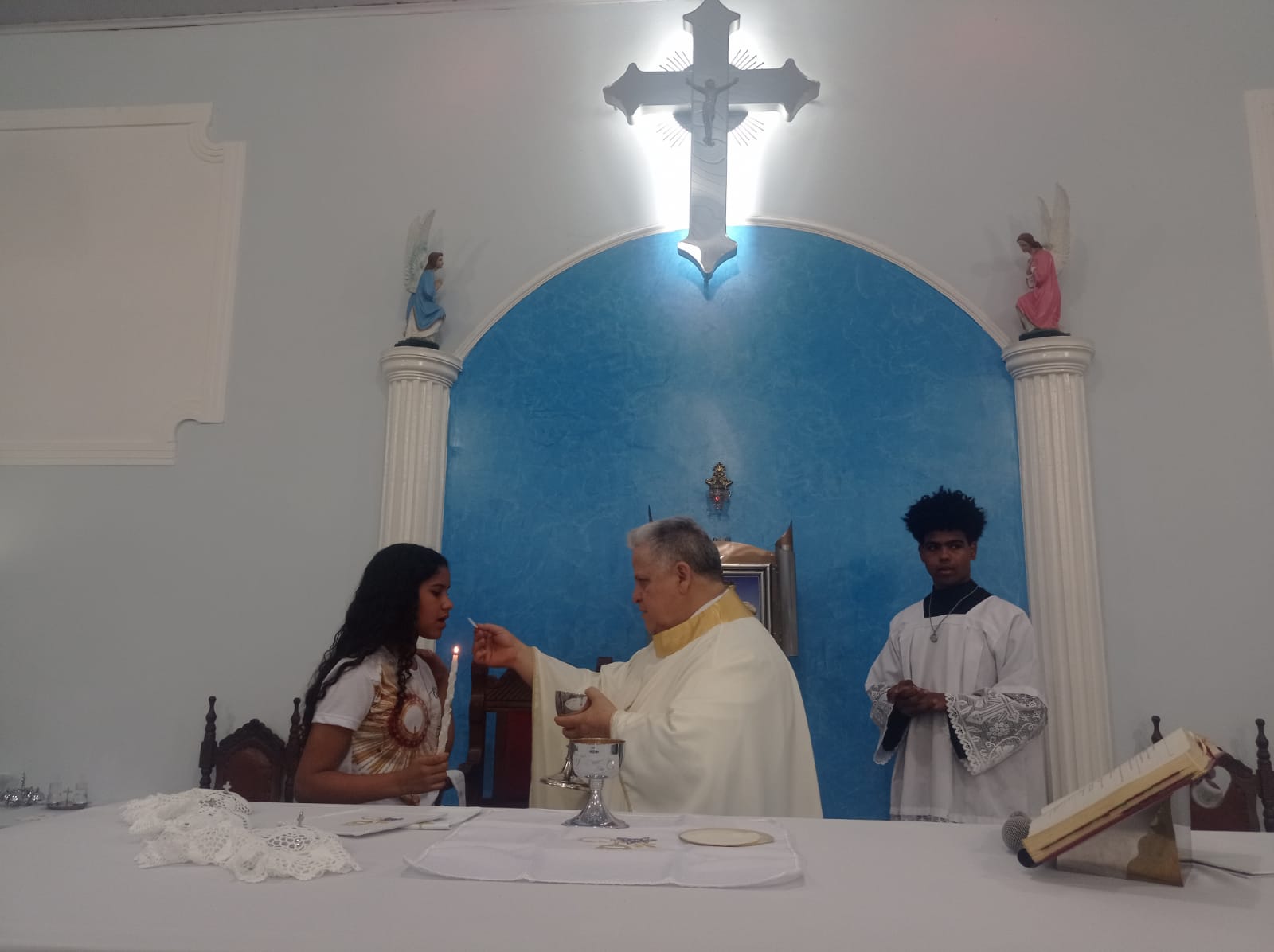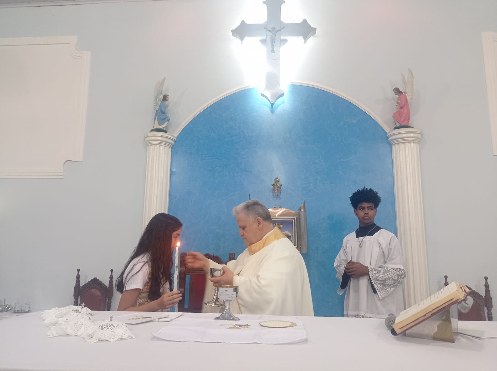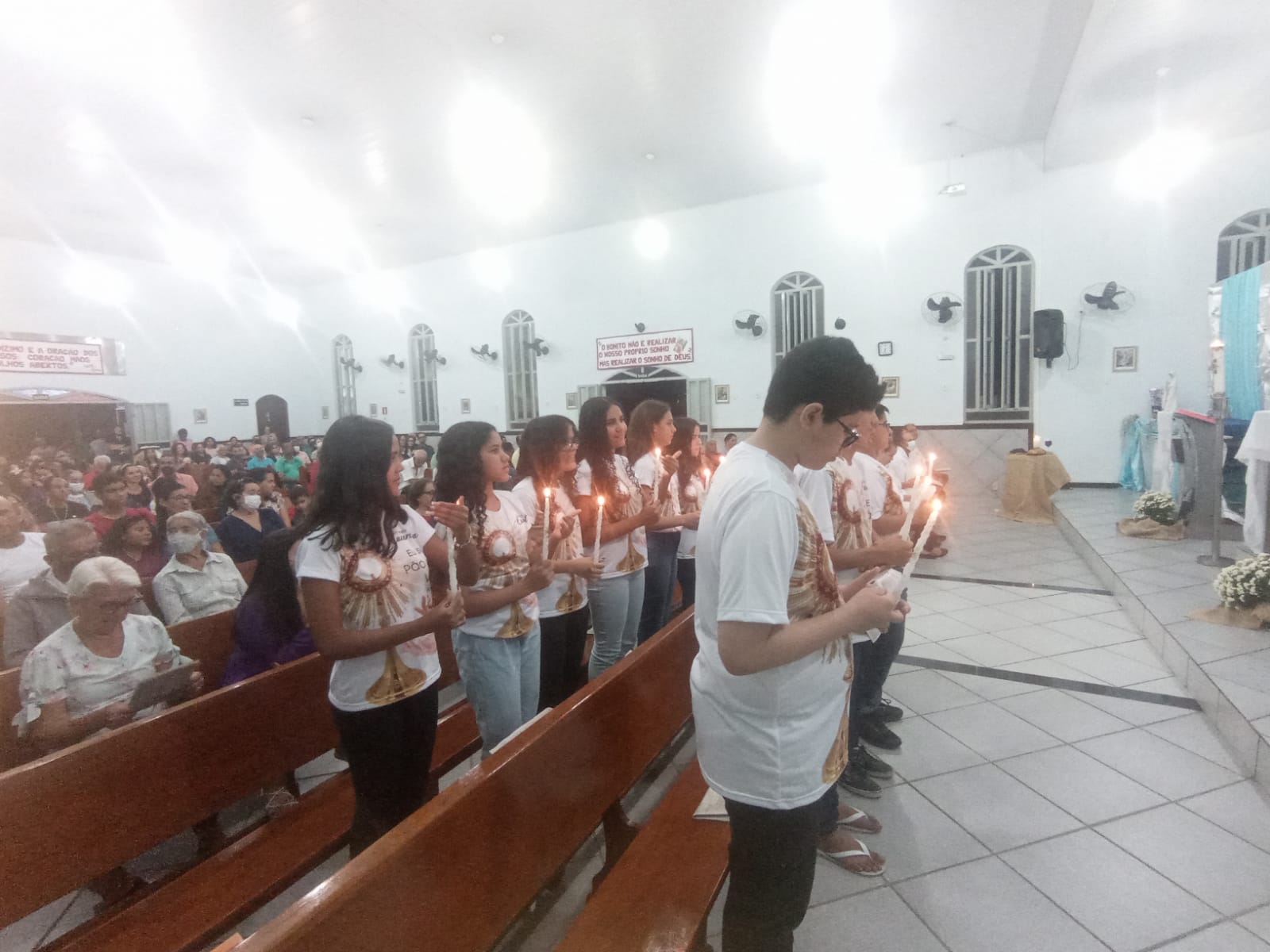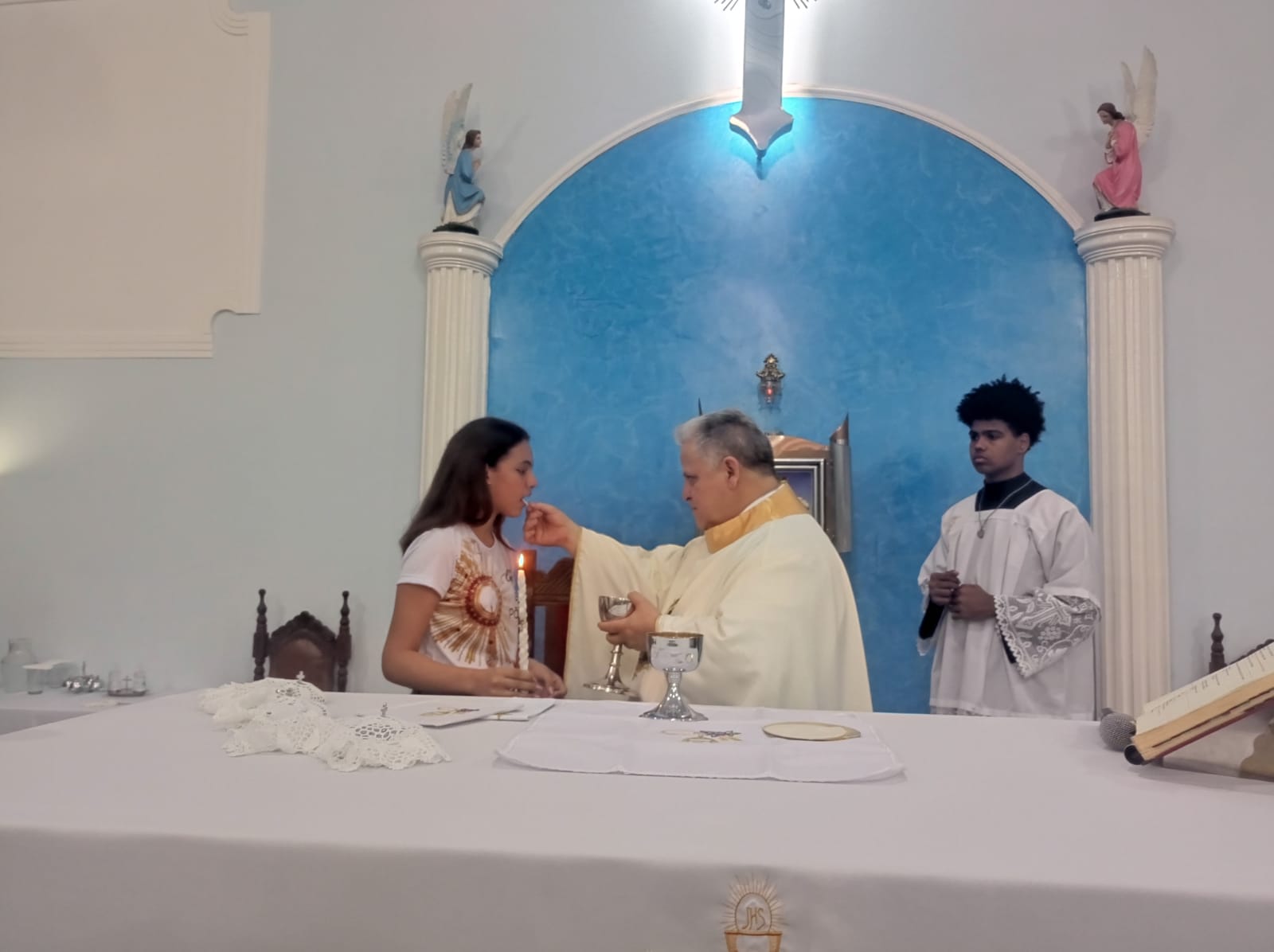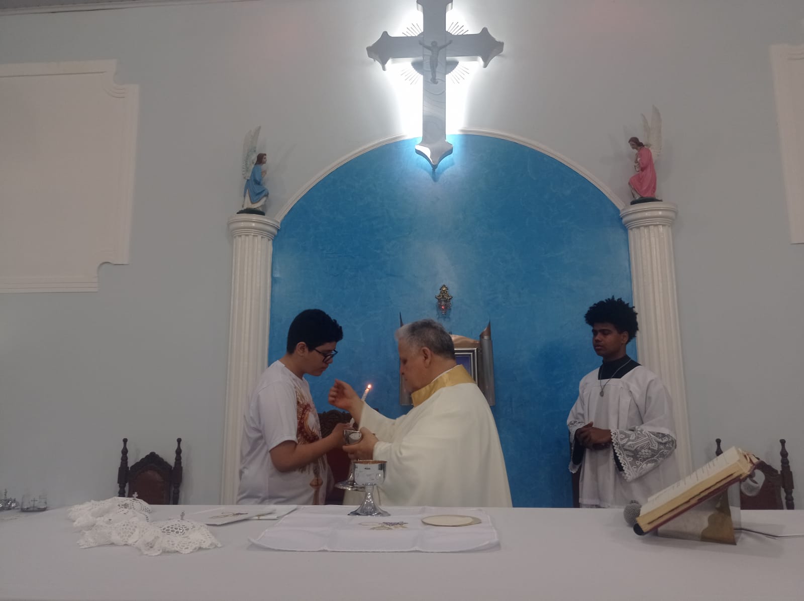 Em seguida, às 18h, o nosso pároco Padre Aloísio Vieira presidiu a Missa da Primeira Eucaristia dos catequizandos da Comunidade Nossa Senhora Aparecida.
