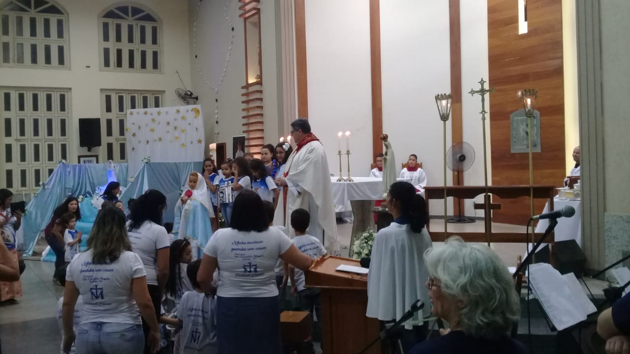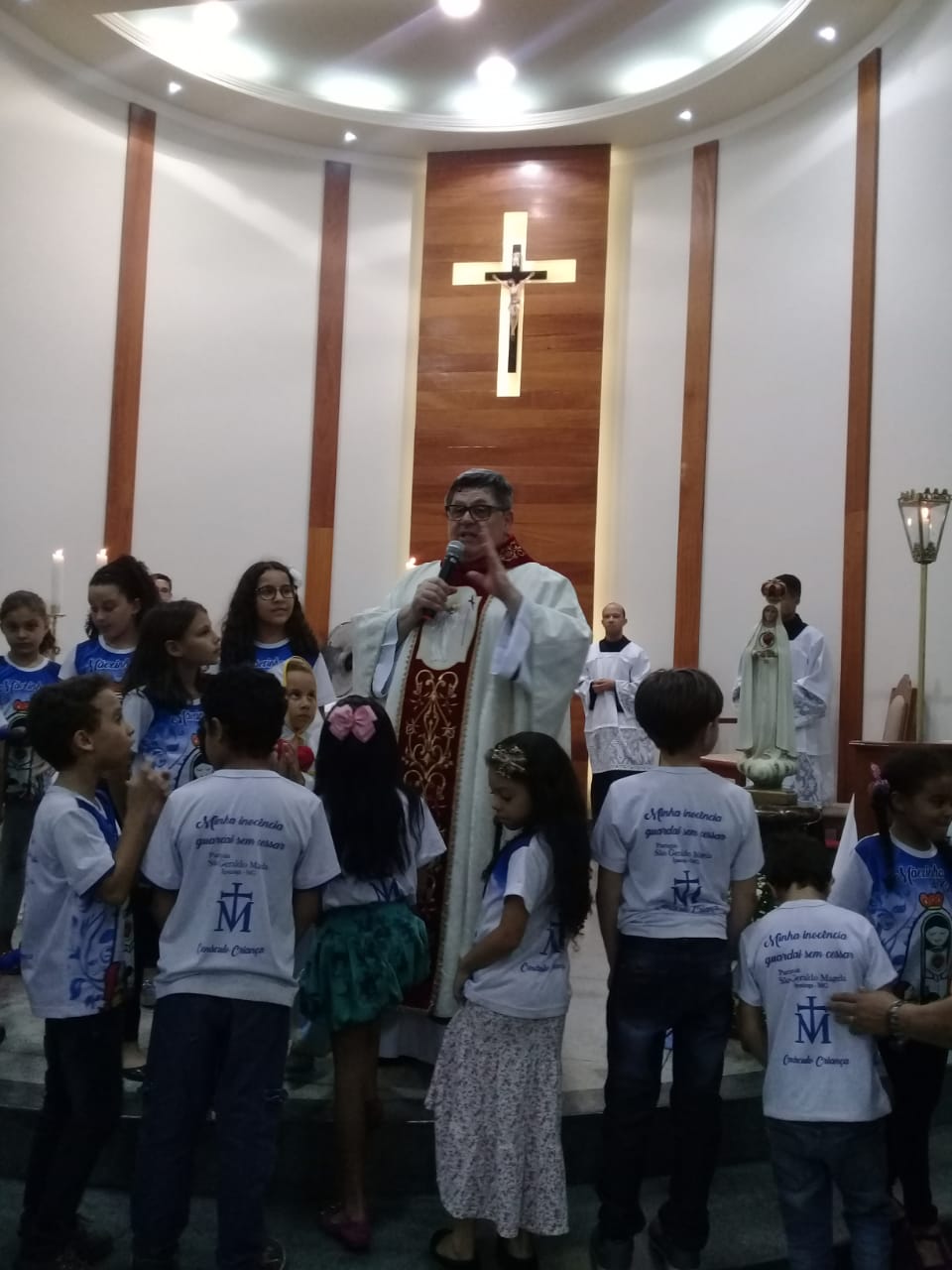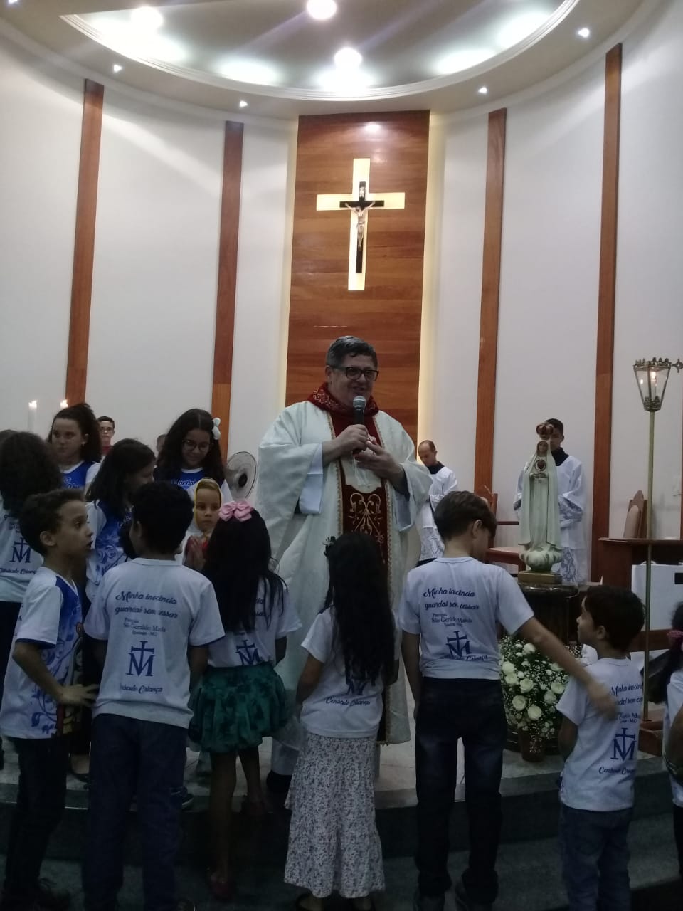Após anteceder a missa com a oração do terço as crianças do cenáculo fizeram uma homenagem a Nossa Senhora e rezaram pela vocação sacerdotal do Padre Sérgio, que muito feliz e emocionado agradeceu as orações de todos dizendo que a comunidade é a família do sacerdote.