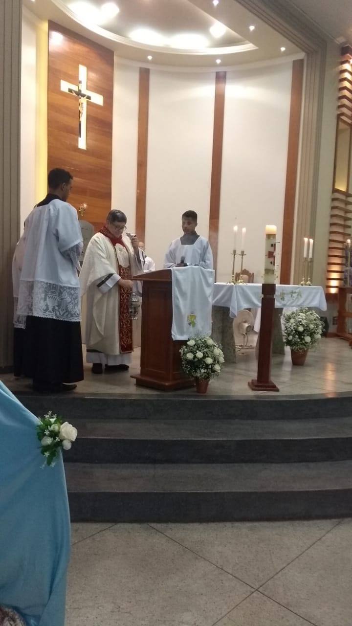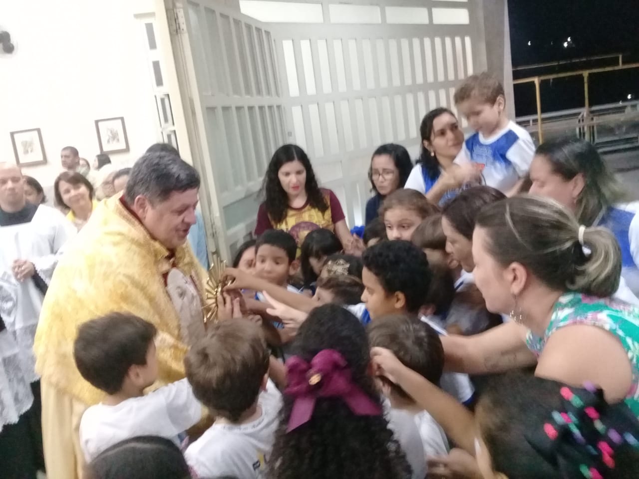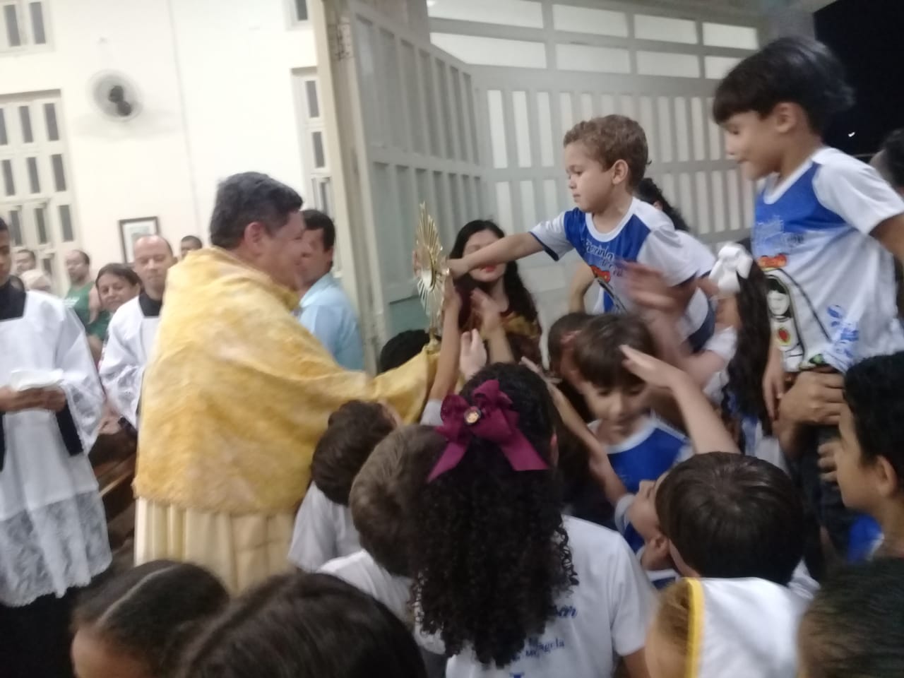 Após anteceder a missa com a oração do terço as crianças do cenáculo fizeram uma homenagem a Nossa Senhora e rezaram pela vocação sacerdotal do Padre Sérgio, que muito feliz e emocionado agradeceu as orações de todos dizendo que a comunidade é a família do sacerdote.