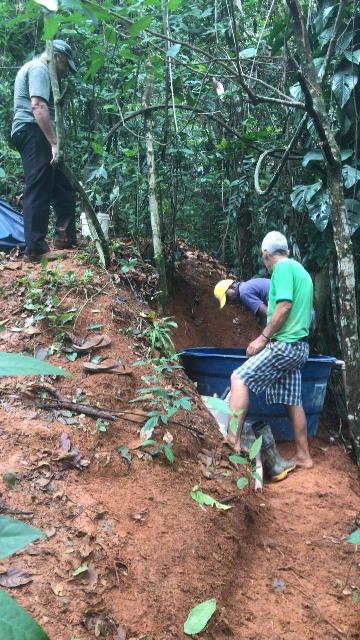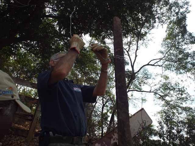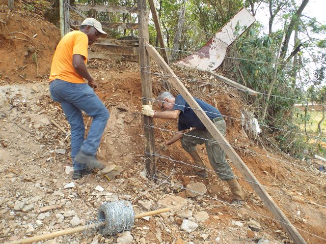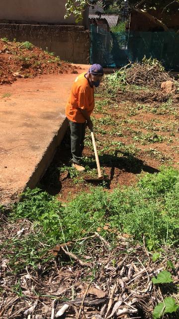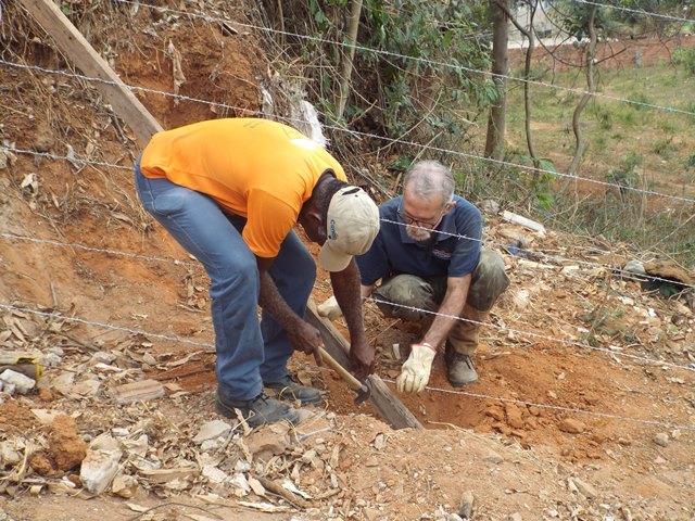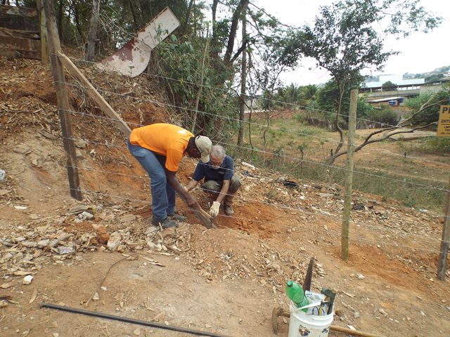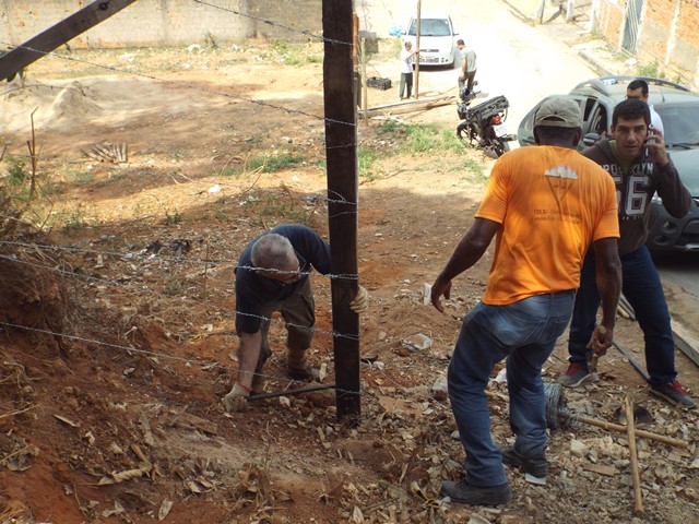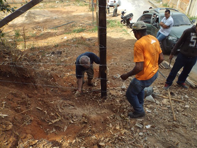 A primeira ação realizada foi refazer e fortalecer o cercamento para impedir entrada de animais e dificultar deposito de lixo no local. Feito isso, foi feita a limpeza do local utilizando roçadeira, enxadas e foices. Todo mato foi separado e utilizado como composto orgânico e o entulho retirado pela contratada da Prefeitura Municipal.