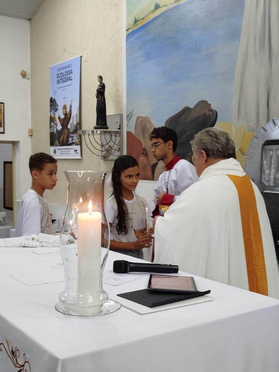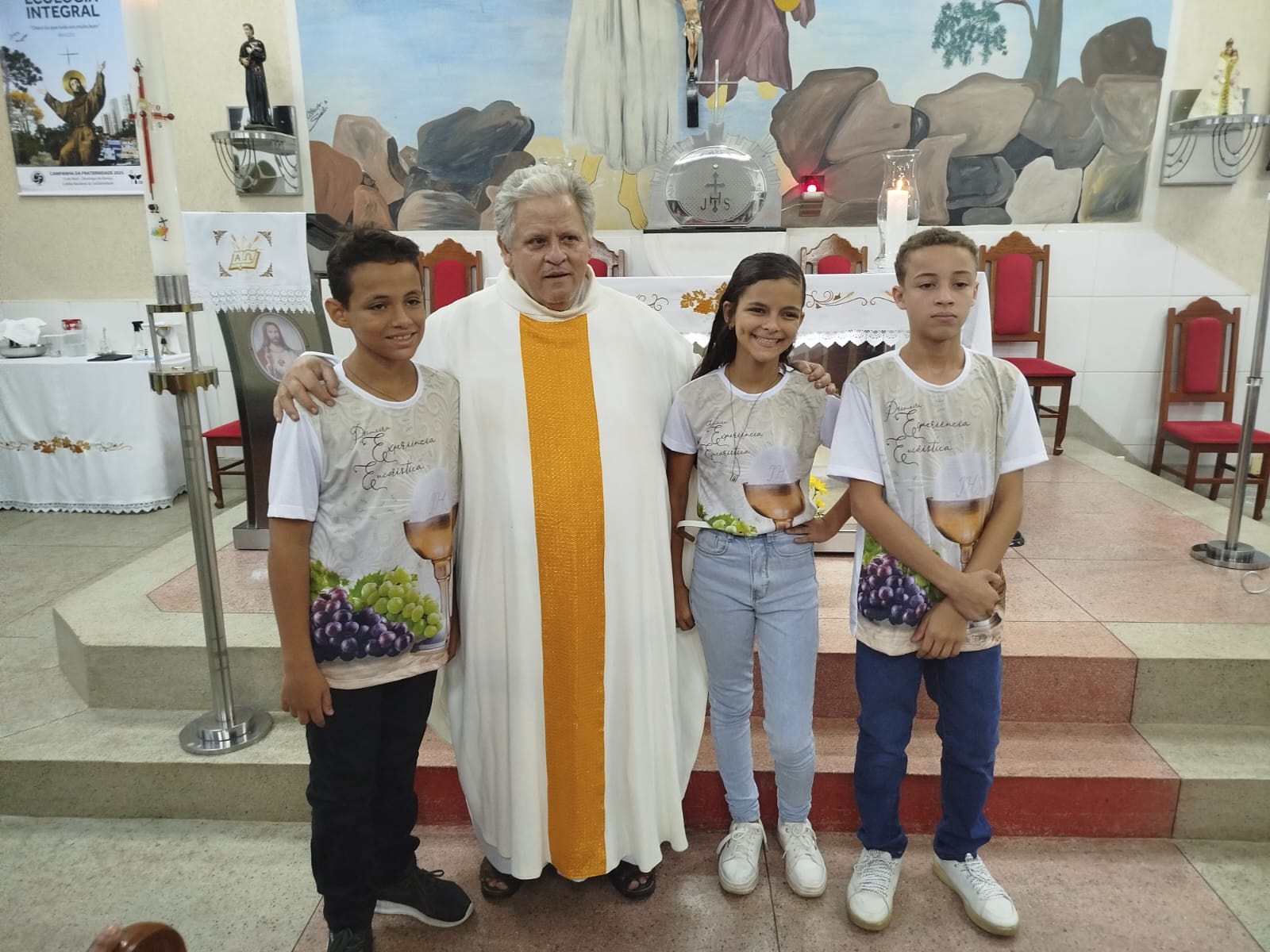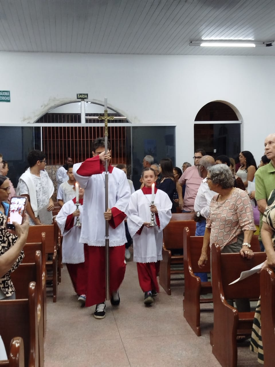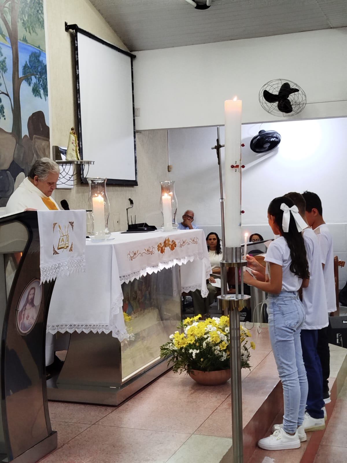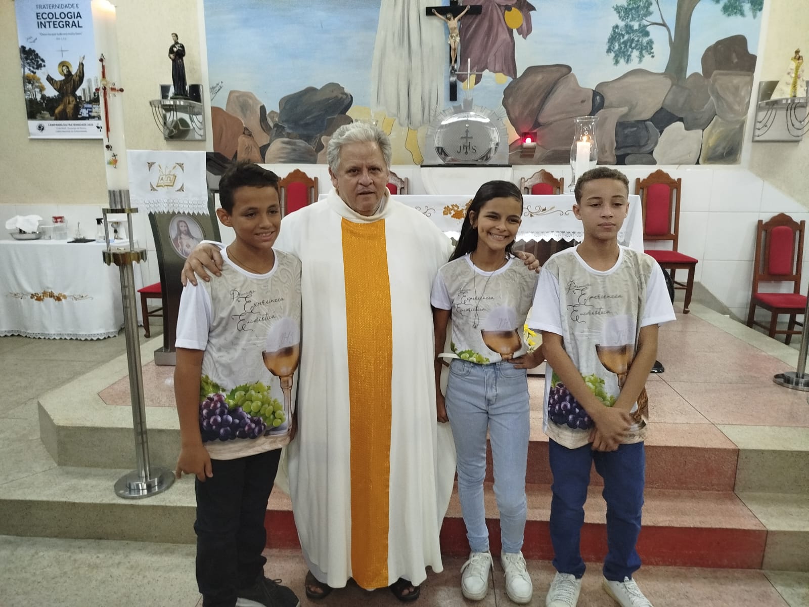 No dia 3 de maio às 18h na comunidade Maria de Nazaré situada na rua Francisca Constâncio 65 Bom jardim foi celebrada a missa da primeira eucaristia presidida pelo Pároco Pe. Aloísio Vieira, em sua reflexão ressaltou a importância desse sacramento na vida do adolescente e que essa primeira experiência seja constante na vida cristã, os catequizandos acendendo a vela no Ciro Pascal e diante de toda comunidade professaram sua fé rezando a oração do Creio, na hora da comunhão os catequizando foram até o altar e receberam Jesus eucarístico das mãos do pároco, aos catequizandos Alice Soares, Tiago dos santos, Kauã Oliveira a comunidade se sente muito alegres por mais um sacramento realizado na vida de vocês, aos familiares que Deus possa continuar iluminando para que seja exemplo e as catequistas Maria Perpétua e Gerusa Santos agrademos por acompanhar esses adolescentes e contribuir para a formação cristã de cada um deles e esperamos que a caminhada desses adolescentes possam chegam até ao sacramento da crisma para finalizar esse processo da catequese que faz com que os jovens possam ter a maturidade cristã e fazer parte da vida da comunidade.