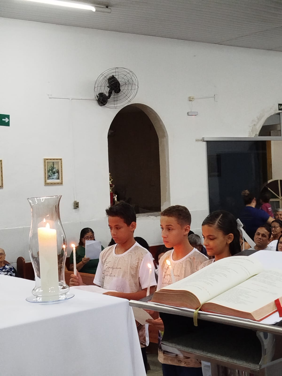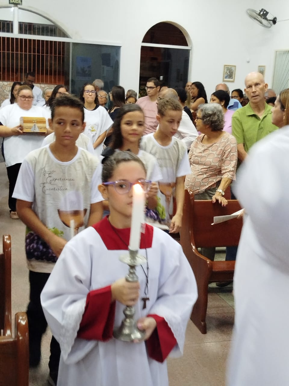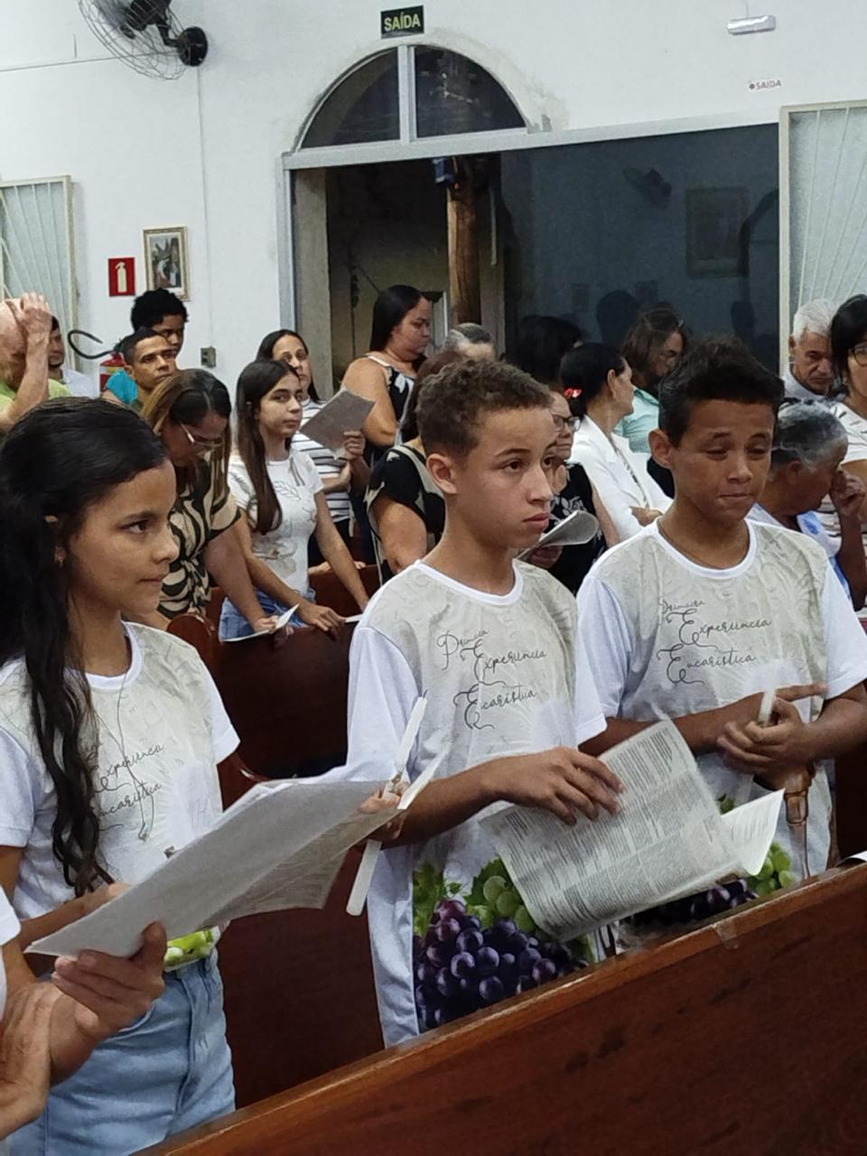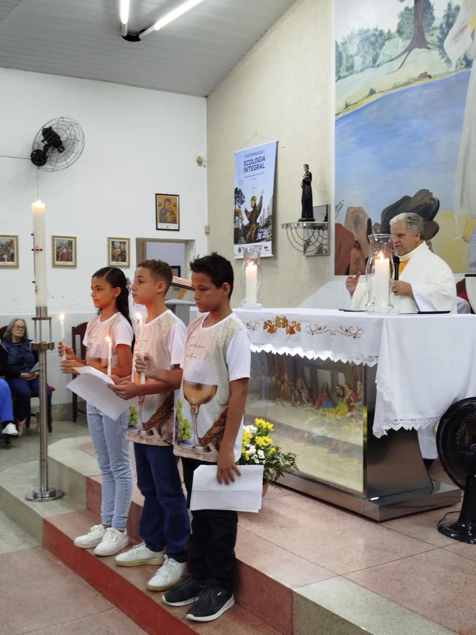 No dia 3 de maio às 18h na comunidade Maria de Nazaré situada na rua Francisca Constâncio 65 Bom jardim foi celebrada a missa da primeira eucaristia presidida pelo Pároco Pe. Aloísio Vieira, em sua reflexão ressaltou a importância desse sacramento na vida do adolescente e que essa primeira experiência seja constante na vida cristã, os catequizandos acendendo a vela no Ciro Pascal e diante de toda comunidade professaram sua fé rezando a oração do Creio, na hora da comunhão os catequizando foram até o altar e receberam Jesus eucarístico das mãos do pároco, aos catequizandos Alice Soares, Tiago dos santos, Kauã Oliveira a comunidade se sente muito alegres por mais um sacramento realizado na vida de vocês, aos familiares que Deus possa continuar iluminando para que seja exemplo e as catequistas Maria Perpétua e Gerusa Santos agrademos por acompanhar esses adolescentes e contribuir para a formação cristã de cada um deles e esperamos que a caminhada desses adolescentes possam chegam até ao sacramento da crisma para finalizar esse processo da catequese que faz com que os jovens possam ter a maturidade cristã e fazer parte da vida da comunidade.