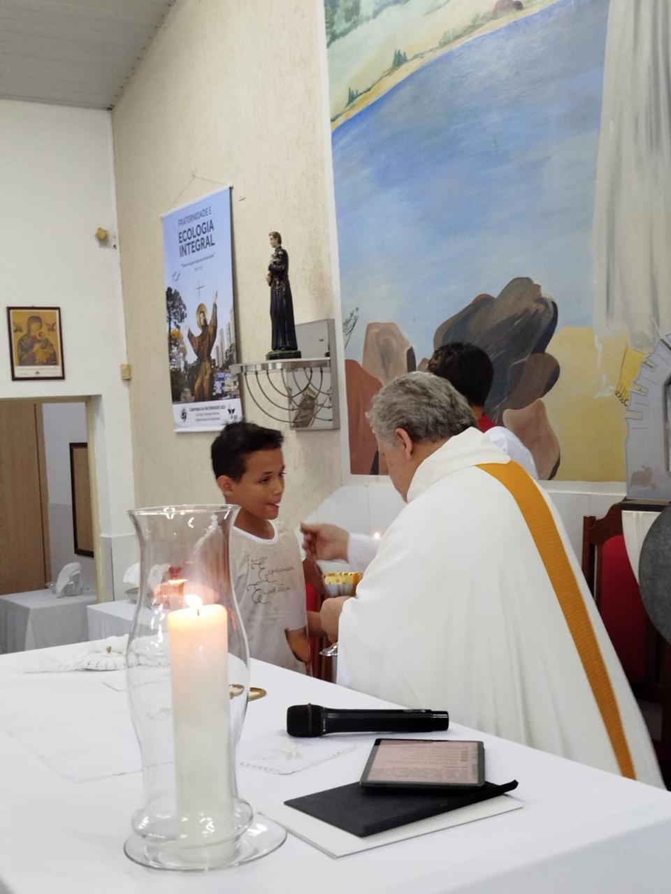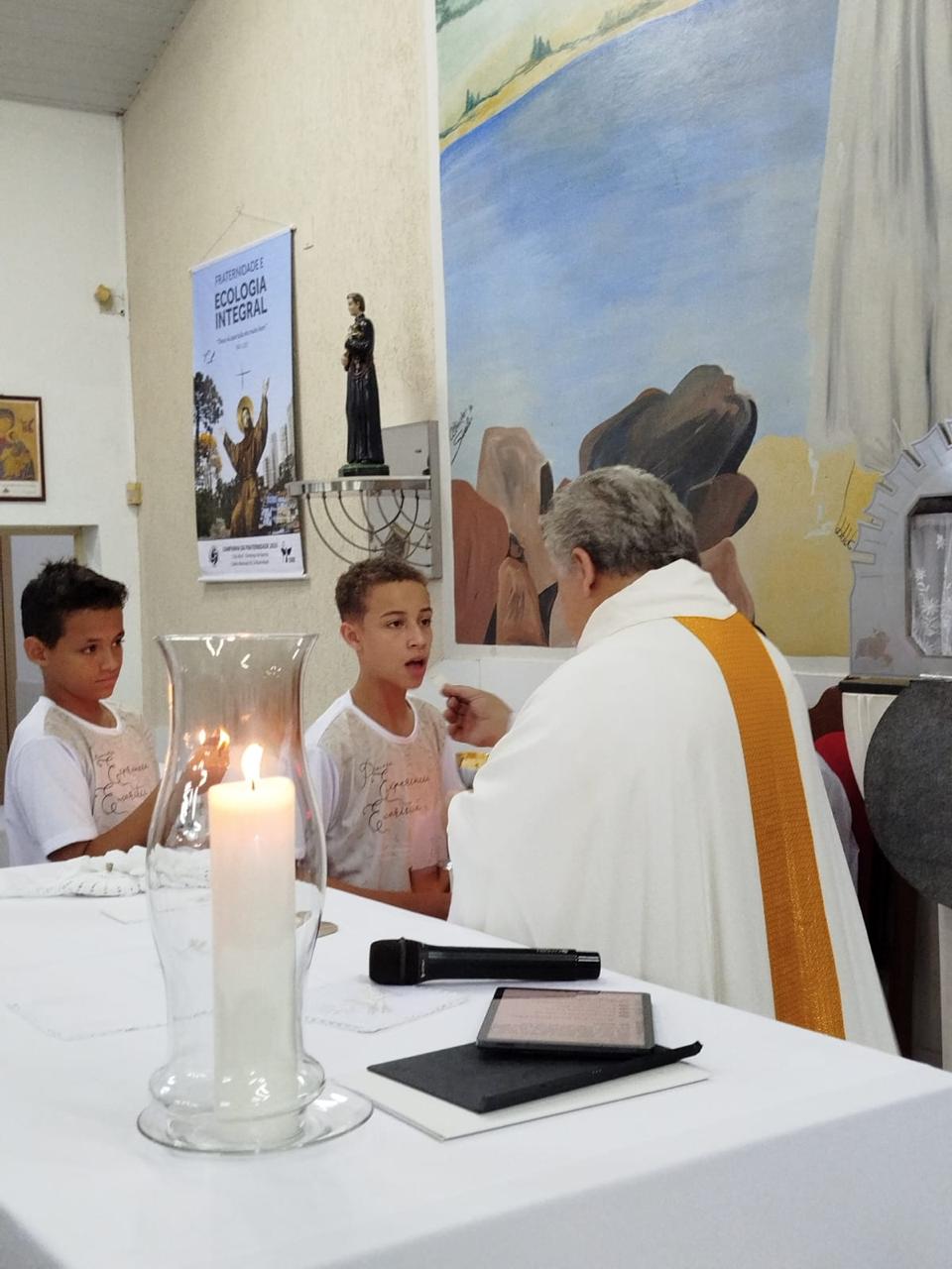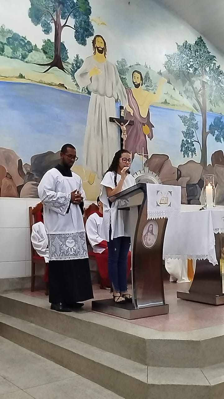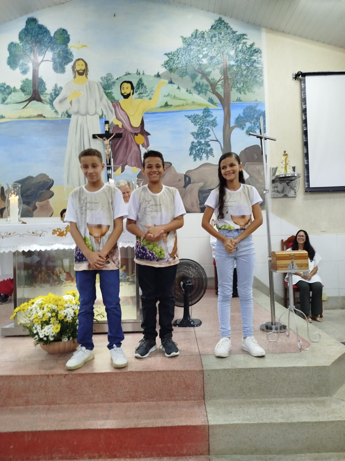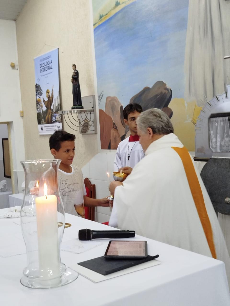 No dia 3 de maio às 18h na comunidade Maria de Nazaré situada na rua Francisca Constâncio 65 Bom jardim foi celebrada a missa da primeira eucaristia presidida pelo Pároco Pe. Aloísio Vieira, em sua reflexão ressaltou a importância desse sacramento na vida do adolescente e que essa primeira experiência seja constante na vida cristã, os catequizandos acendendo a vela no Ciro Pascal e diante de toda comunidade professaram sua fé rezando a oração do Creio, na hora da comunhão os catequizando foram até o altar e receberam Jesus eucarístico das mãos do pároco, aos catequizandos Alice Soares, Tiago dos santos, Kauã Oliveira a comunidade se sente muito alegres por mais um sacramento realizado na vida de vocês, aos familiares que Deus possa continuar iluminando para que seja exemplo e as catequistas Maria Perpétua e Gerusa Santos agrademos por acompanhar esses adolescentes e contribuir para a formação cristã de cada um deles e esperamos que a caminhada desses adolescentes possam chegam até ao sacramento da crisma para finalizar esse processo da catequese que faz com que os jovens possam ter a maturidade cristã e fazer parte da vida da comunidade.