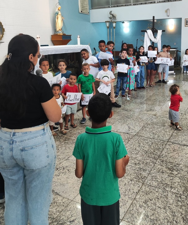 A celebração com as Crianças é uma iniciativa promovida em conjunto entre Liturgia e Catequese. O momento busca proporcionar às crianças uma participação ativa e compreensível na liturgia dominical, respeitando sempre o tempo litúrgico. A celebração seguiu a liturgia do dia, o 4° Domingo da Páscoa, conhecido como o Domingo do Bom Pastor.