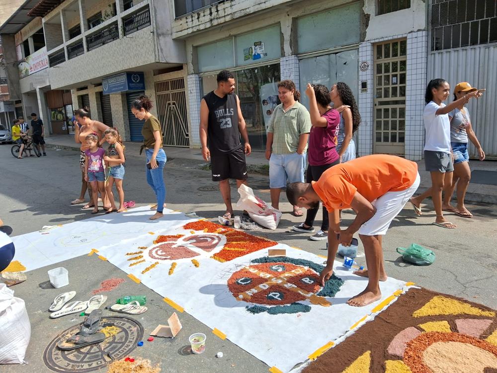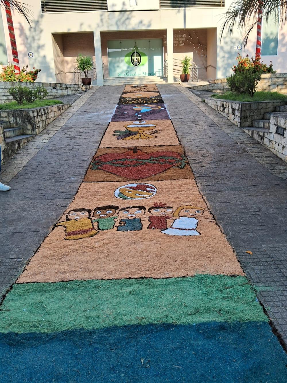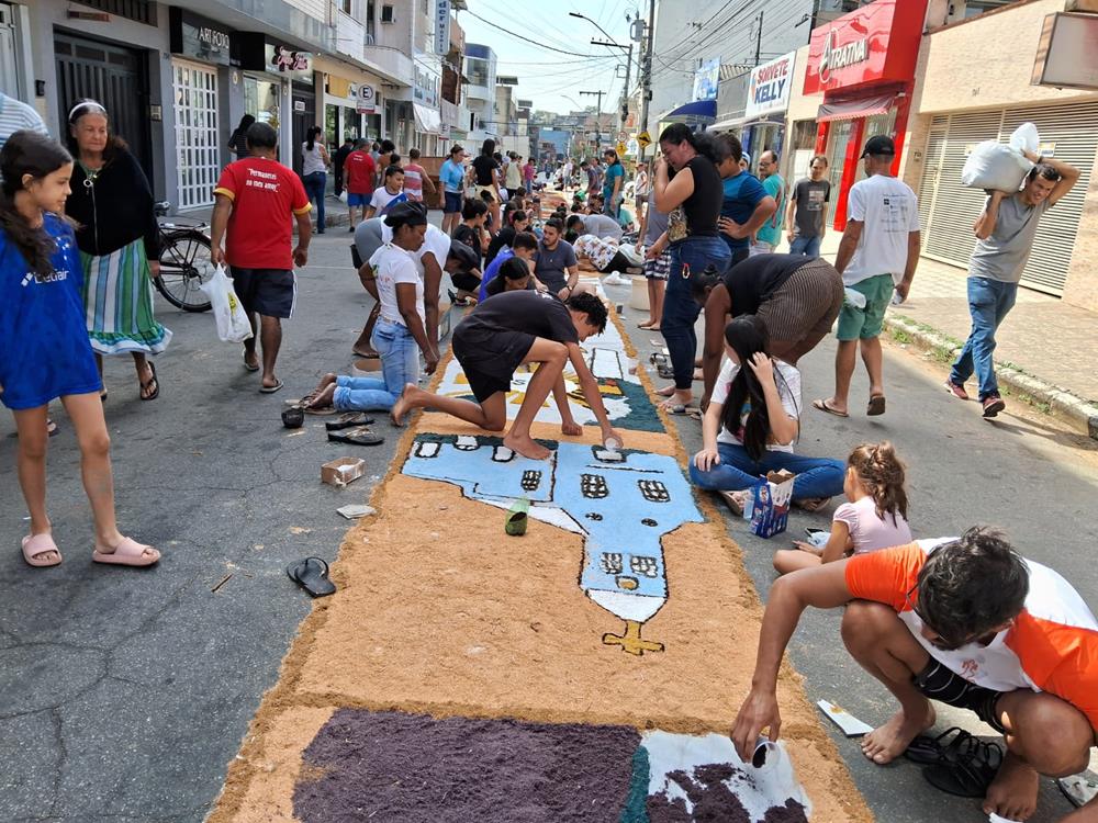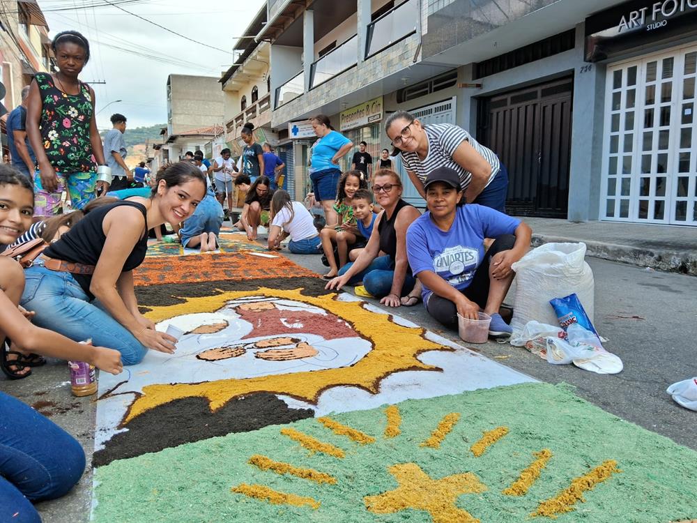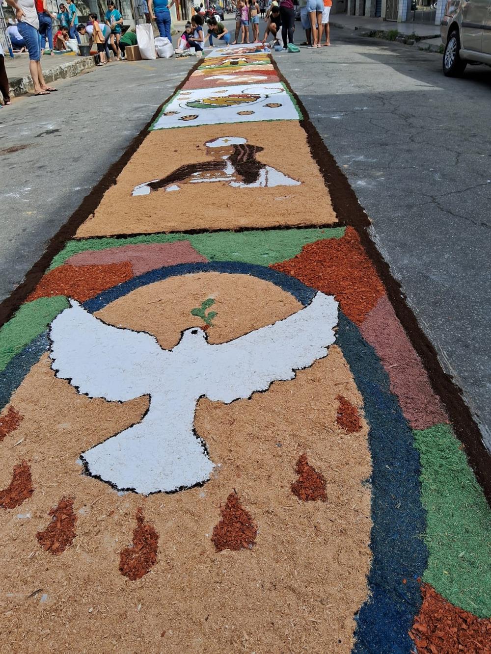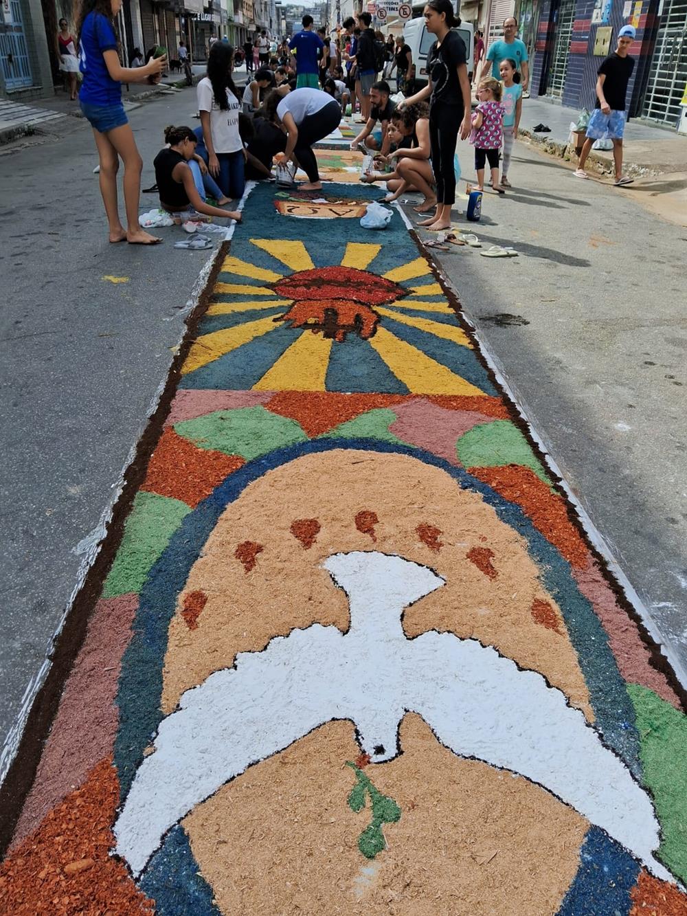 Adultos, crianças, jovens e famílias completas, estiveram a serviço de suas respectivas comunidades, para confeccionarem os tapetes para festa de Corpus Christi. De uma maneira organizada, cada tapete era concluído com alegria pelas equipes.