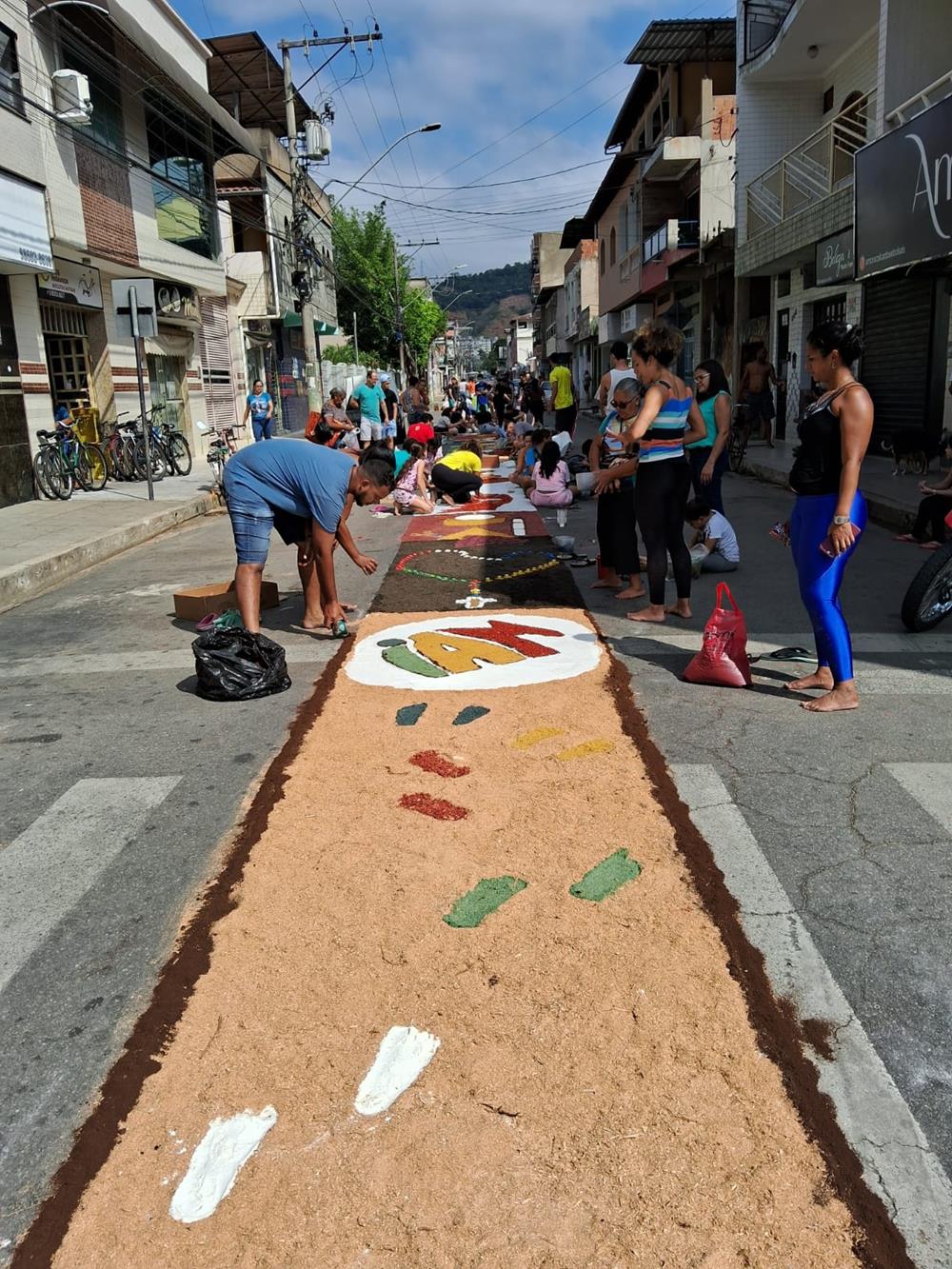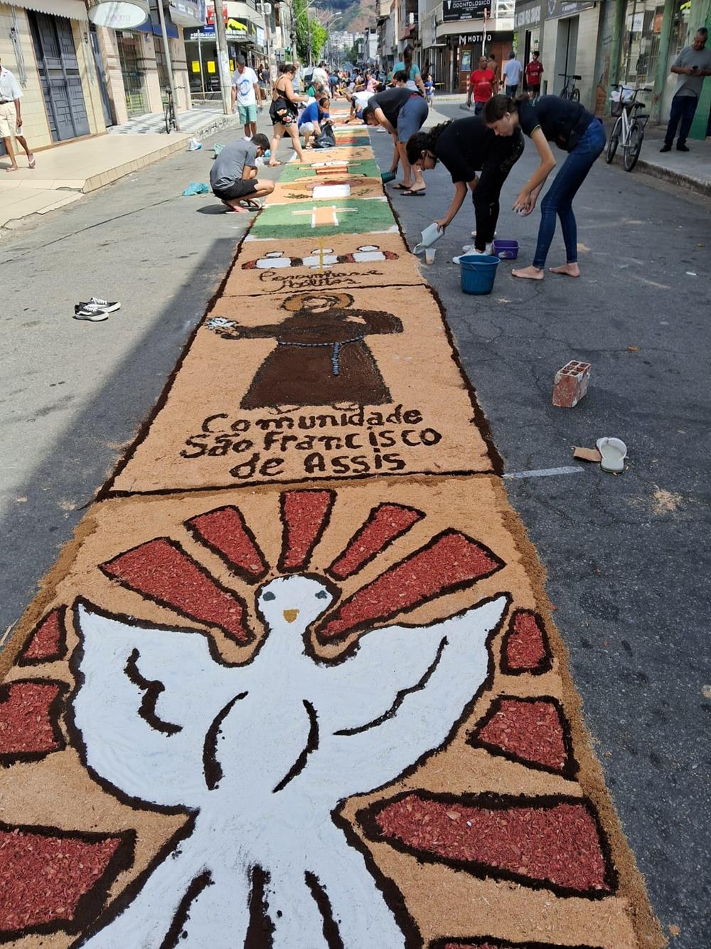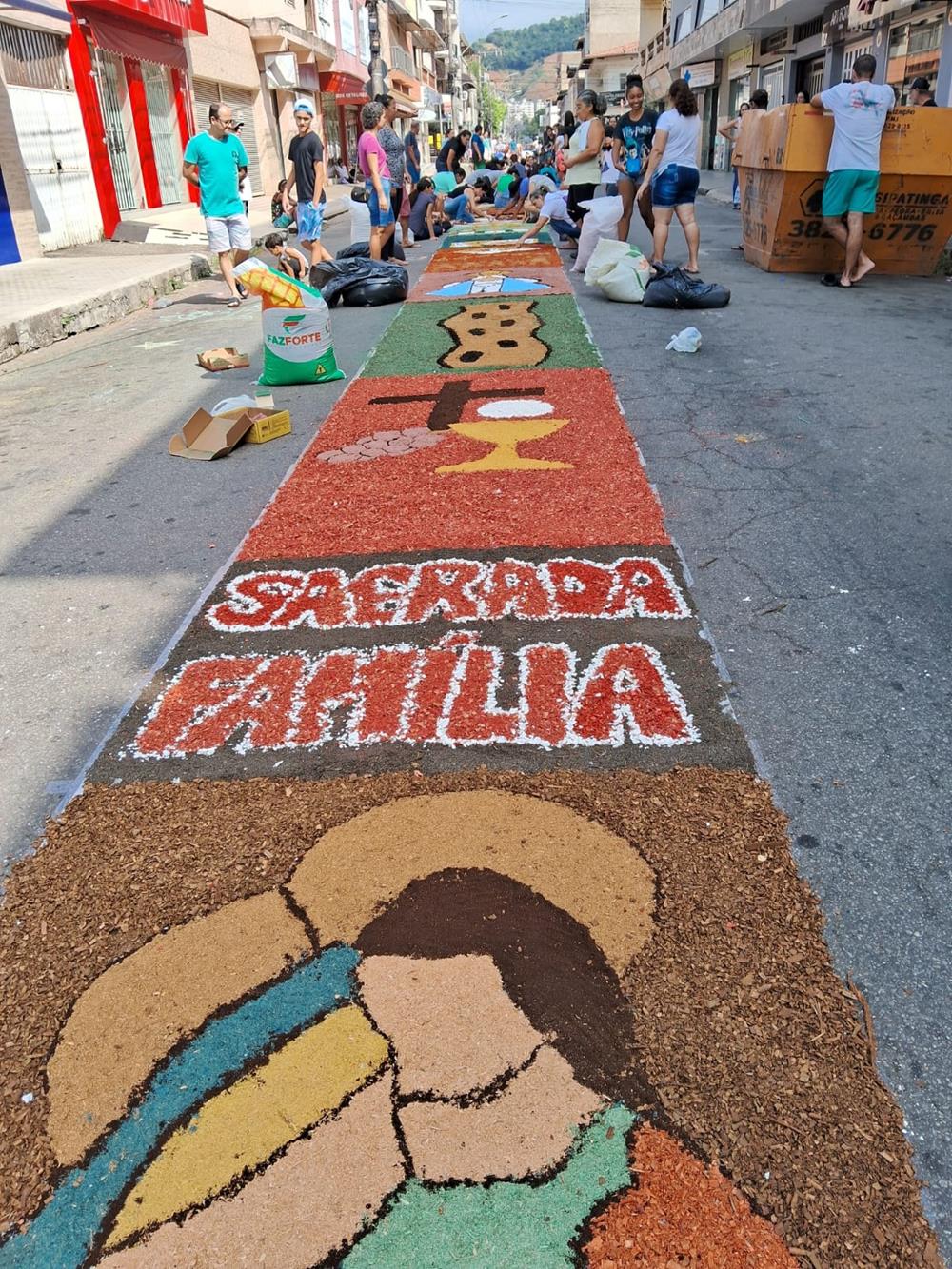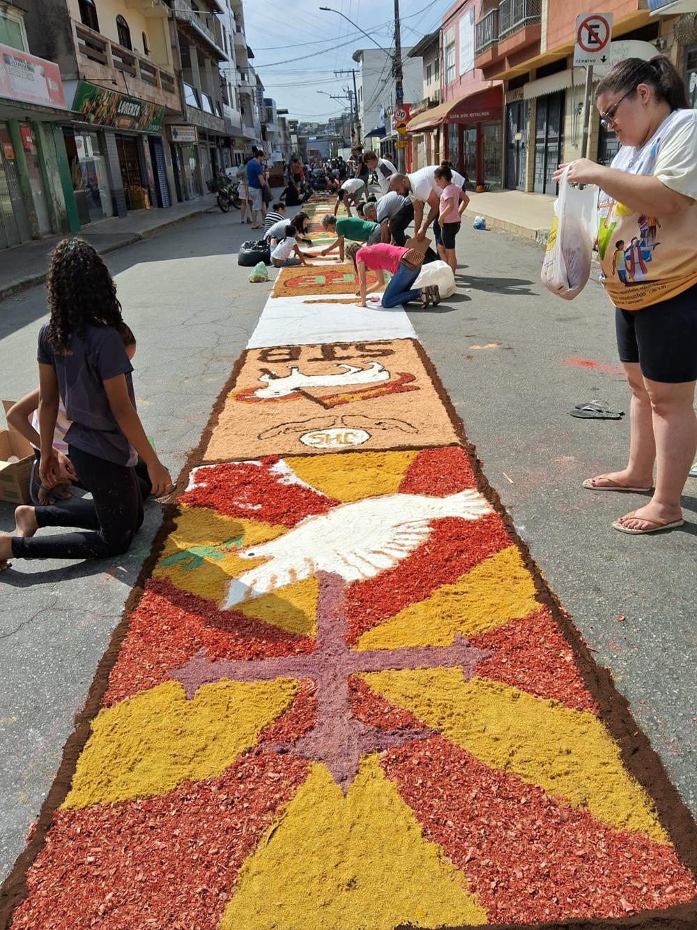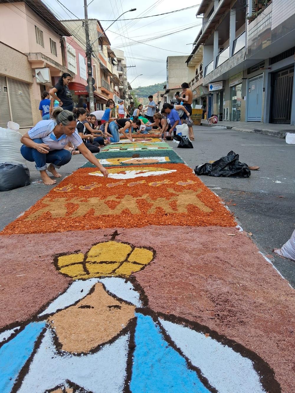 Adultos, crianças, jovens e famílias completas, estiveram a serviço de suas respectivas comunidades, para confeccionarem os tapetes para festa de Corpus Christi. De uma maneira organizada, cada tapete era concluído com alegria pelas equipes.