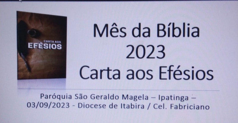 Foi realizado dia 03/09/23 na paróquia São Geraldo Magela, que fica localizada na Av. das Flores, número 885, Centro Pastoral São João Paulo II a formação do estudo do mês da Bíblia, que nos vem falar sobre o livro de Efésios. Tendo como palestrante Adenildes Souza do COMIDI. Contamos também com a presença do nosso pároco padre Aloísio Vieira.
