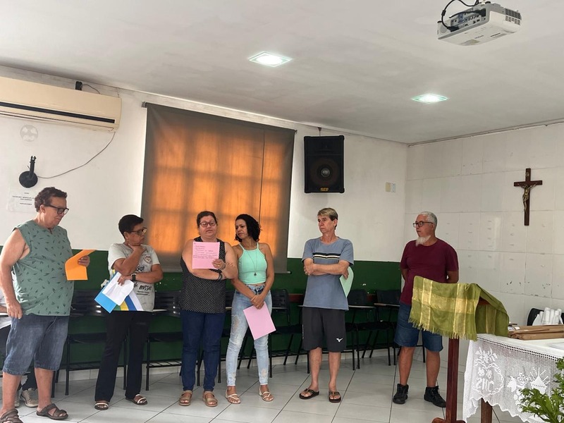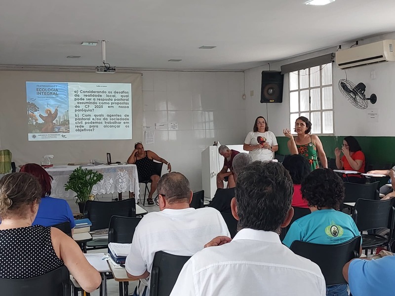 Durante o encontro, aconteceu os trabalhos em grupos, onde as pessoas debateram na parte da manhã: a) Quais os dois maiores problemas socioambientais dos últimos 10 anos? b) Qual a maior dificuldade para mudar essa realidade? A tarde refletiu: a) Considerando os desafios da realidade local, qual pode ser a resposta pastoral assumindo como propostas da CF 2025 na Paróquia? b) Com quais Agentes de Pastoral ou da sociedade civil podemos trabalhar em rede para alcançar os objetivos?