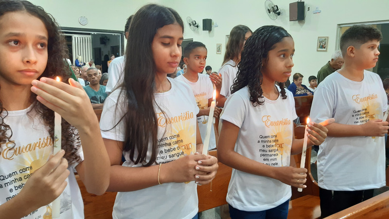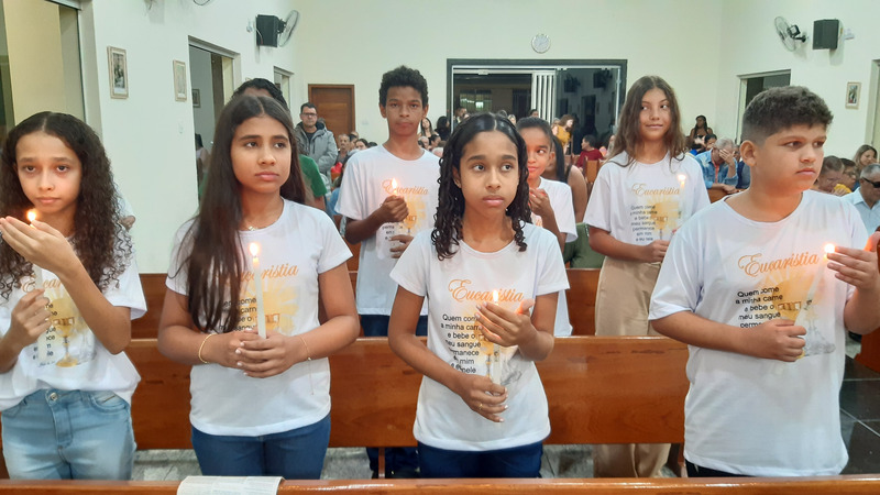 Durante sua reflexão, dirigindo-se aos catequizandos, padre Aloísio falou que a “Eucaristia é uma palavra grega que significa “dar graças” ou “agradecer”. Esta palavra ganhou um significado novo e profundo quando os cristãos passaram a chamar de “Eucaristia” a Última Ceia celebrada por Jesus. Isto aconteceu porque nesta ceia Jesus “deu graças a Deus” e se entregou total e gratuitamente por amor à humanidade”.