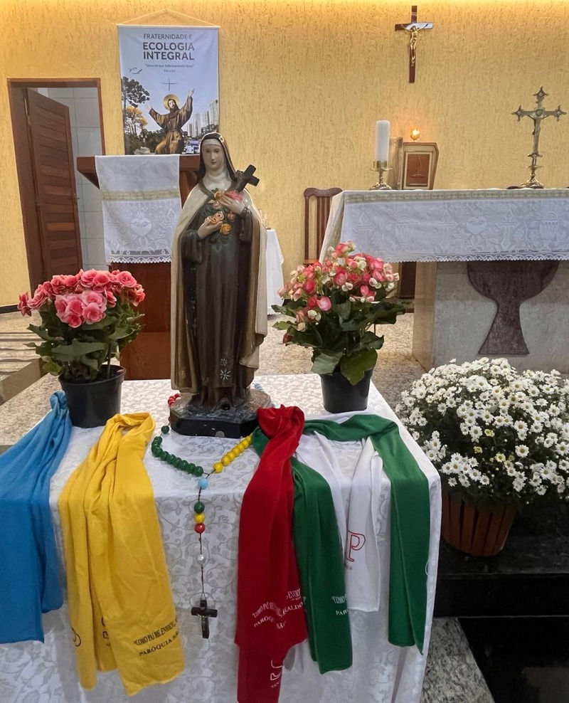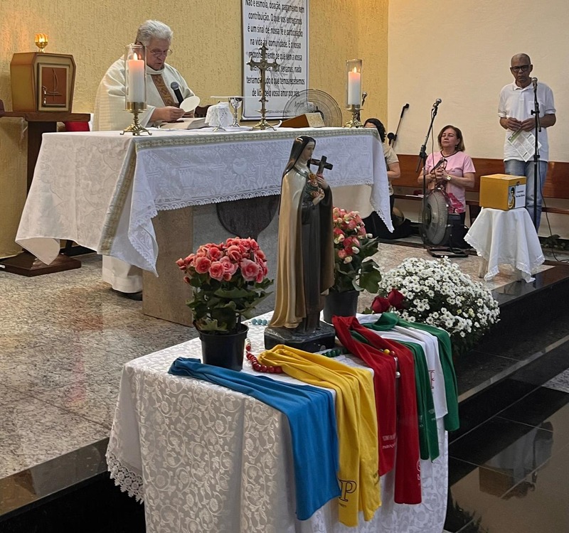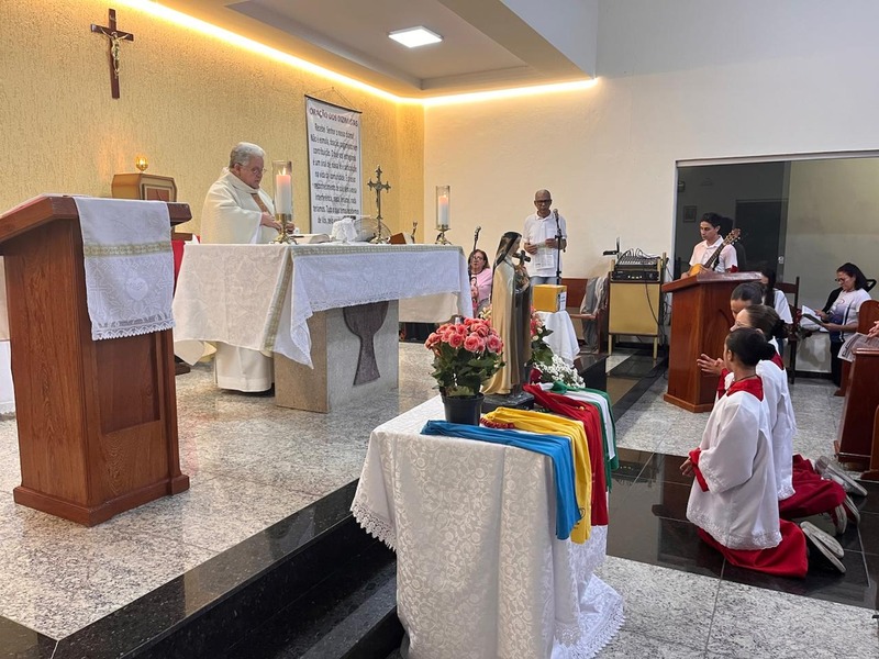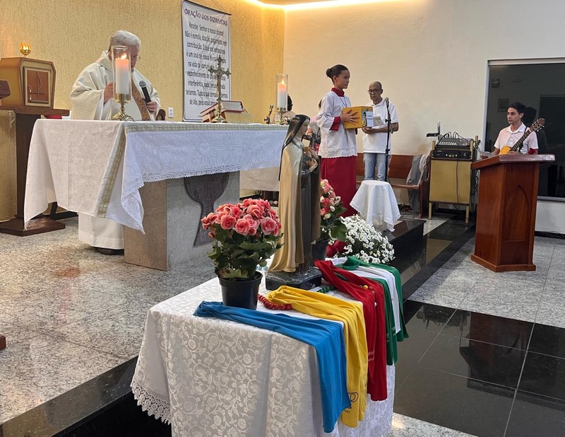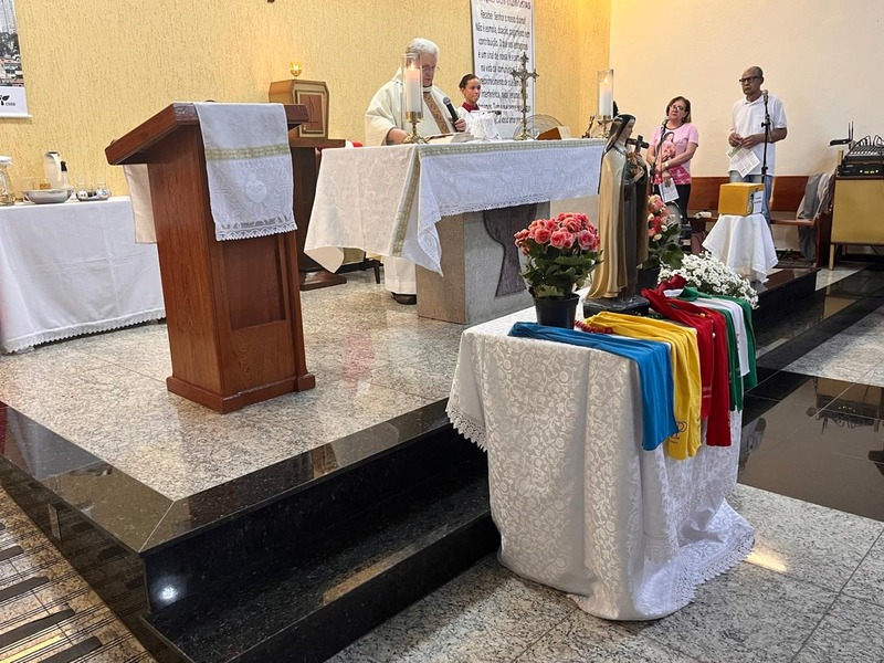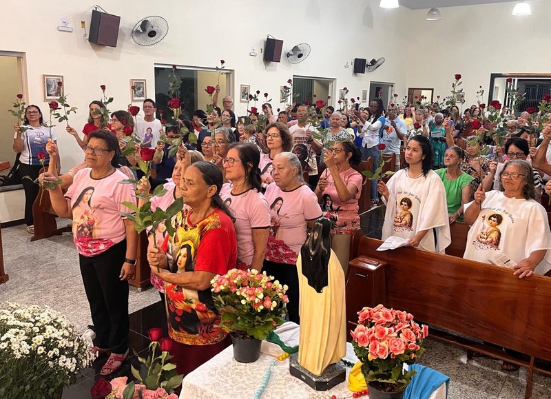 Santa das Rosas, é por causa de sua promessa de fazer cair uma chuva de rosas sobre o mundo após a morte, que é um sinal visível de suas graças e intercessão a Deus para os fiéis que pedem orações. A Santa Missa foi presidida pelo Pároco Padre Aloísio Vieira, que se deu início ao mês Missionário com o tema: “Santa Terezinha, somos Missionários da Esperança”.