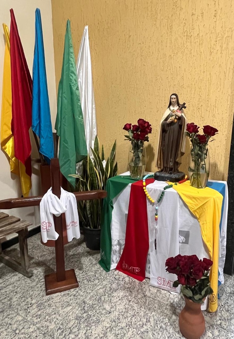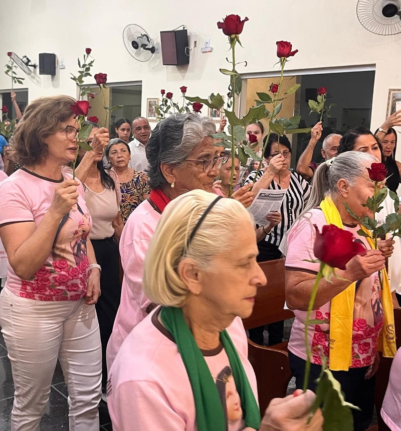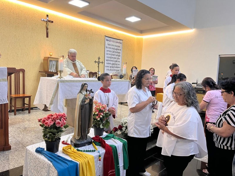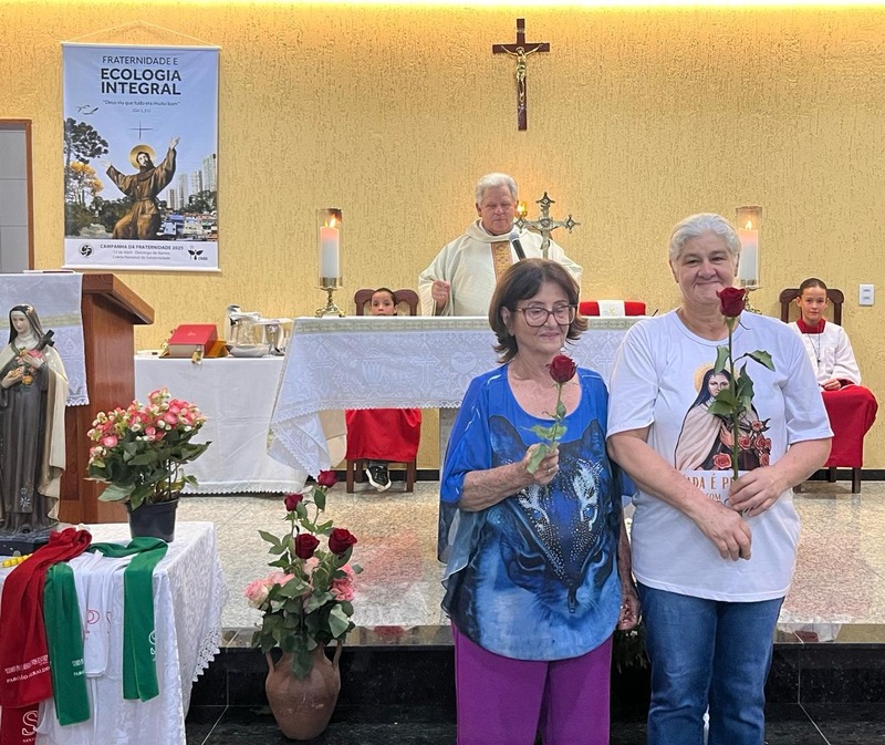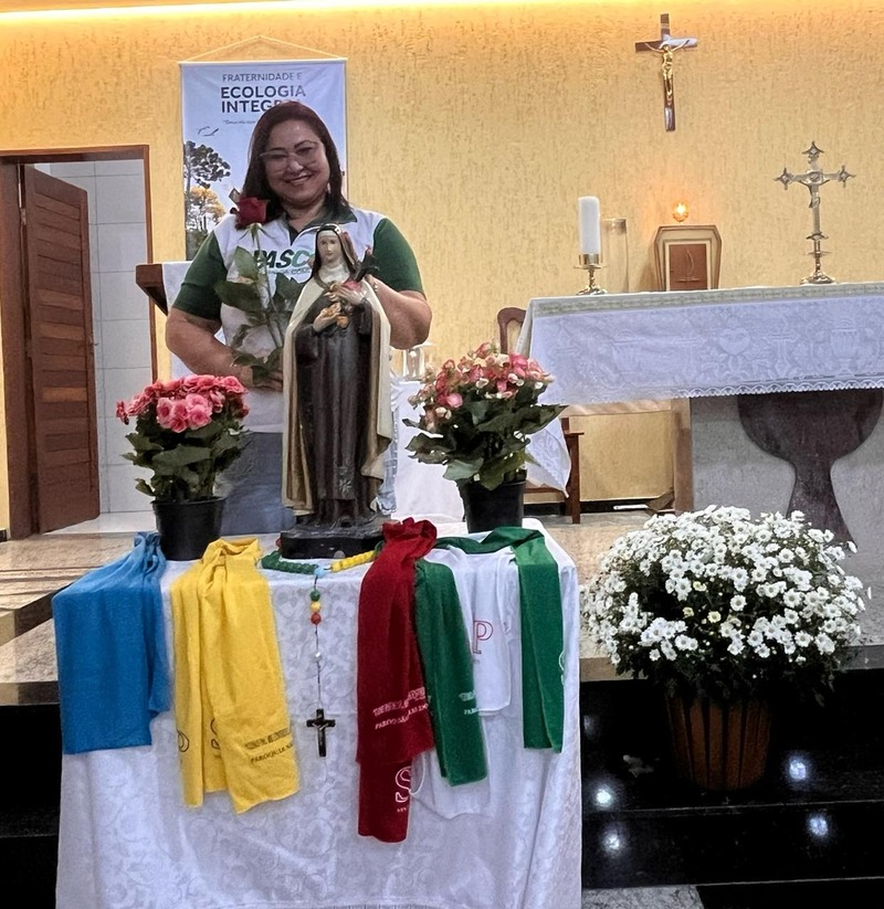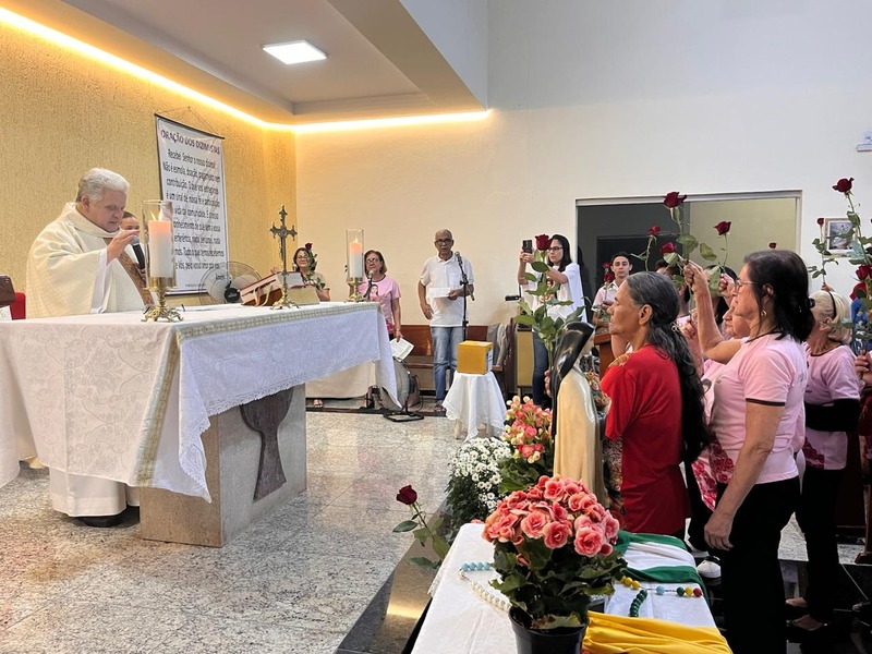 Santa das Rosas, é por causa de sua promessa de fazer cair uma chuva de rosas sobre o mundo após a morte, que é um sinal visível de suas graças e intercessão a Deus para os fiéis que pedem orações. A Santa Missa foi presidida pelo Pároco Padre Aloísio Vieira, que se deu início ao mês Missionário com o tema: “Santa Terezinha, somos Missionários da Esperança”.