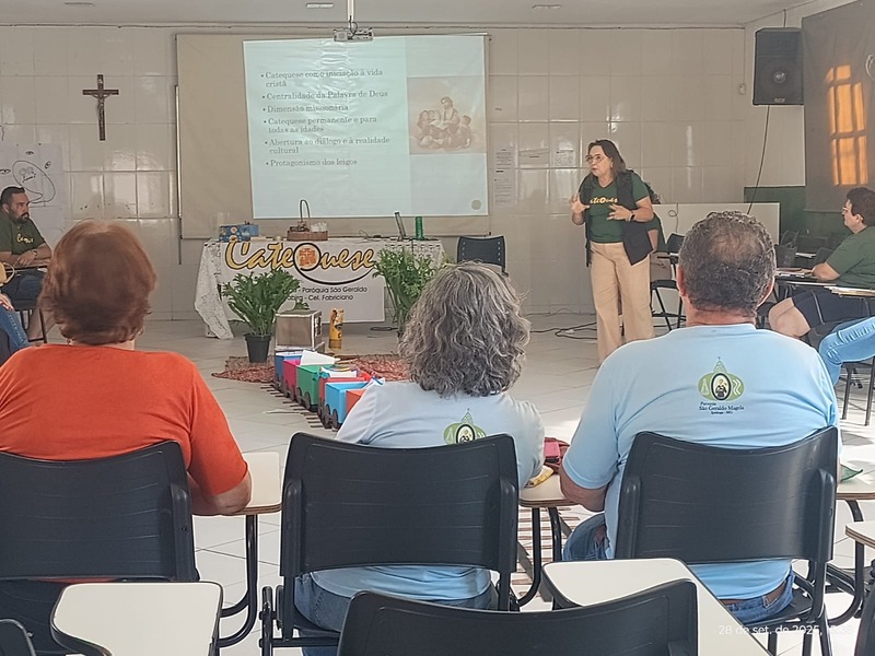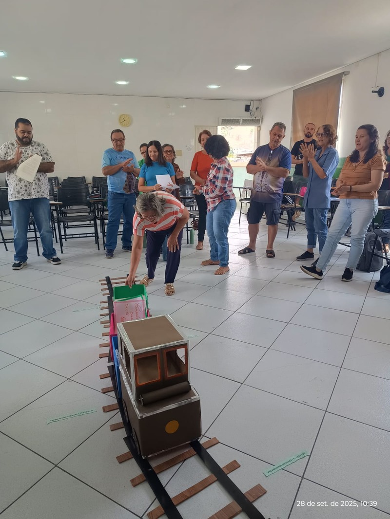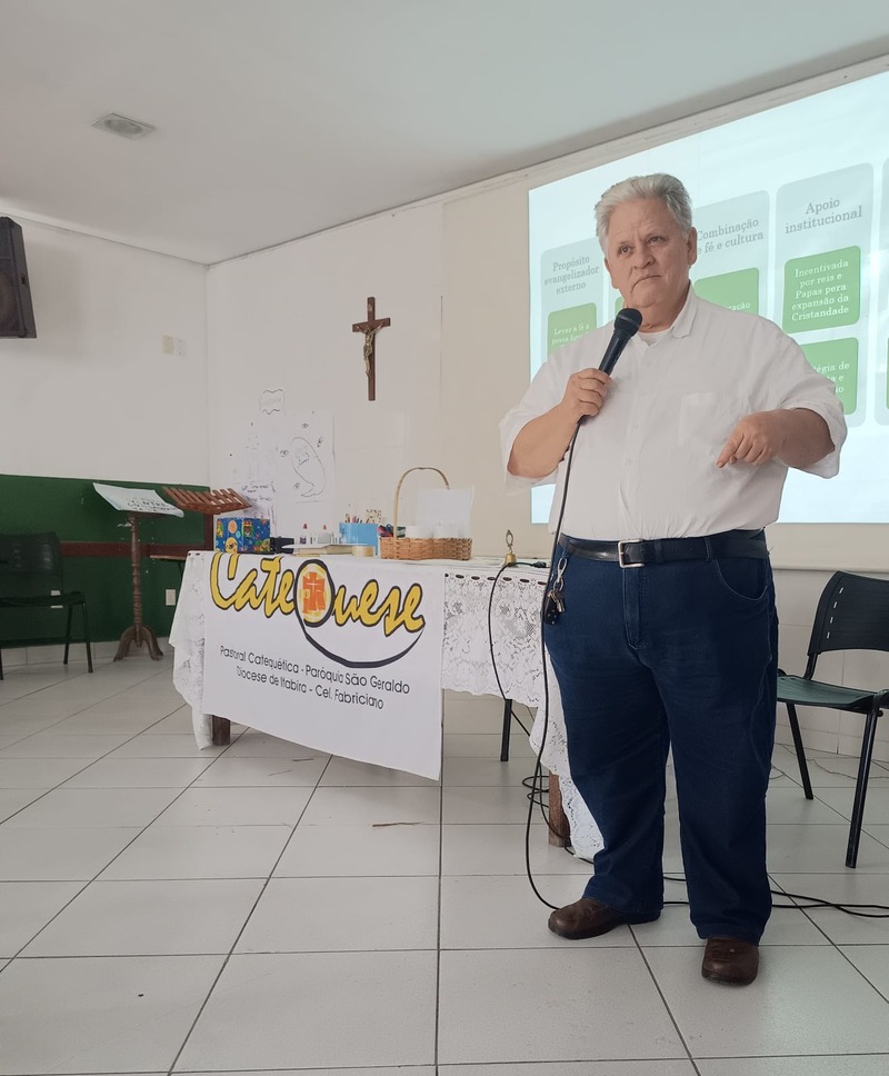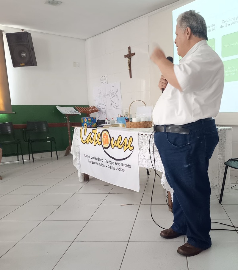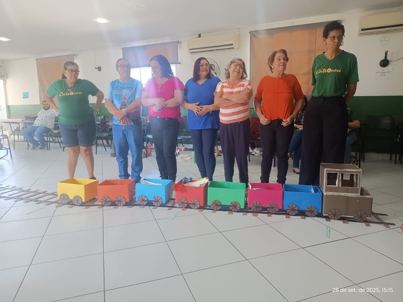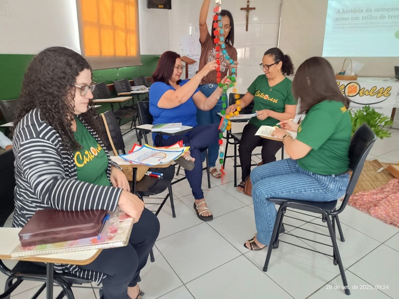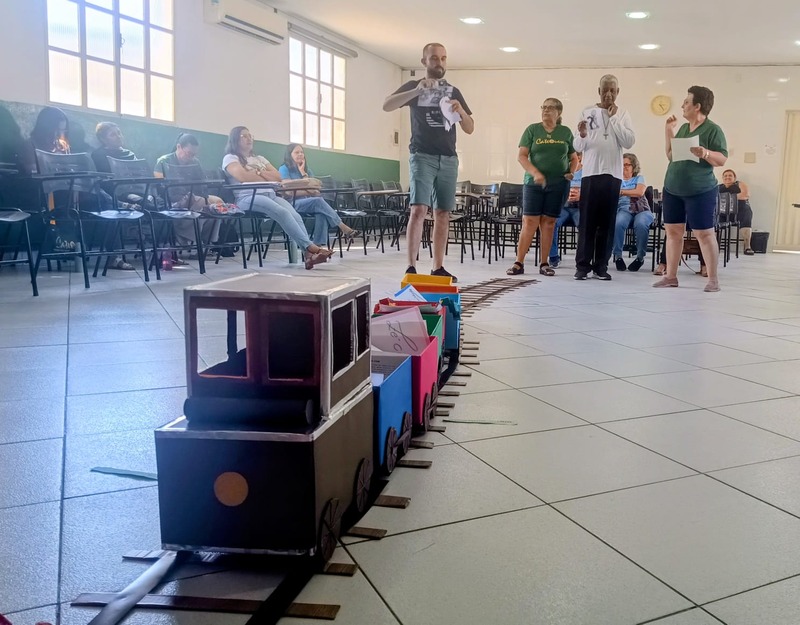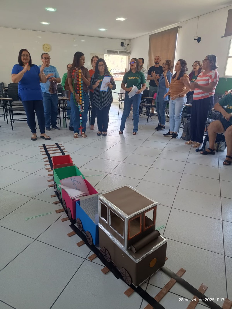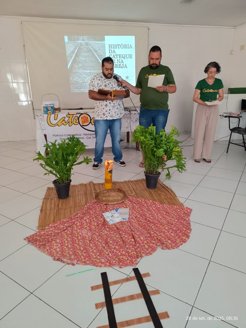 Aconteceu na manhã de domingo, dia 28 de setembro de 2025 a formação para a Catequese. Os Catequistas foram convidados para uma viagem pela história da catequese onde cada tempo é uma parada, cada estação um aprendizado, e o destino é Jesus Cristo. A história da Catequese é como um trilho de trem, onde cada época foi uma estação diferente, mas o destino é o mesmo, que é levar cada pessoa ao encontro com Cristo.