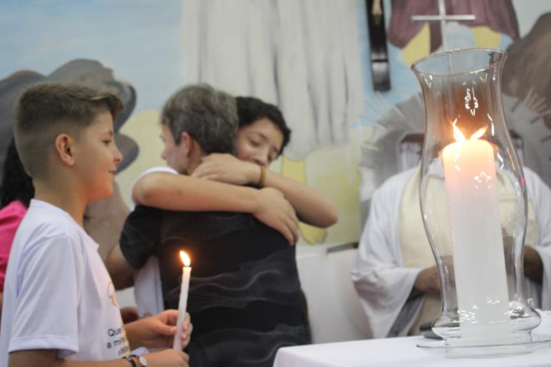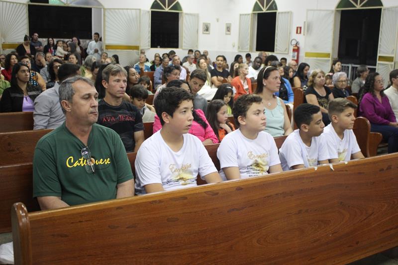 Em sua reflexão, Padre Morini falou que a Eucaristia é como uma mãe que gesta o seu filho no seu ventre. Assim é com Jesus, que nos permite sermos gestados na Eucaristia. O grande momento dessa Missa é quando os catequizandos recebem a Eucaristia, e estes, a receberam das mãos dos seus pais, mostrando a importância da família.
