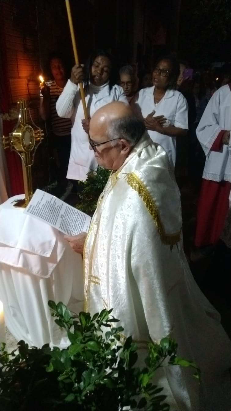 A missa, que foi presidida pelo Pároco Aloisio e contou com a participação do Diácono Rogerio, teve inicio as 17hs. Nem mesmo o frio, abalou a fé de diversos fieis, crianças, jovens, adultos e até mesmo idosos lotaram o local. Em sua homilia, o Pároco explicou aos fies a importância da Eucaristia “corpo e sangue de Cristo” de forma detalhada: o que significa receber a comunhão, a forma correta de se comungar.