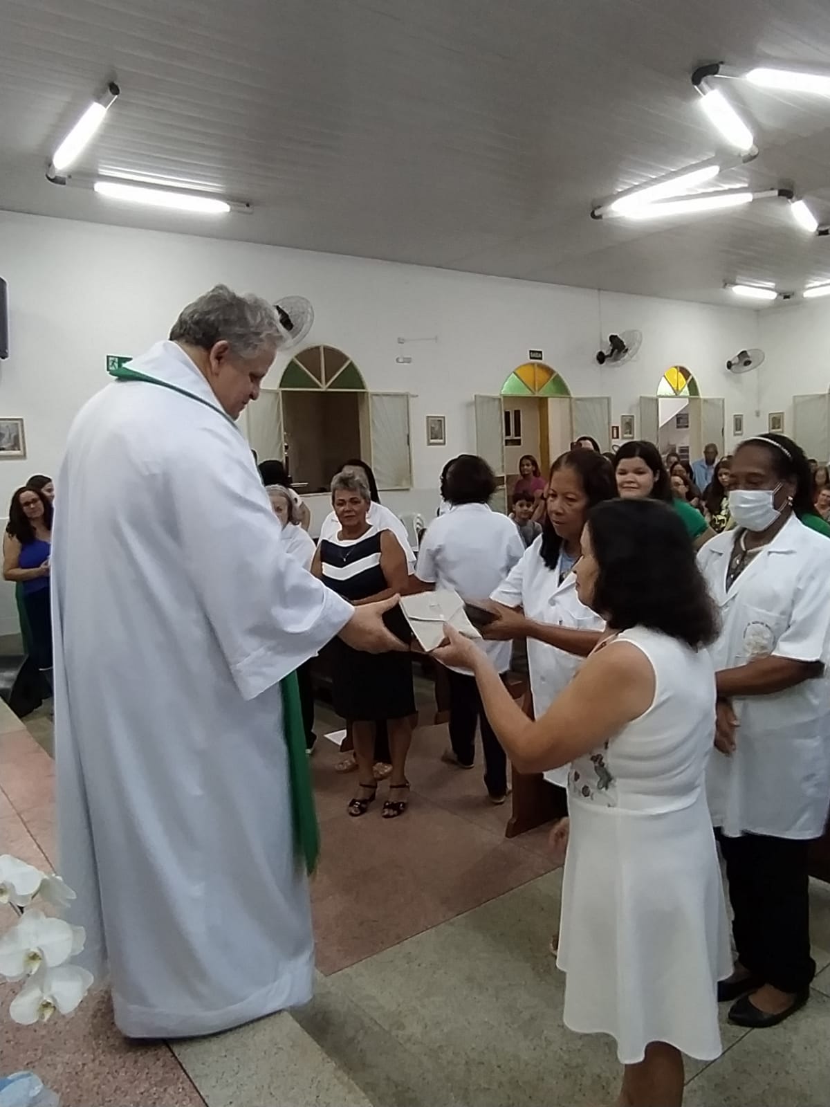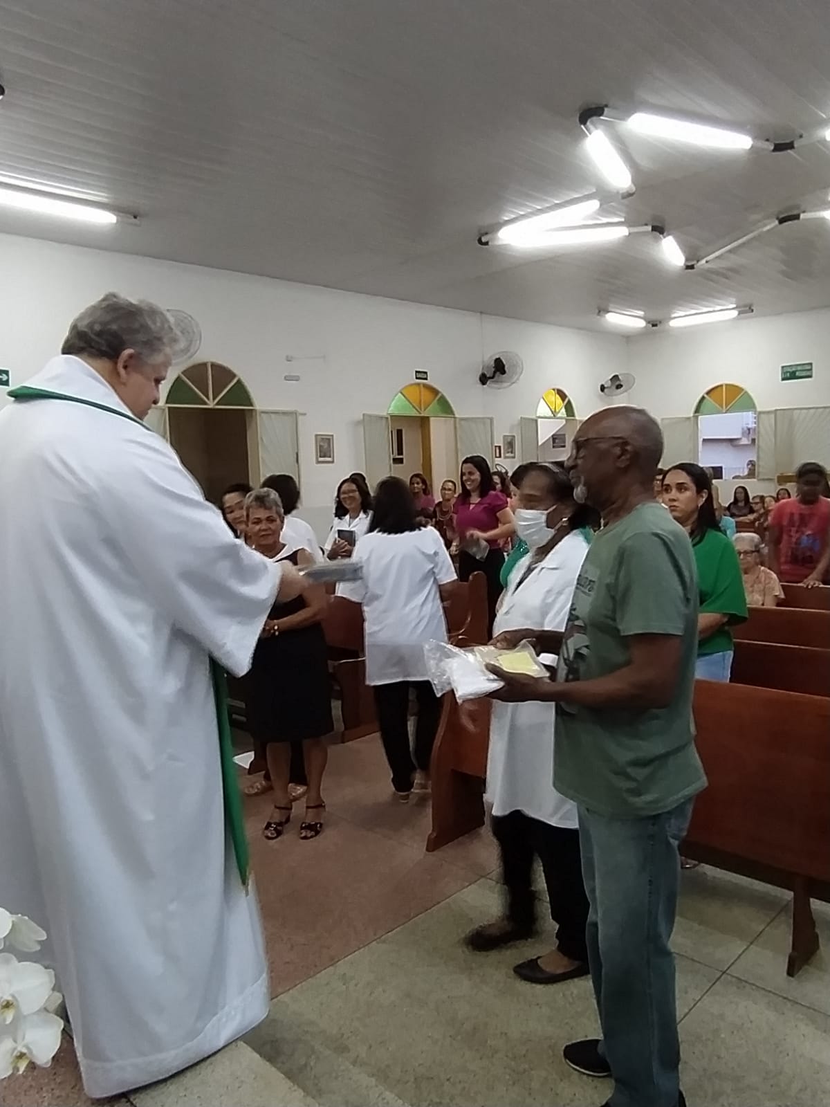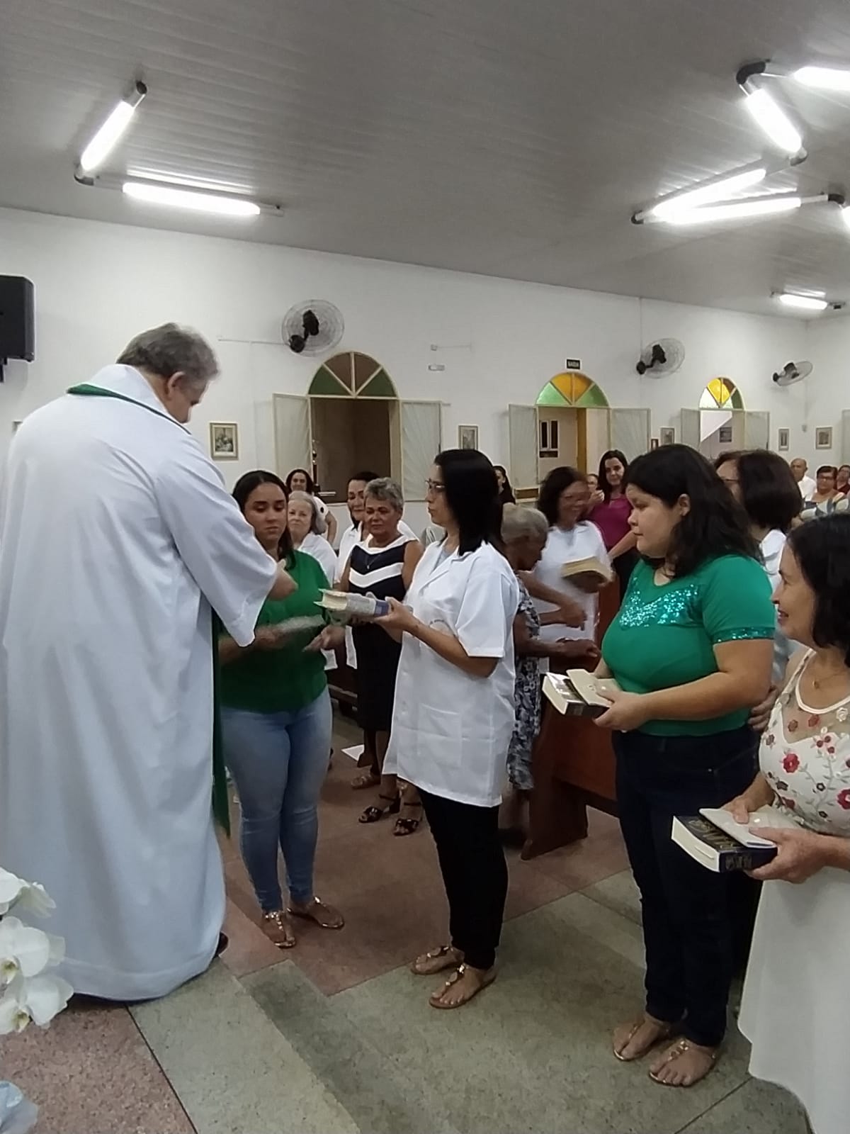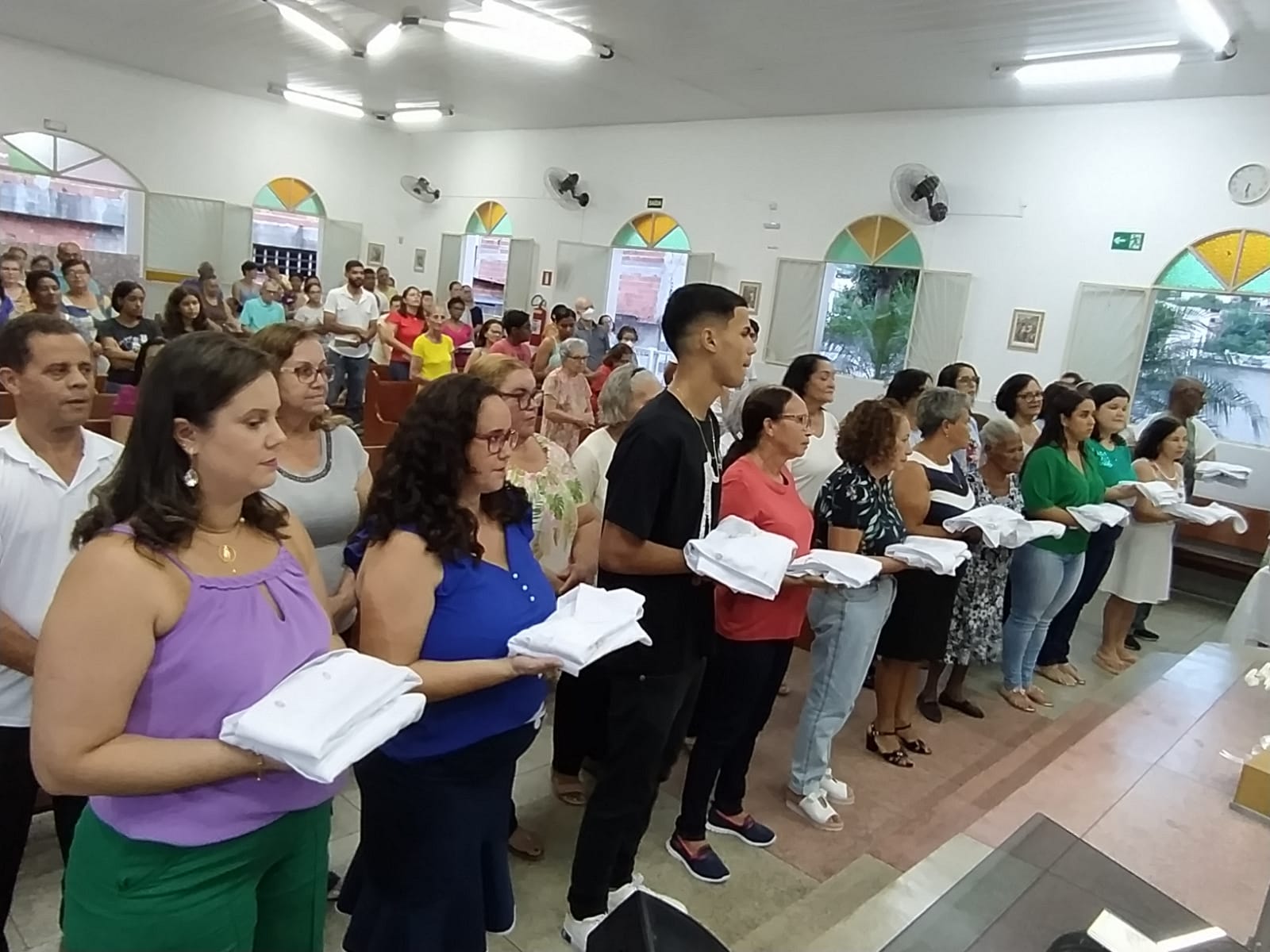 Neste dia, os ministros fizeram o seu compromisso de fé e o Pároco fez a imposição das mãos os abençoando. Em seguida, os padrinhos entregaram as vestimentas aos novos ministros que receberam das mãos do Pároco, a Sagrada escrituras, as alfaias e tecas, de acordo com cada ministério.