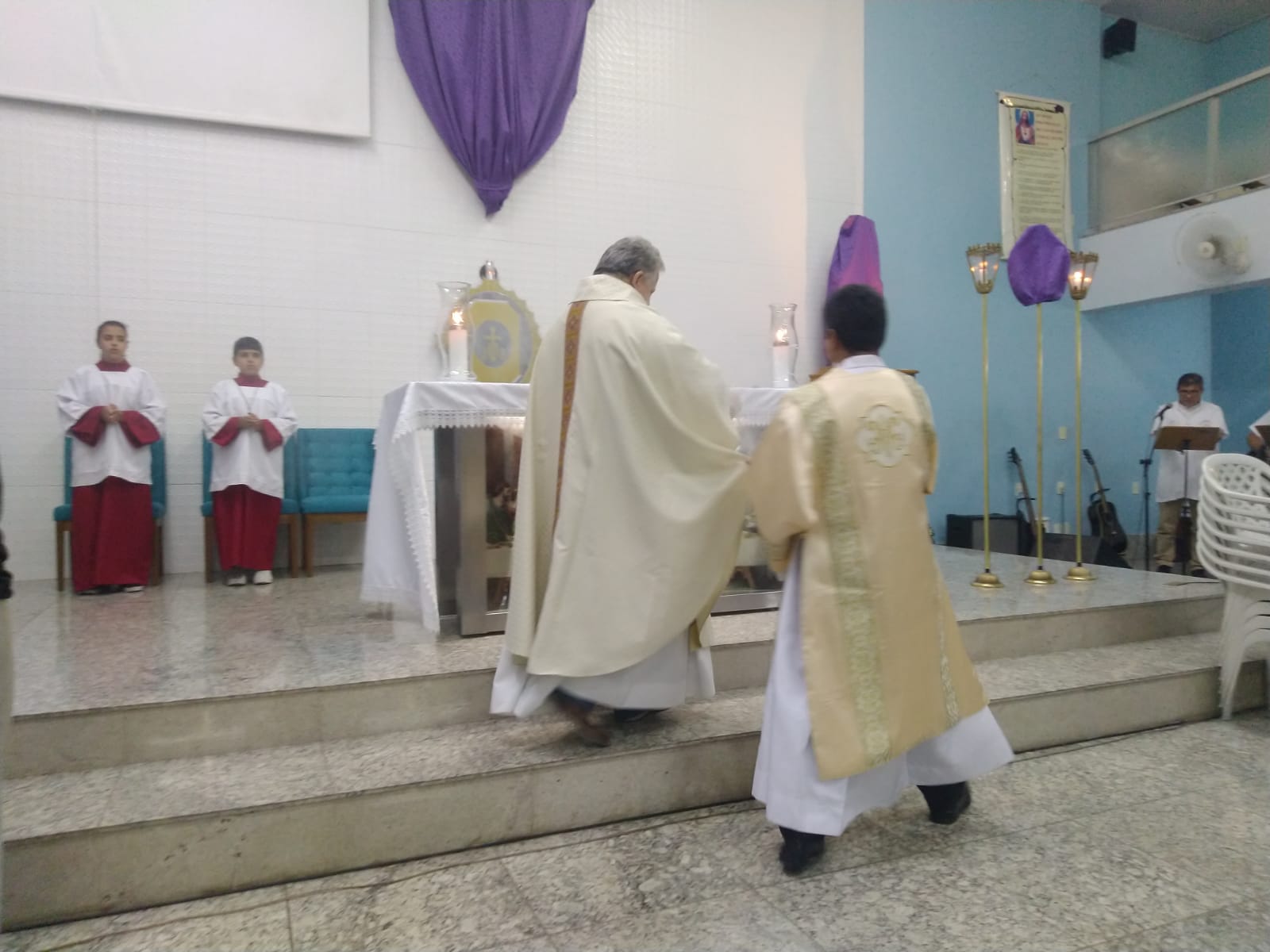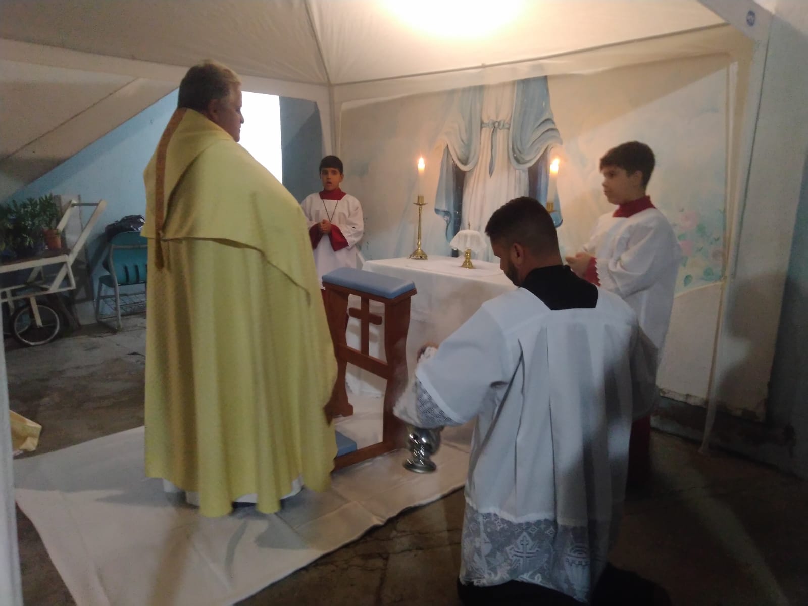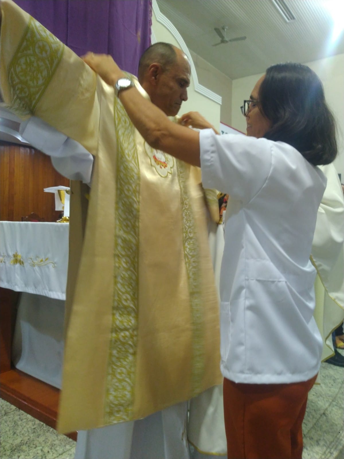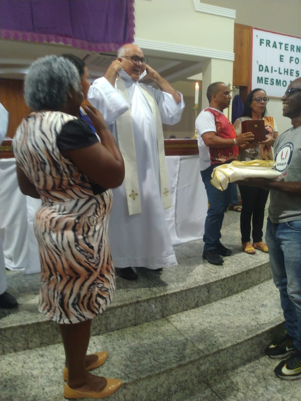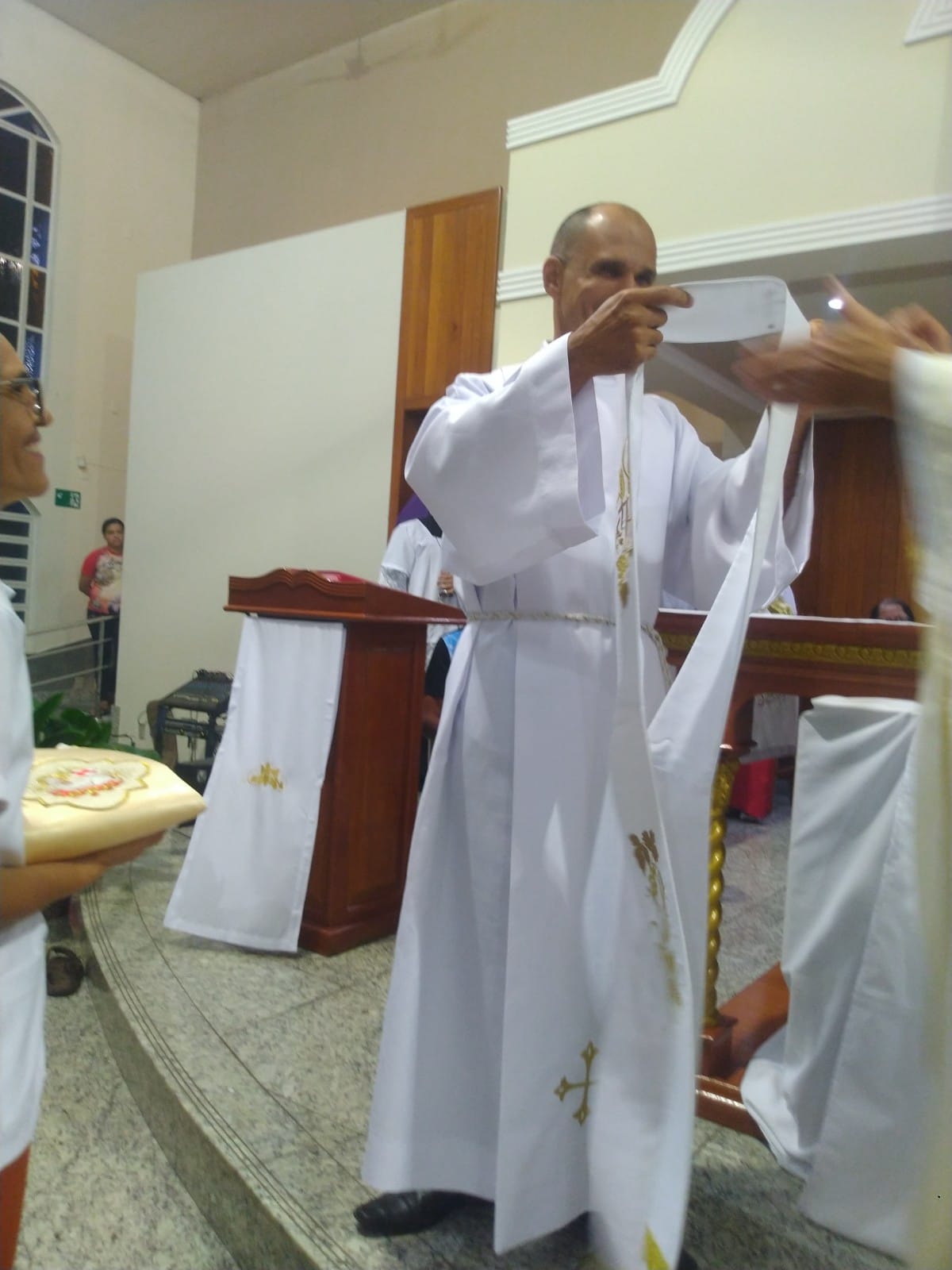O Padre Geraldo Morini e o Diácono Henrique começaram a missa sem suas vestes, que logo lhes foram ofertadas por fiéis.