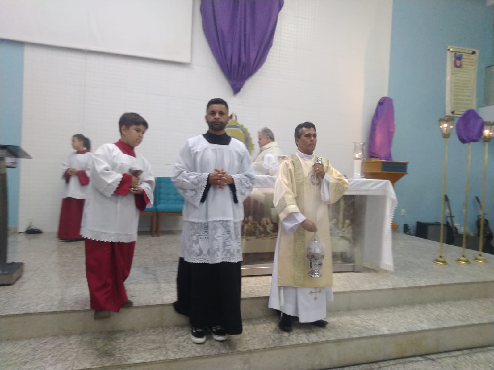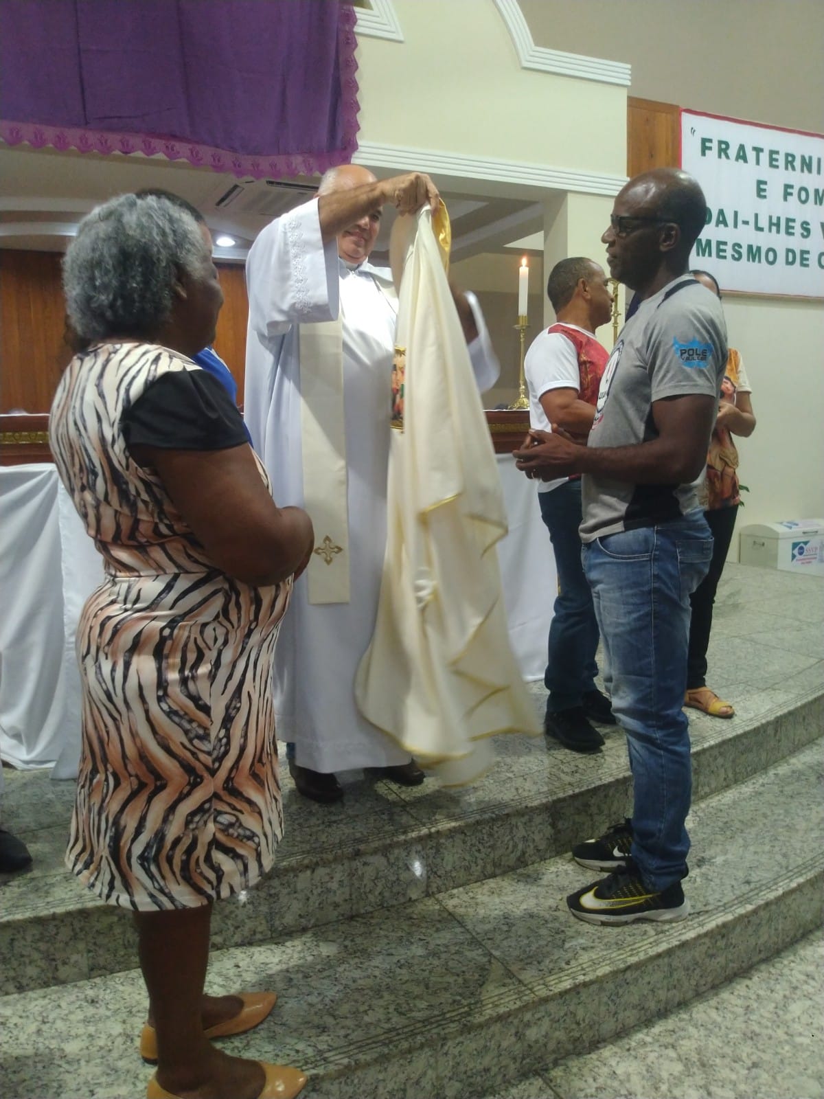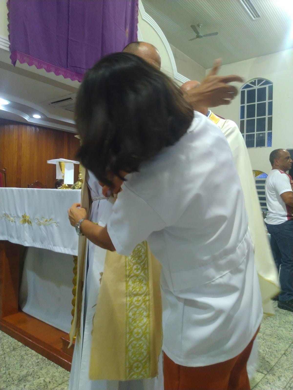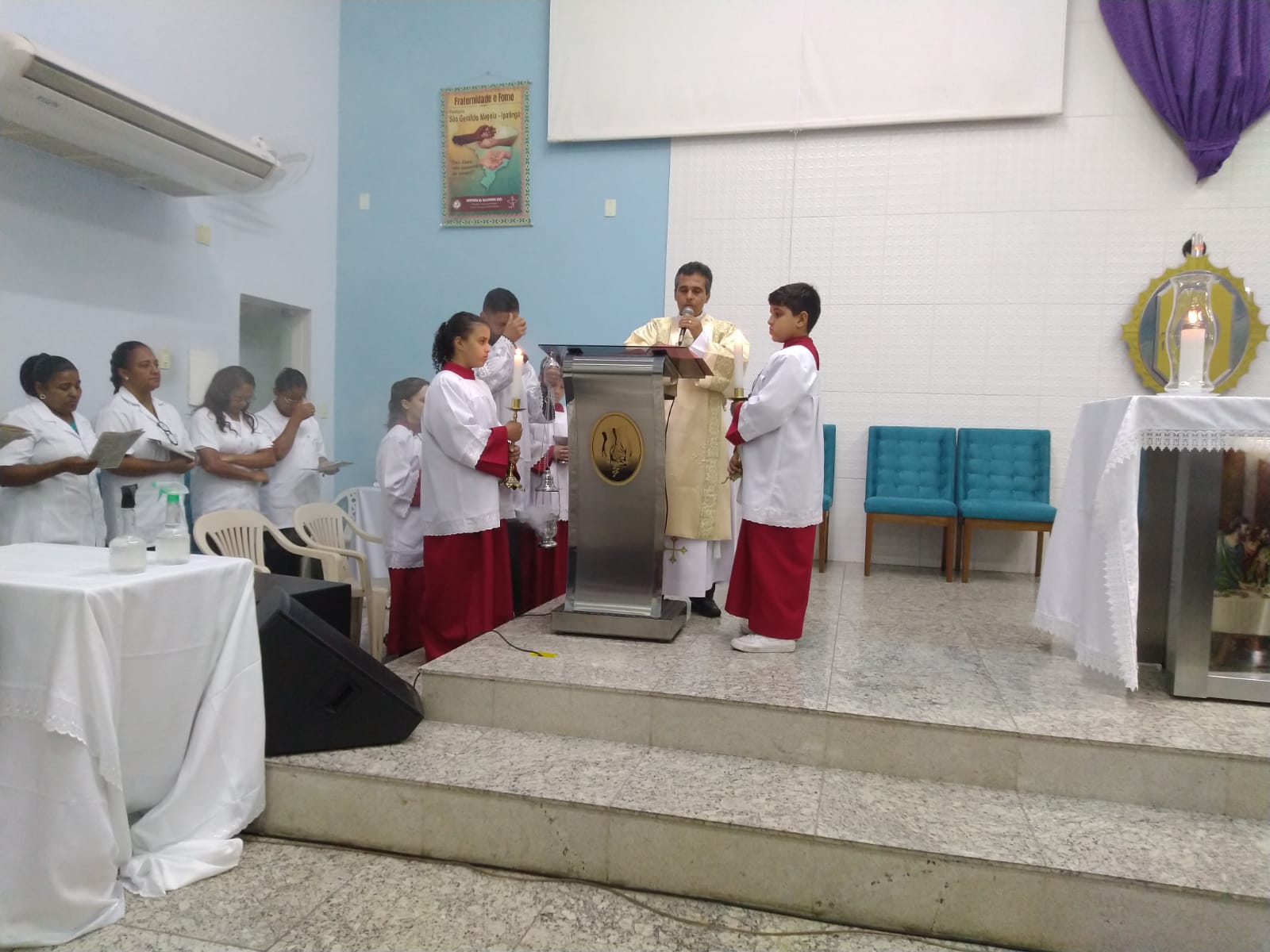 O Padre Geraldo Morini e o Diácono Henrique começaram a missa sem suas vestes, que logo lhes foram ofertadas por fiéis.