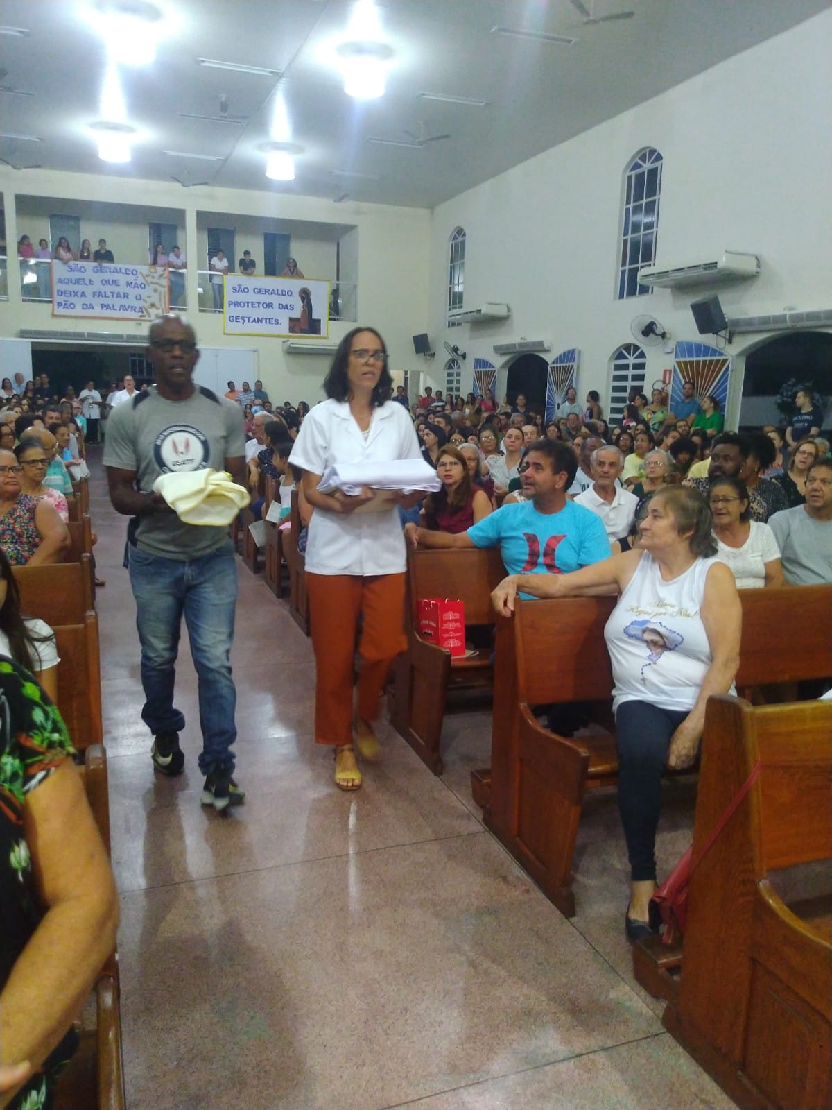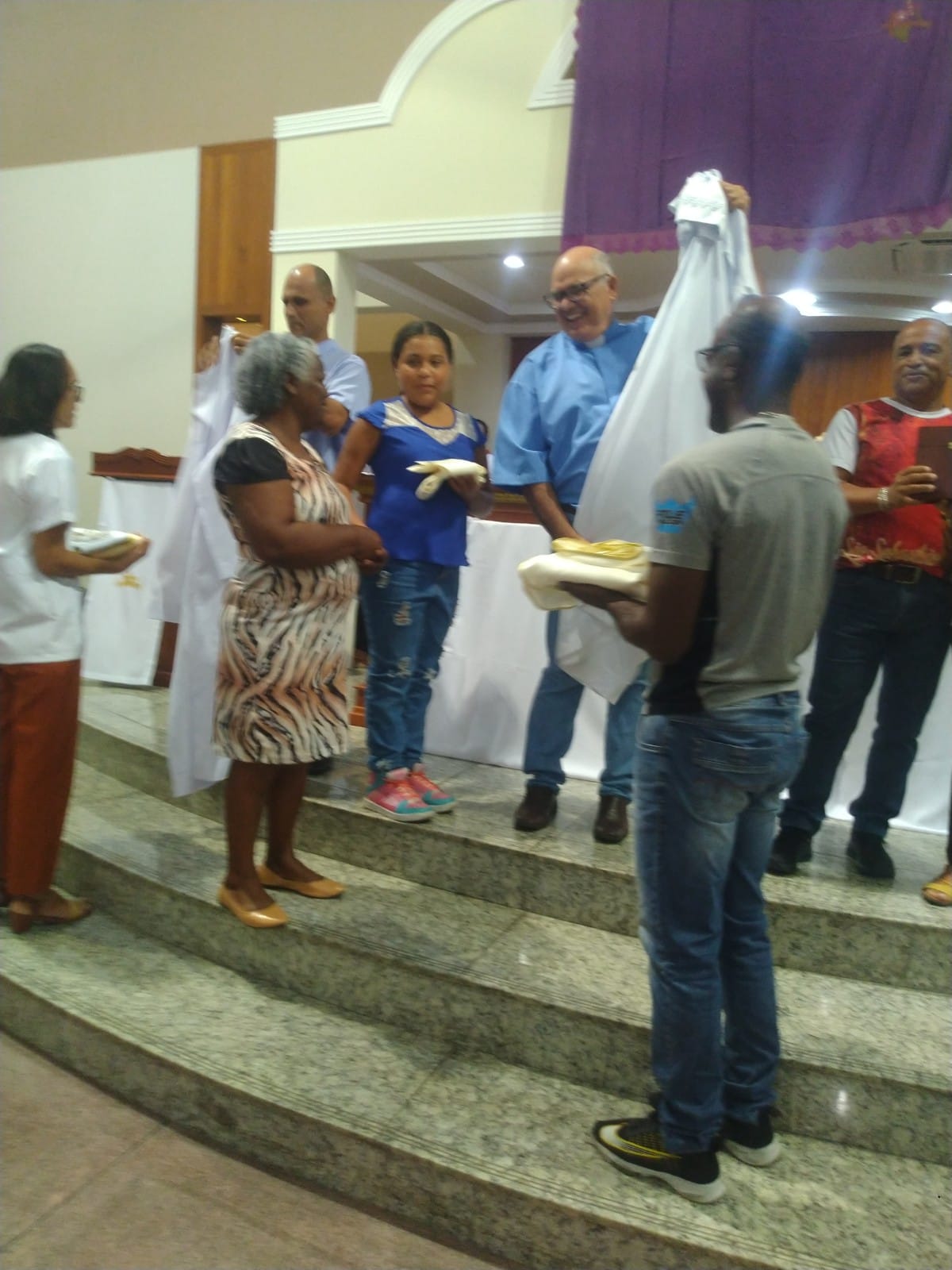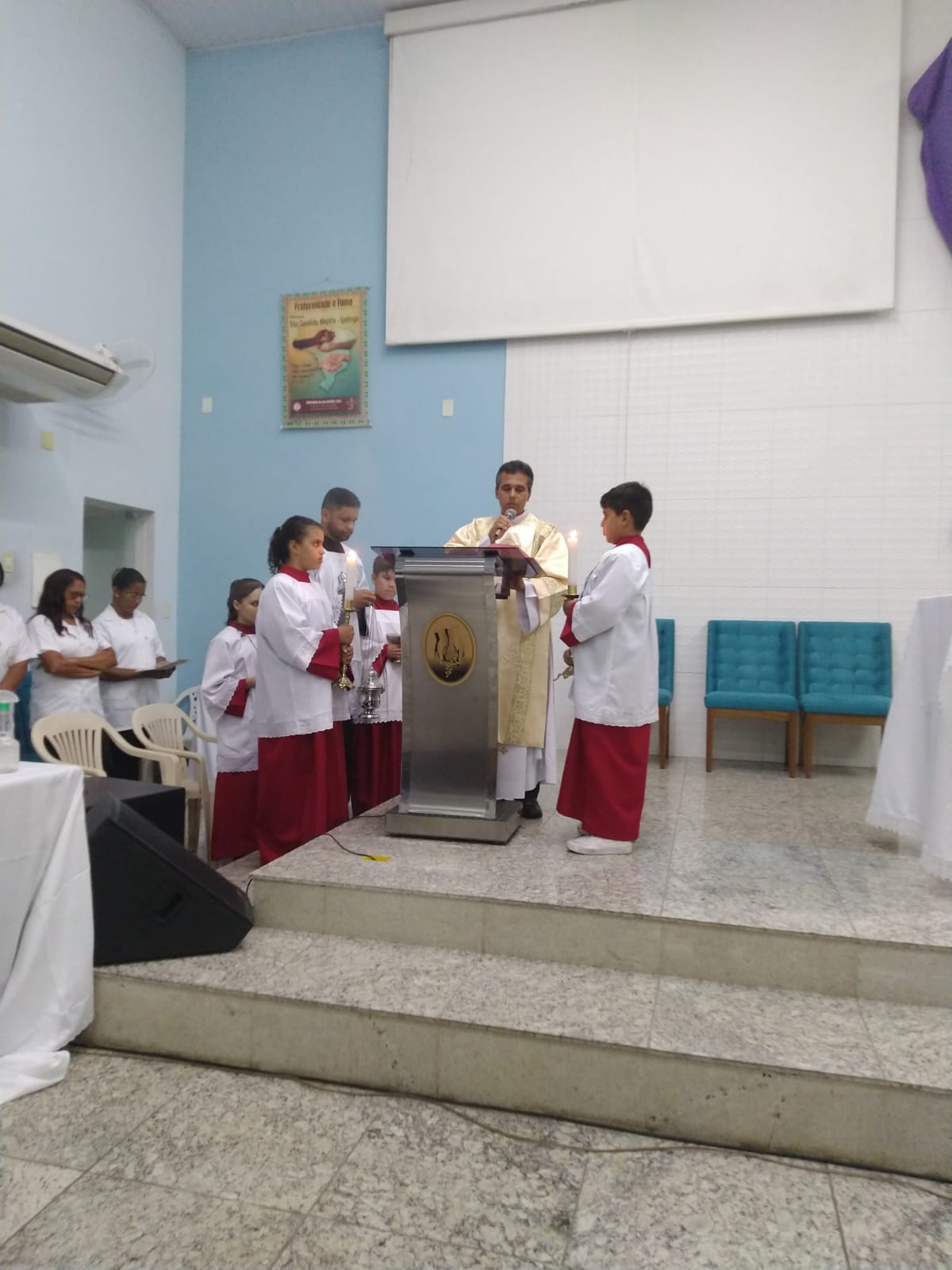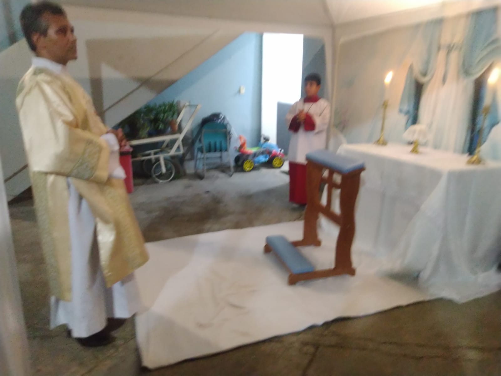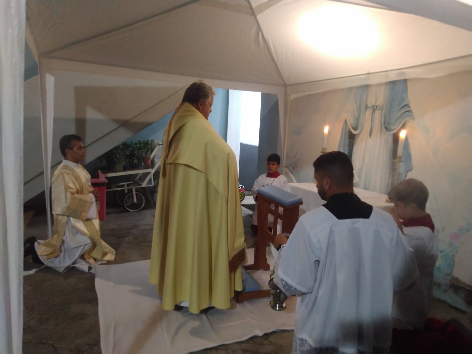 O Padre Geraldo Morini e o Diácono Henrique começaram a missa sem suas vestes, que logo lhes foram ofertadas por fiéis.