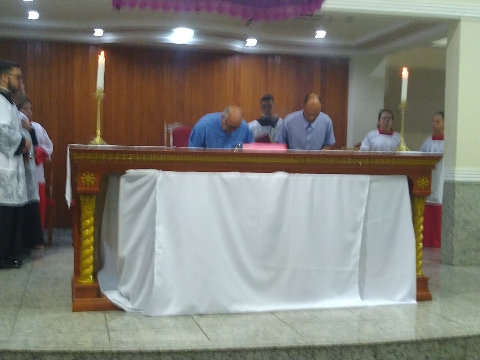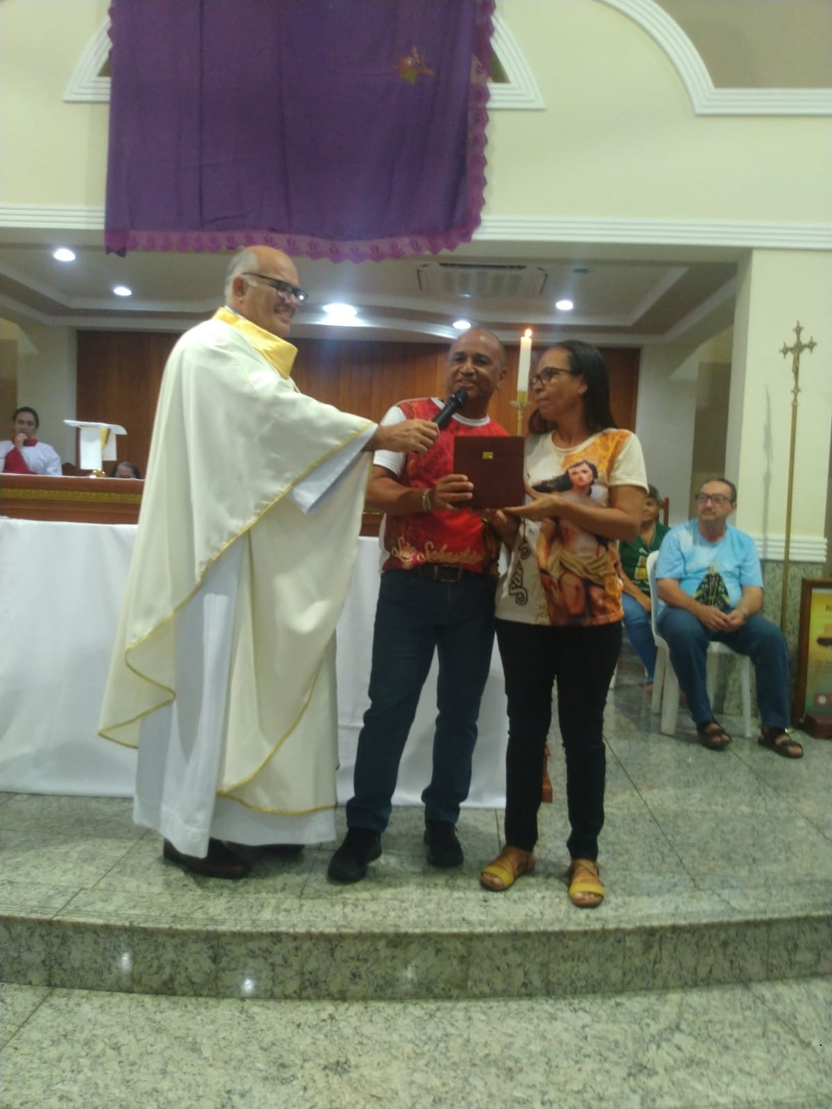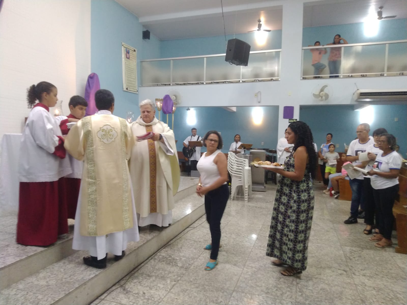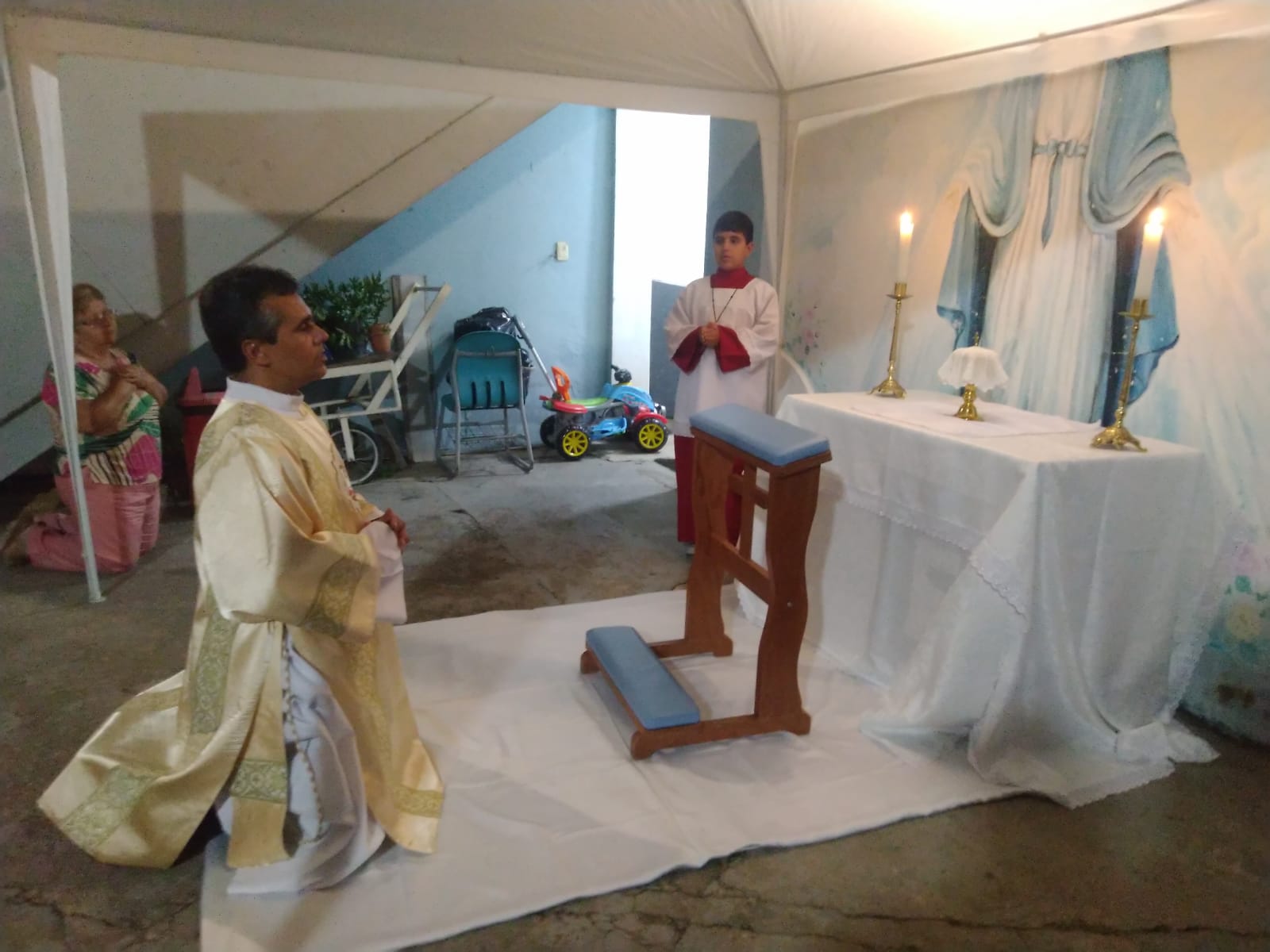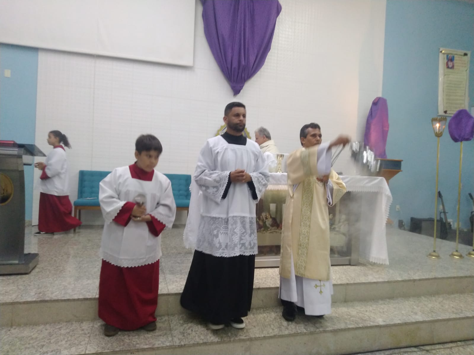 O Padre Geraldo Morini e o Diácono Henrique começaram a missa sem suas vestes, que logo lhes foram ofertadas por fiéis.