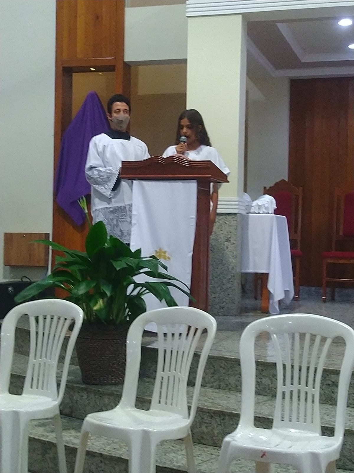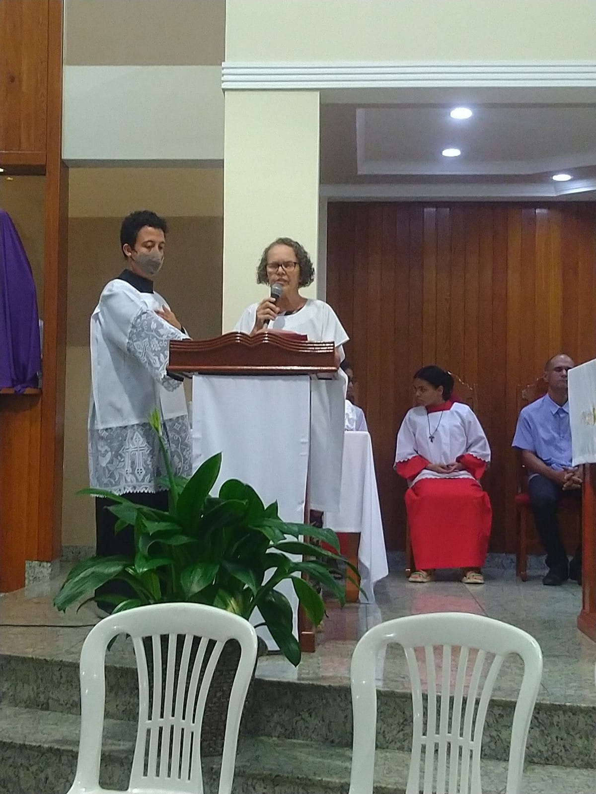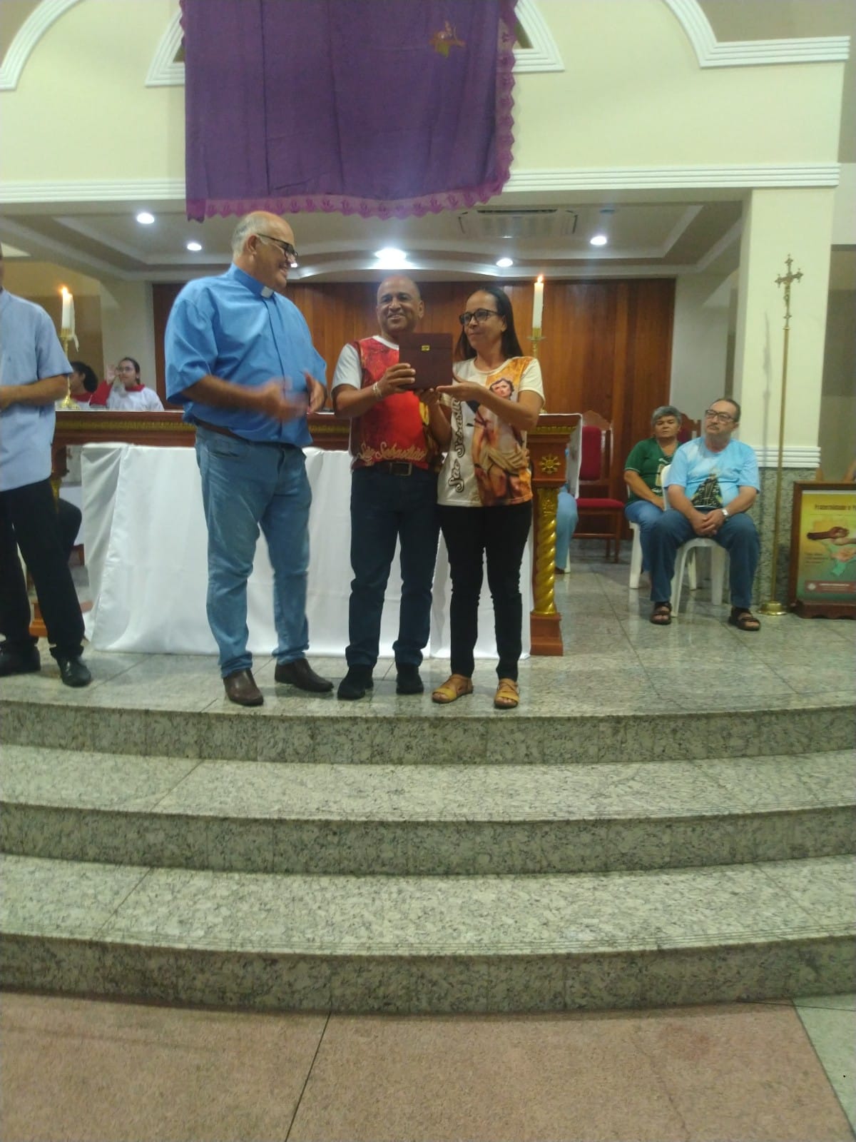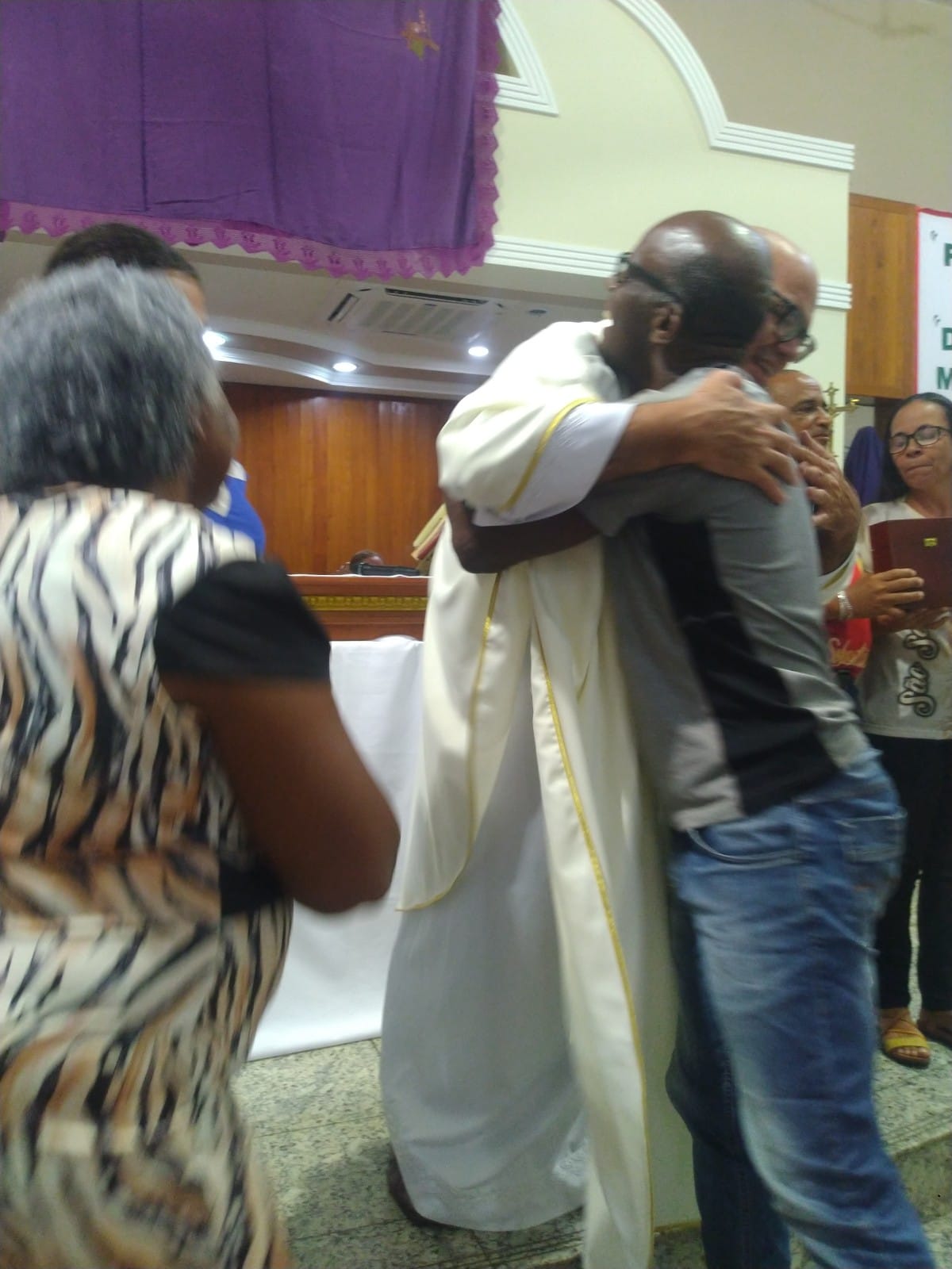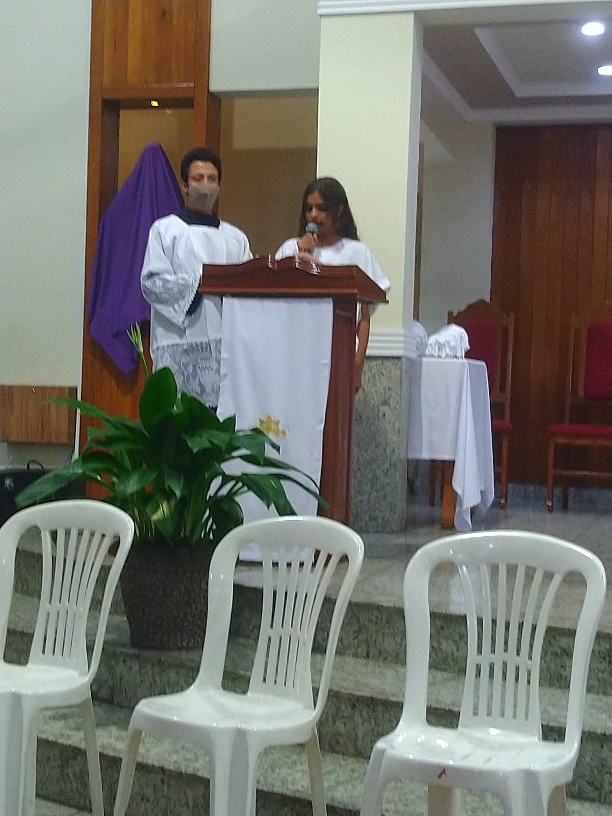 O Padre Geraldo Morini e o Diácono Henrique começaram a missa sem suas vestes, que logo lhes foram ofertadas por fiéis.