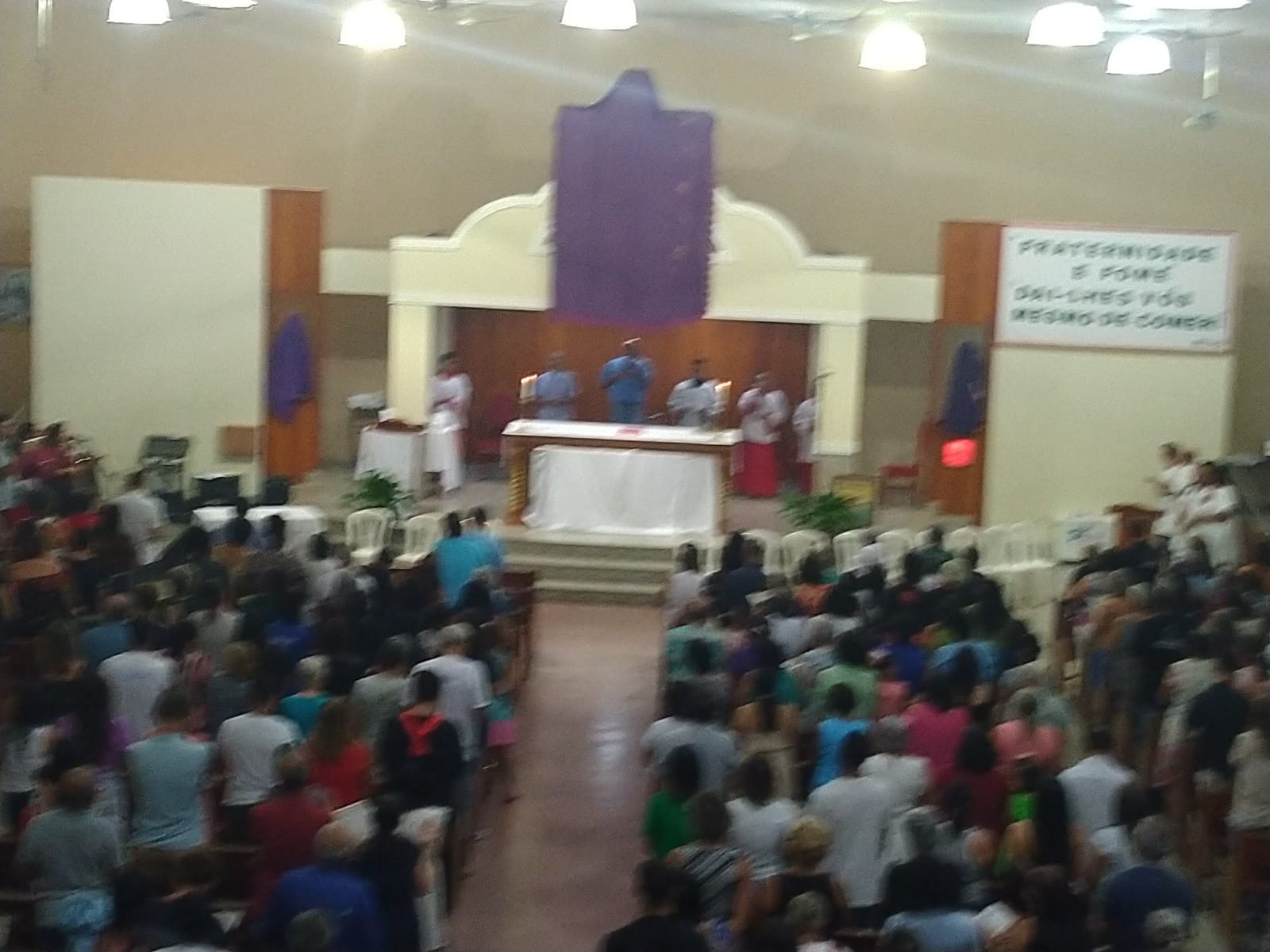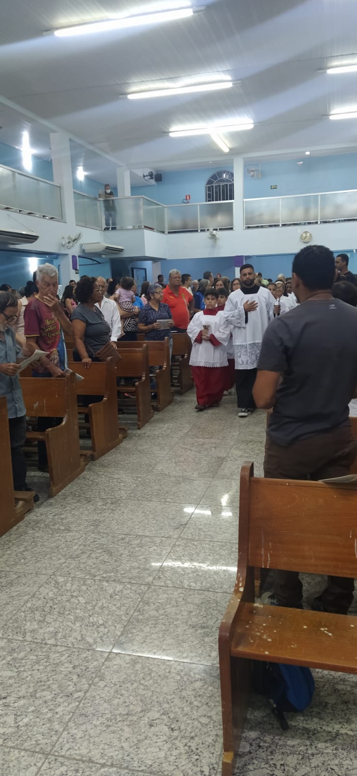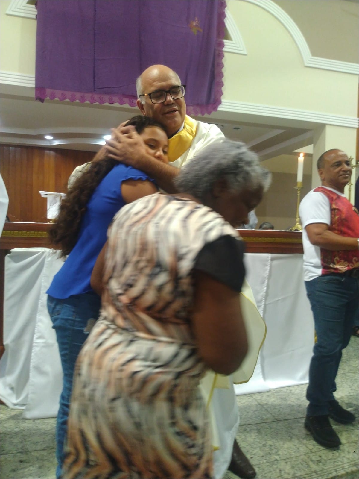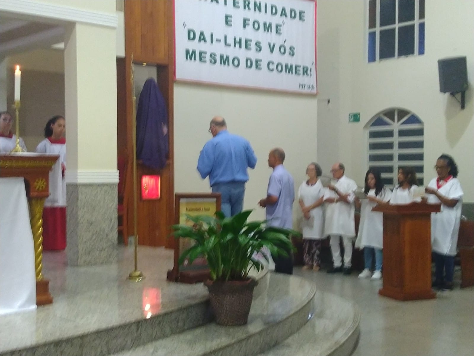 O Padre Geraldo Morini e o Diácono Henrique começaram a missa sem suas vestes, que logo lhes foram ofertadas por fiéis.