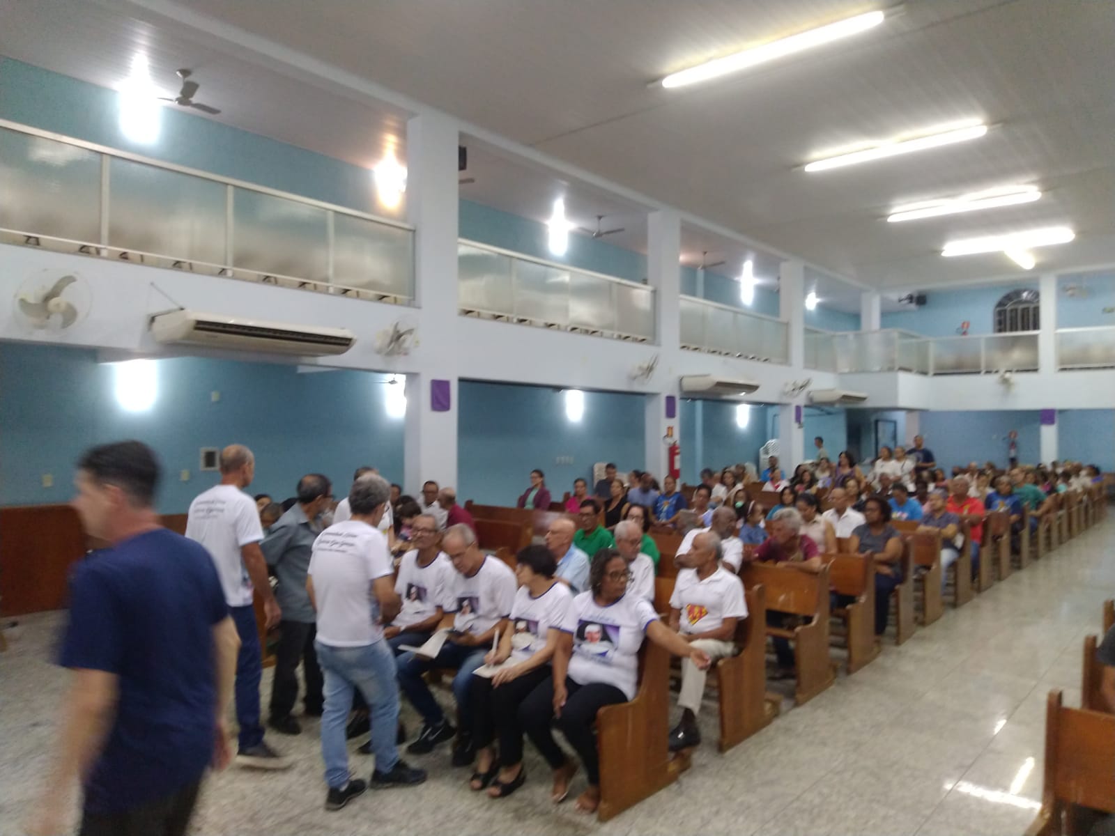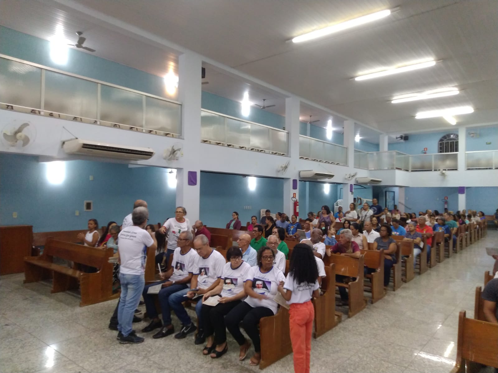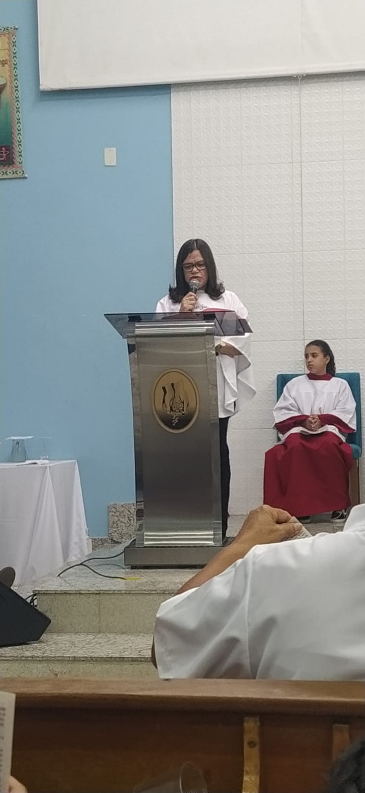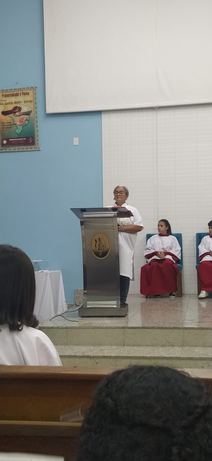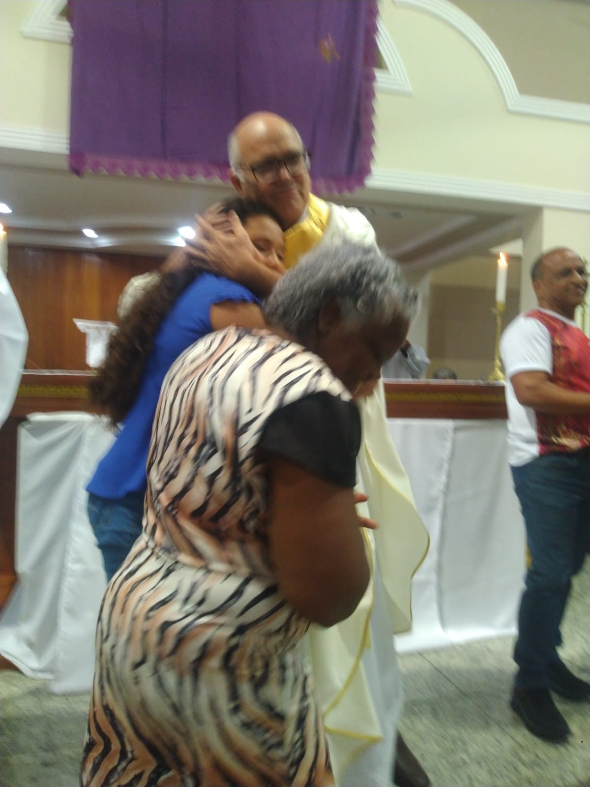 O Padre Geraldo Morini e o Diácono Henrique começaram a missa sem suas vestes, que logo lhes foram ofertadas por fiéis.