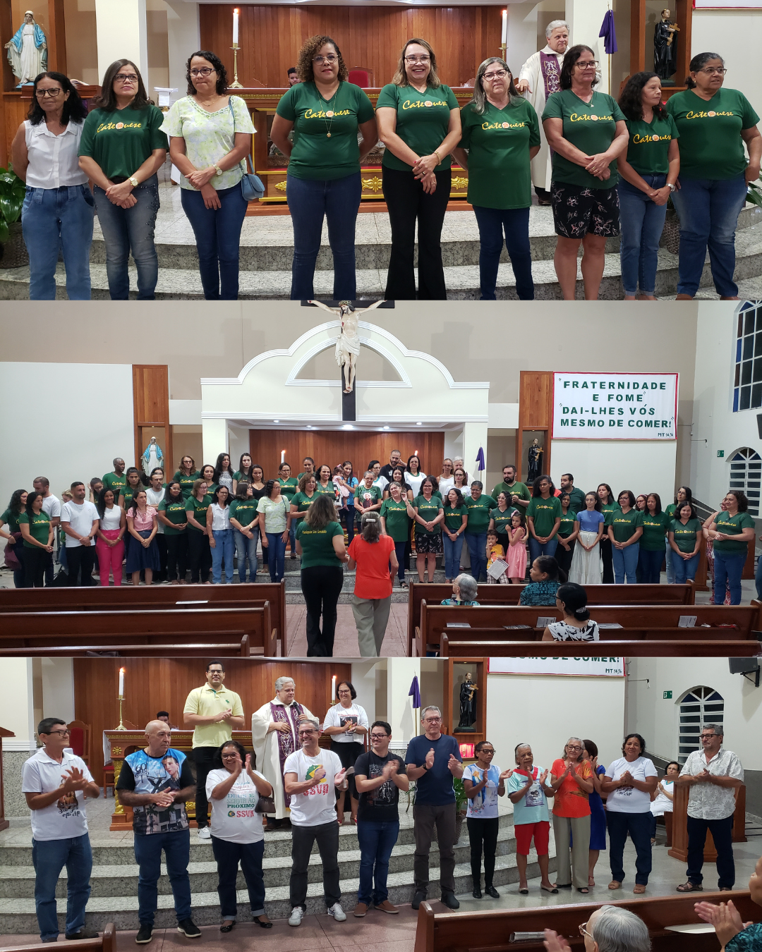A Santa Missa foi celebrada pelo pároco Pe. Aloísio Vieira que ao final da Missa convidou os coordenadores da Catequese de nossa Paróquia à frente do altar para serem apresentados à comunidade, em seguida nosso pároco também convidou os demais integrantes da Catequese. Após esse momento também foram convidados os integrantes da SSVP para serem apresentados à comunidade.