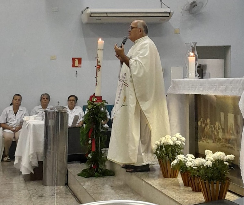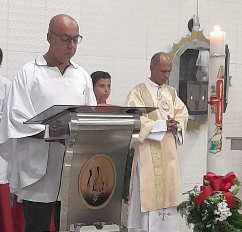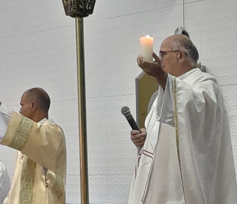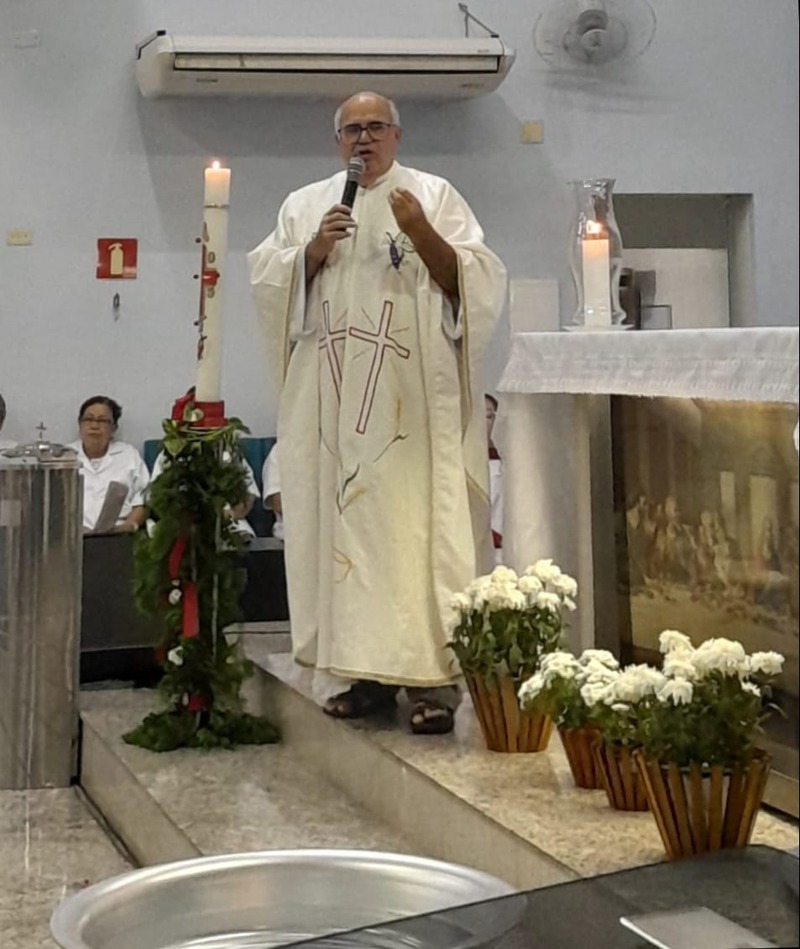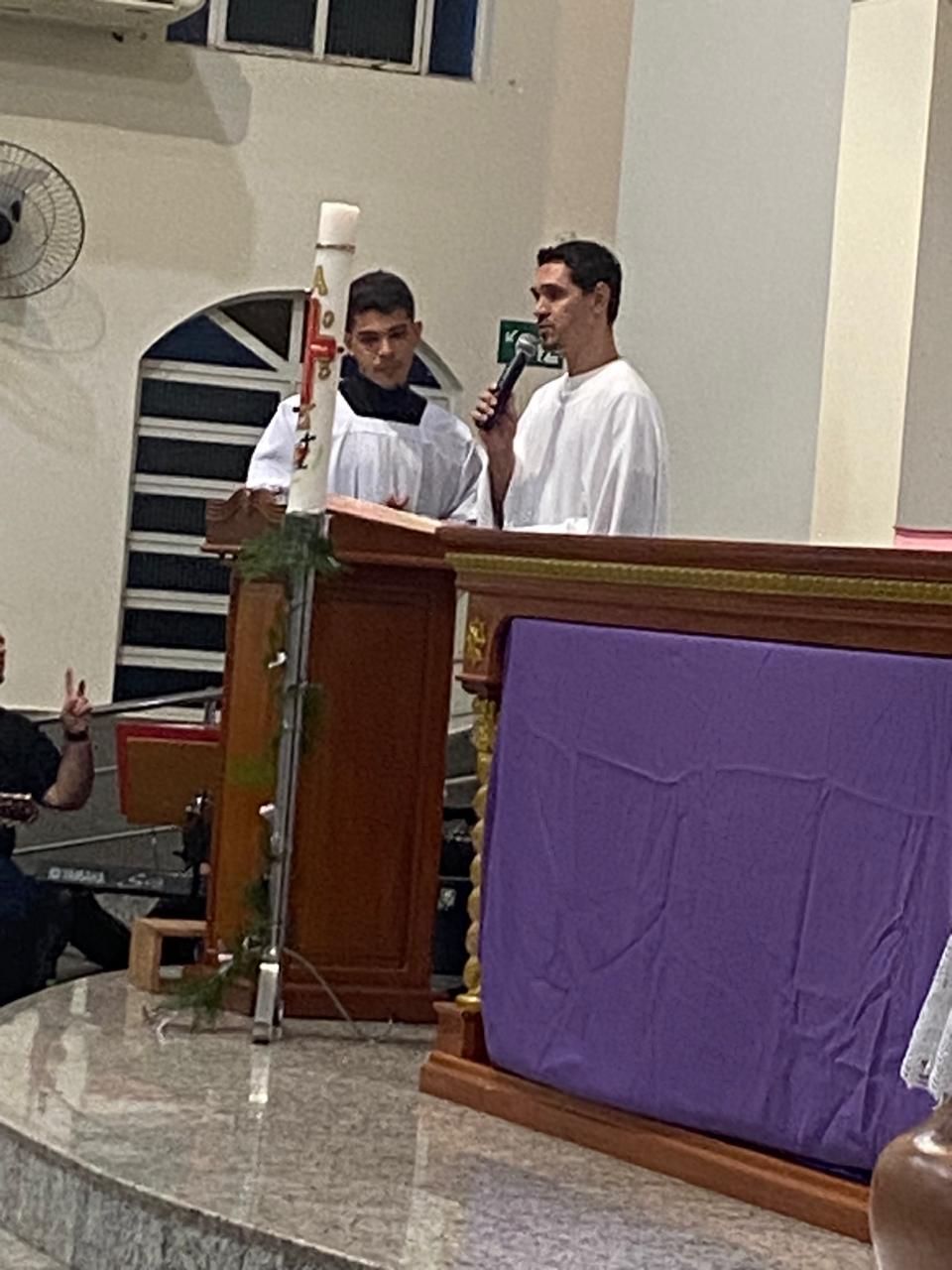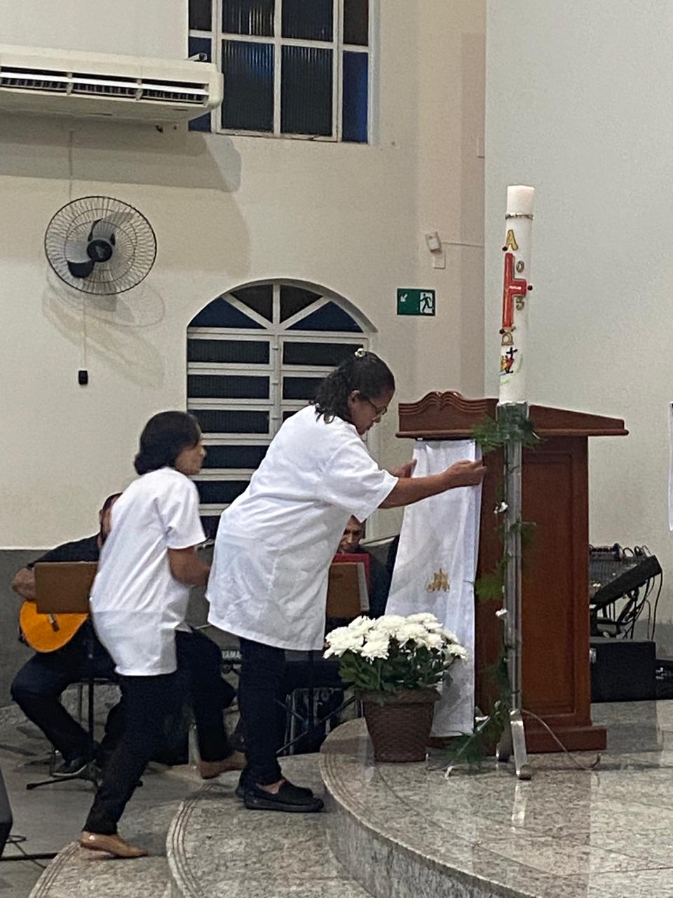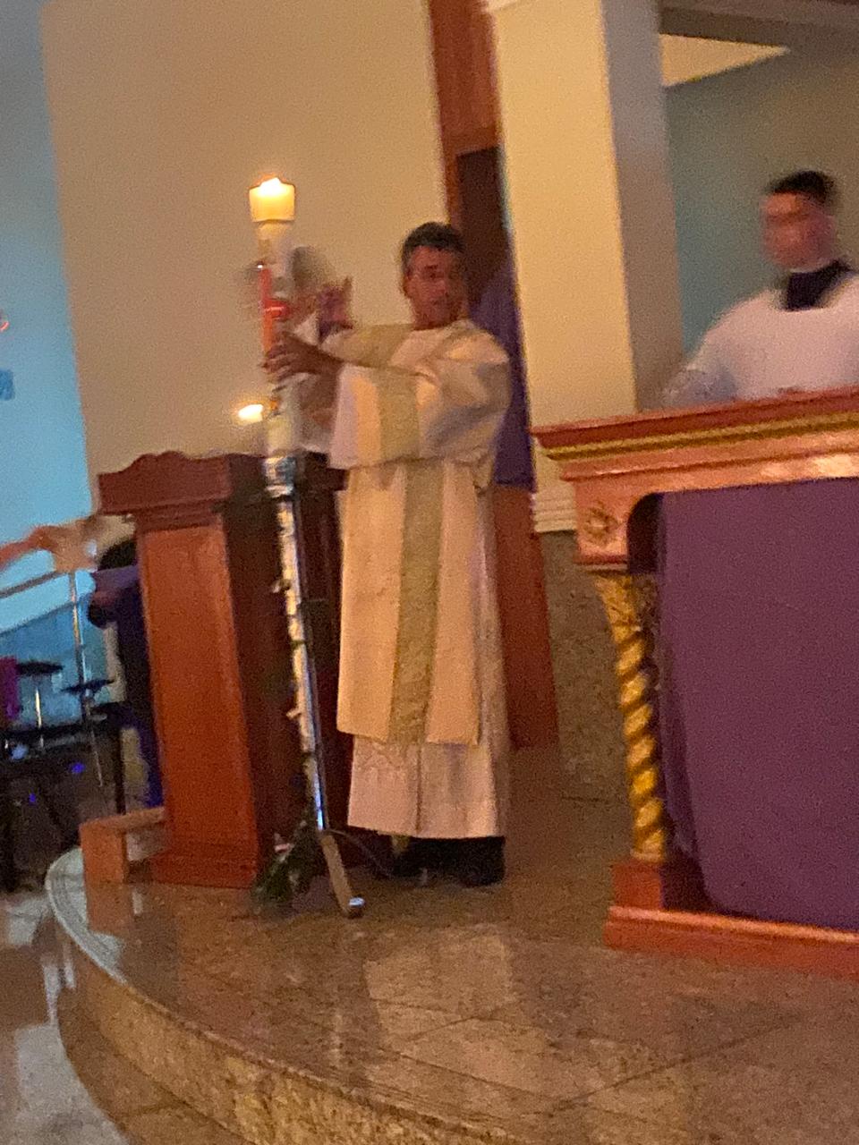 Já na Igreja, aconteceu a Liturgia da Palavra ou Liturgia da Vigília Pascal que contém nove leituras, a saber: sete do Antigo Testamento e duas do Novo Testamento desde a criação até a ressurreição . Cristo Ressuscitou! O mistério pascal é o centro de nossa fé e nos ensina a amar e perdoar como Cristo fez conosco.