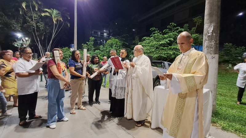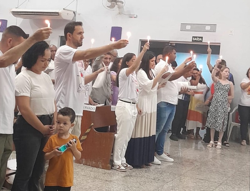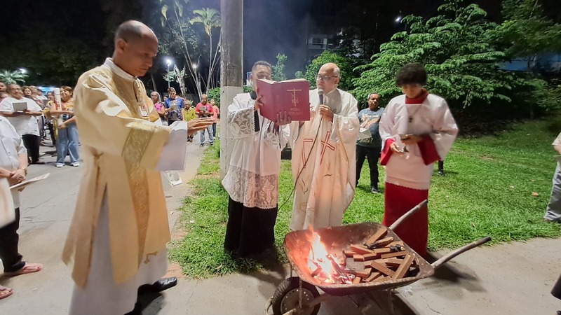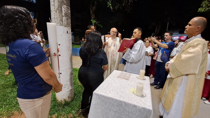 Em sintonia com a Igreja Matriz São Geraldo Magela, a Comunidade Nossa Senhora das Graças celebrou com grande fervor e participação a Vigília Pascal, momento mais importante do calendário litúrgico cristão. A celebração teve início na Praça do Esperança, com o tradicional acendimento do Fogo Novo, símbolo da luz de Cristo ressuscitado. Em seguida, a comunidade seguiu em procissão luminosa até a igreja, levando velas acesas e entoando cânticos de louvor.