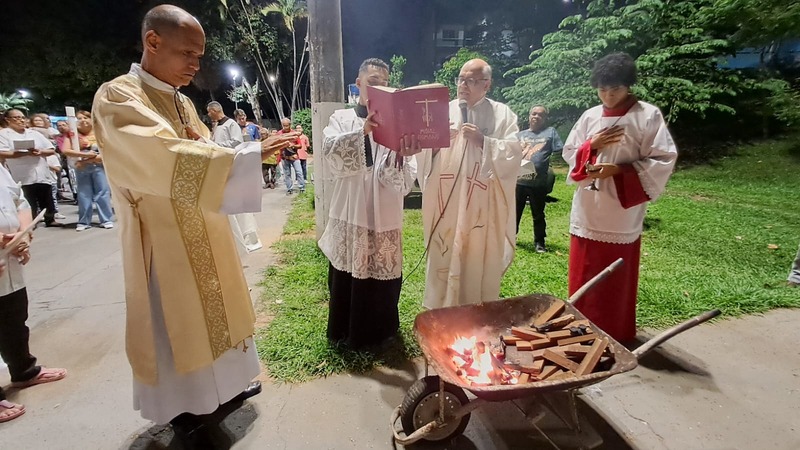 Na praça do bairro Bom Jardim e na praça do Esperança, preparou- se uma fogueira, onde todos se reuniram para iniciar esta vigília simultânea. Organizaram a queima dos Santos Óleos do ano passado e após a benção do fogo novo, o padre acendeu o Círio Pascal e do Círio Pascal as pessoas foram acendendo suas velas para iniciar a procissão da Luz ate a comunidade onde Virgília e Missa prosseguiram.