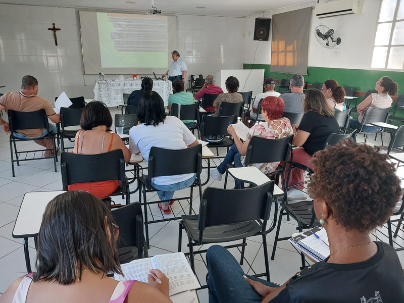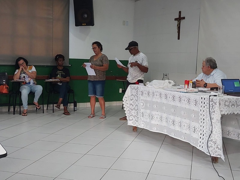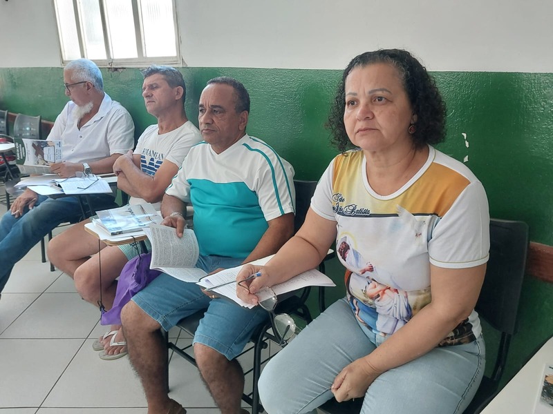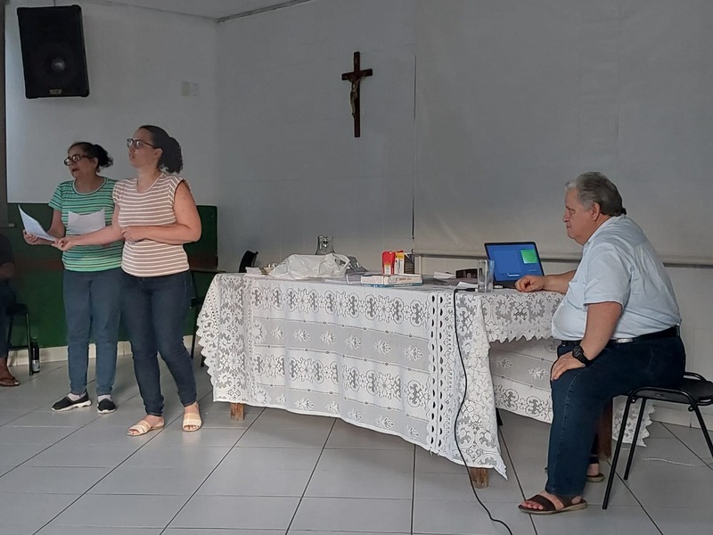 Após a fundamentação realizada pelo Padre Aloísio, todos foram orientados para o trabalho de grupo, e que as respostas dos grupos, iriam passar por uma plenária, e que seriam fontes para elaboração do objetivo geral e específico, além de definirem ações paroquiais para 2024. Ao todo foram feitos 10 grupos.