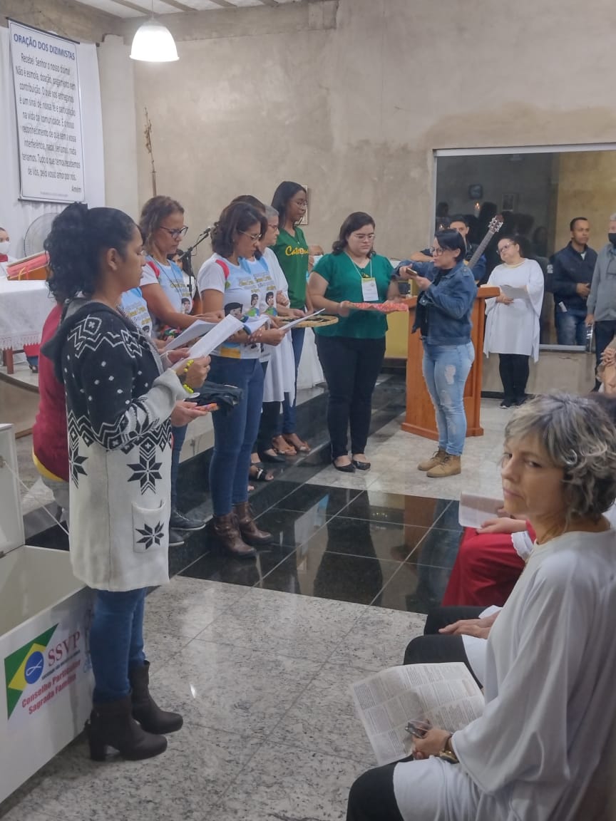 Diante desses importantes passos dados, antes da Missa começar, às 17h, rezou-se o Terço missionário com todas as crianças do IAM de todas as comunidades, sendo que cada comunidade representou um continente.