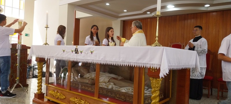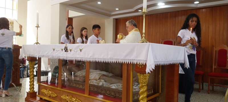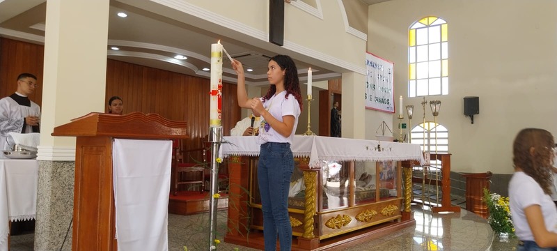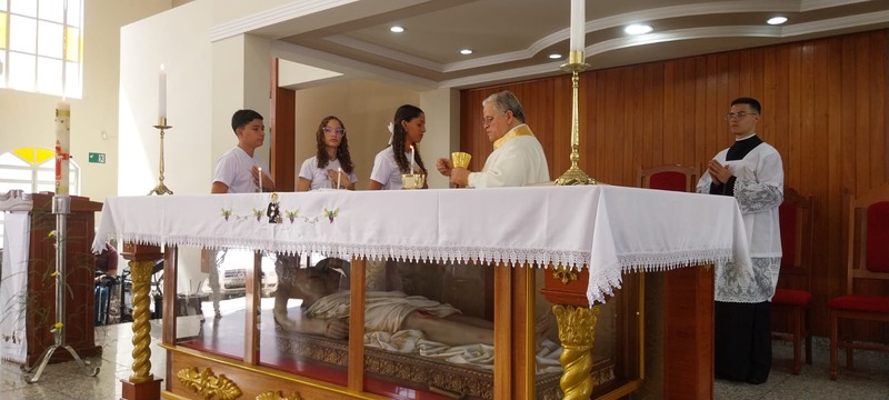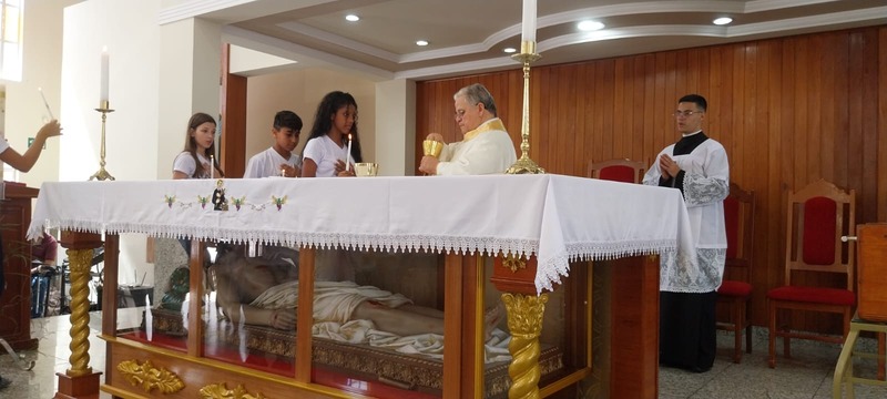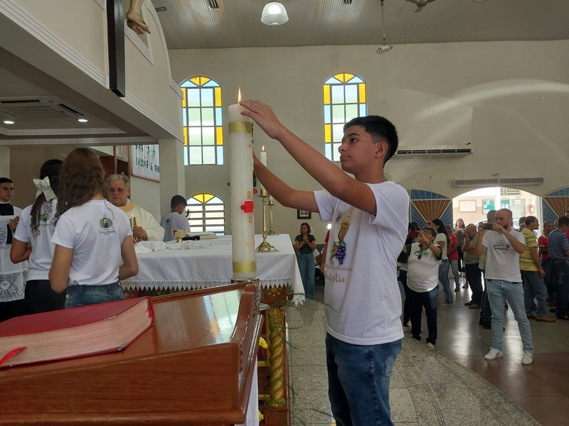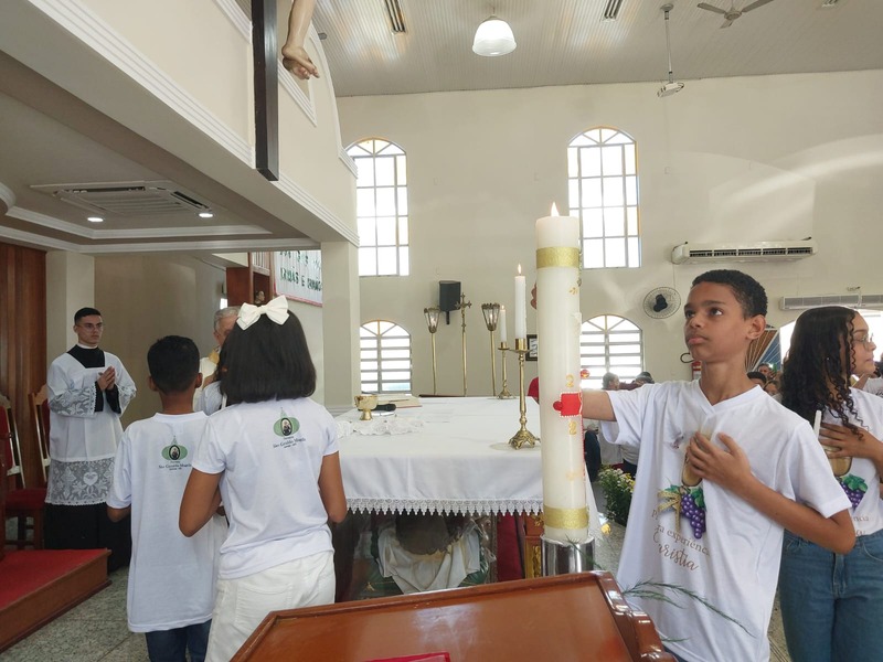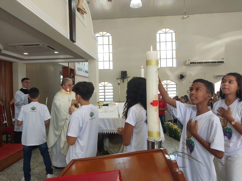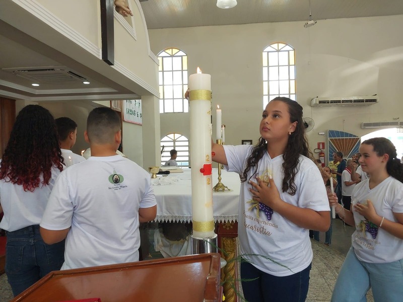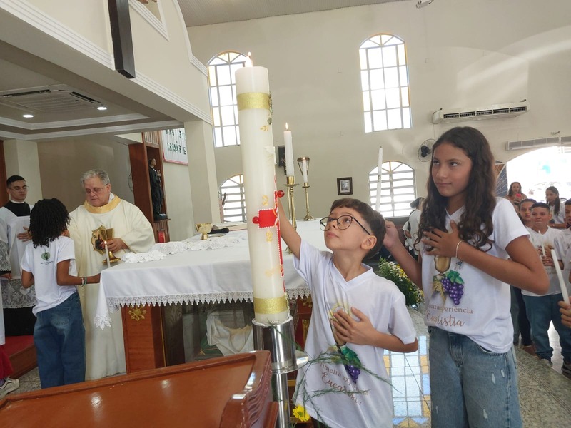 A Missa foi presidida pelo Pároco da Paróquia São Geraldo Magela, Padre Aloísio Vieira. Na oportunidade, Padre Aloísio pediu que as crianças rezassem o Credo de maneira firme e clara, para que toda igreja escutasse. No momento de realizar a Primeira Experiência Eucarística, cada criança acendeu a sua vela no Círio Pascal e foi comungar, recebendo a comunhão da mão do Padre.