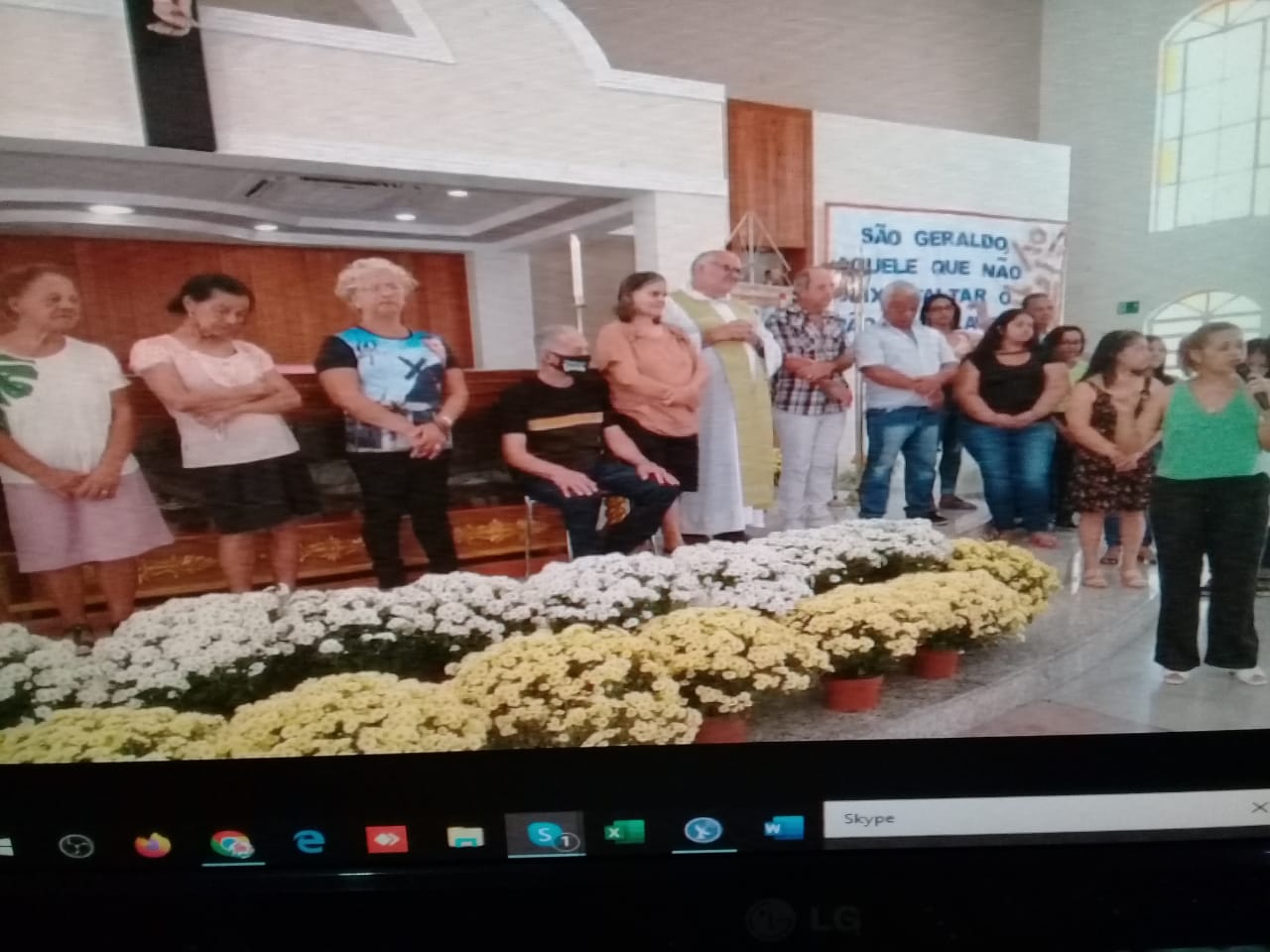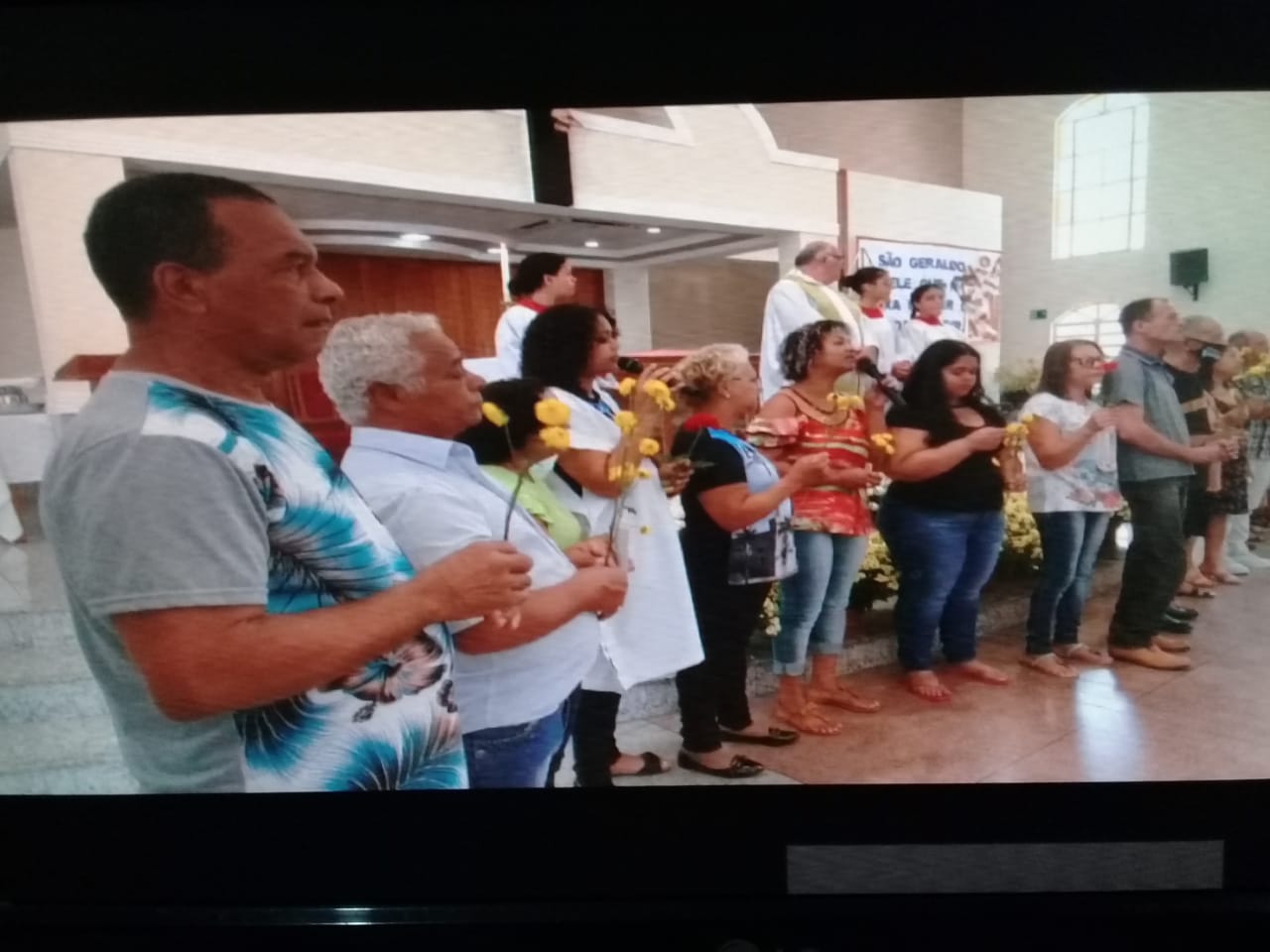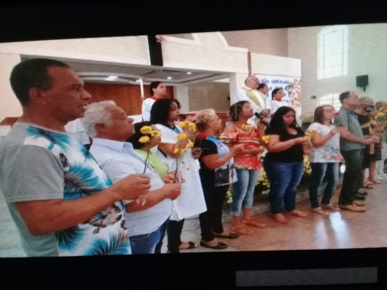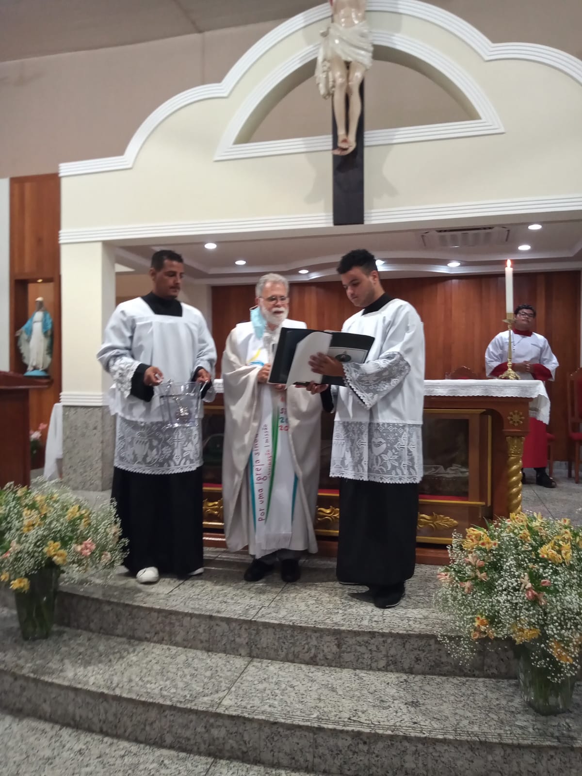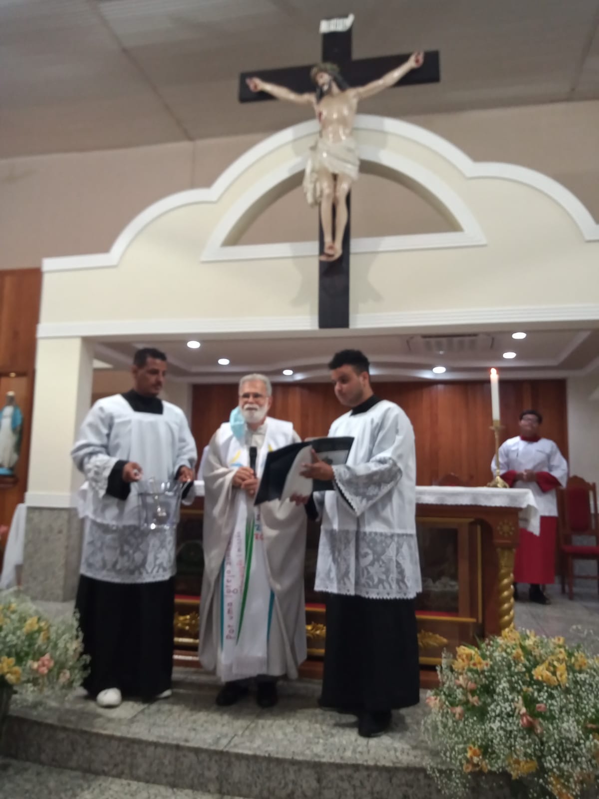 Presidida pelo Pe. José Geraldo de Melo, a celebração eucarística da noite teve o oferecimento de flores dos Casais e do Terço dos Homens e homenagem à família do Sr. Geraldo Damásio (in memorian) que doou o terreno para a construção do templo da Comunidade.