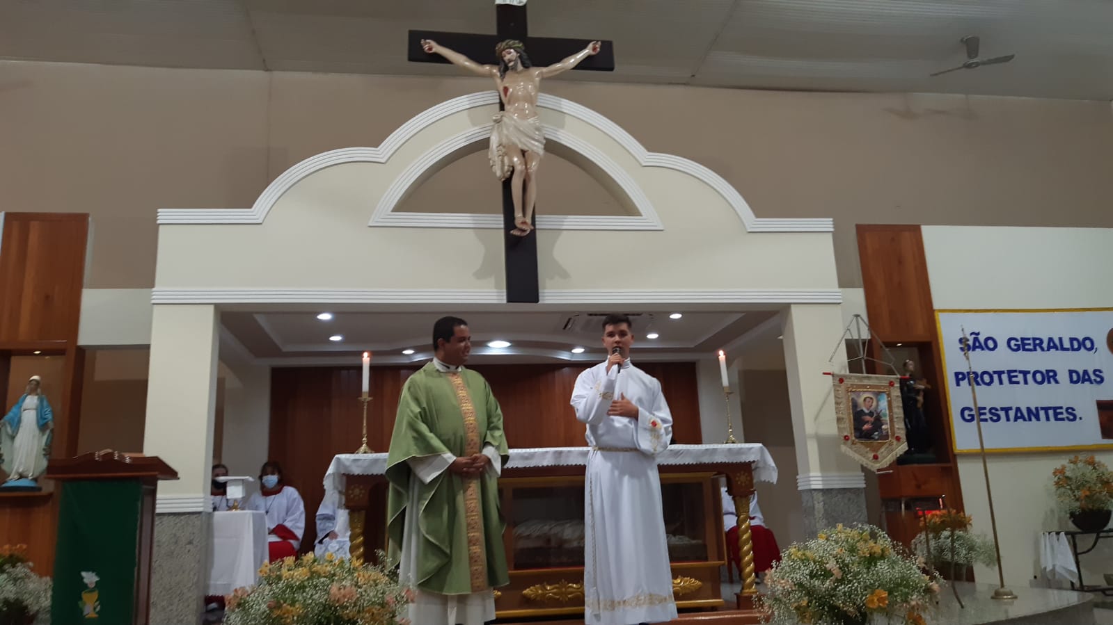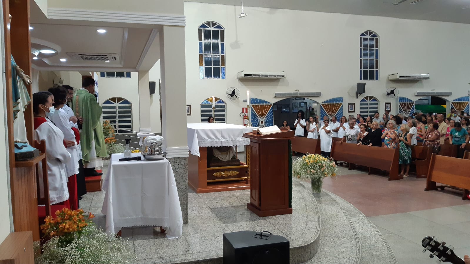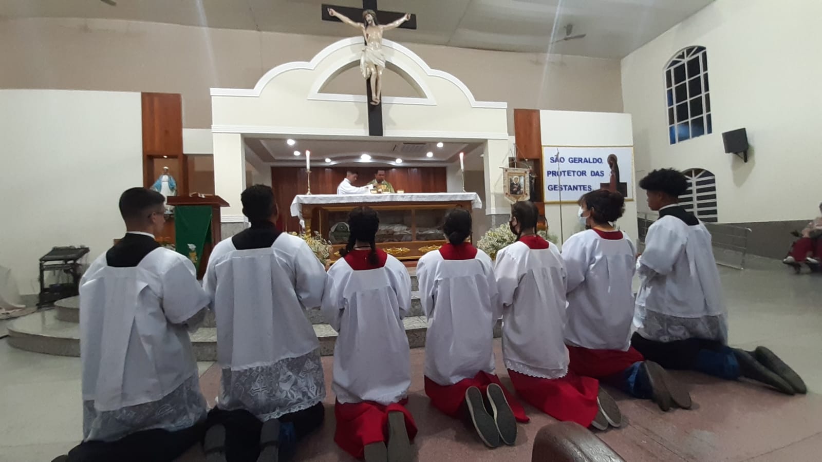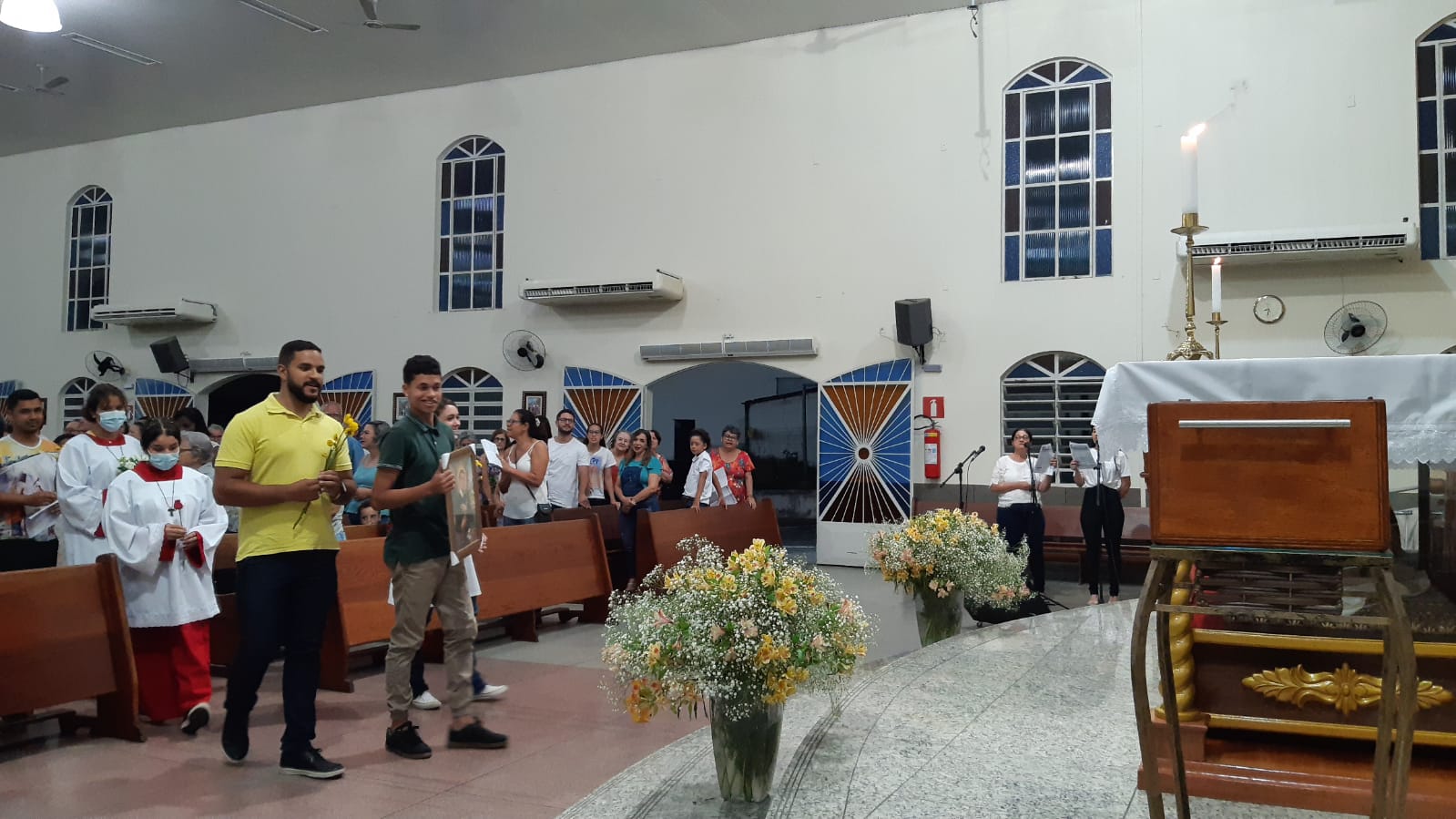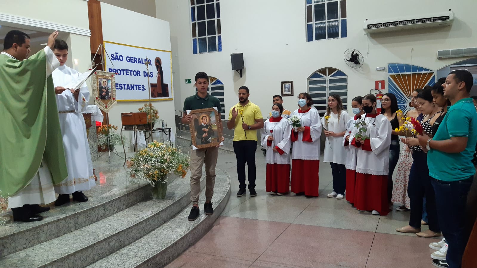 Presidida pelo Pe. Adriano Mendes de Pinho, filho da Paróquia São Geraldo Magela, a celebração eucarística da noite teve o oferecimento de flores de todos os jovens, catequizandos na sétima, oitava e nona etapa.