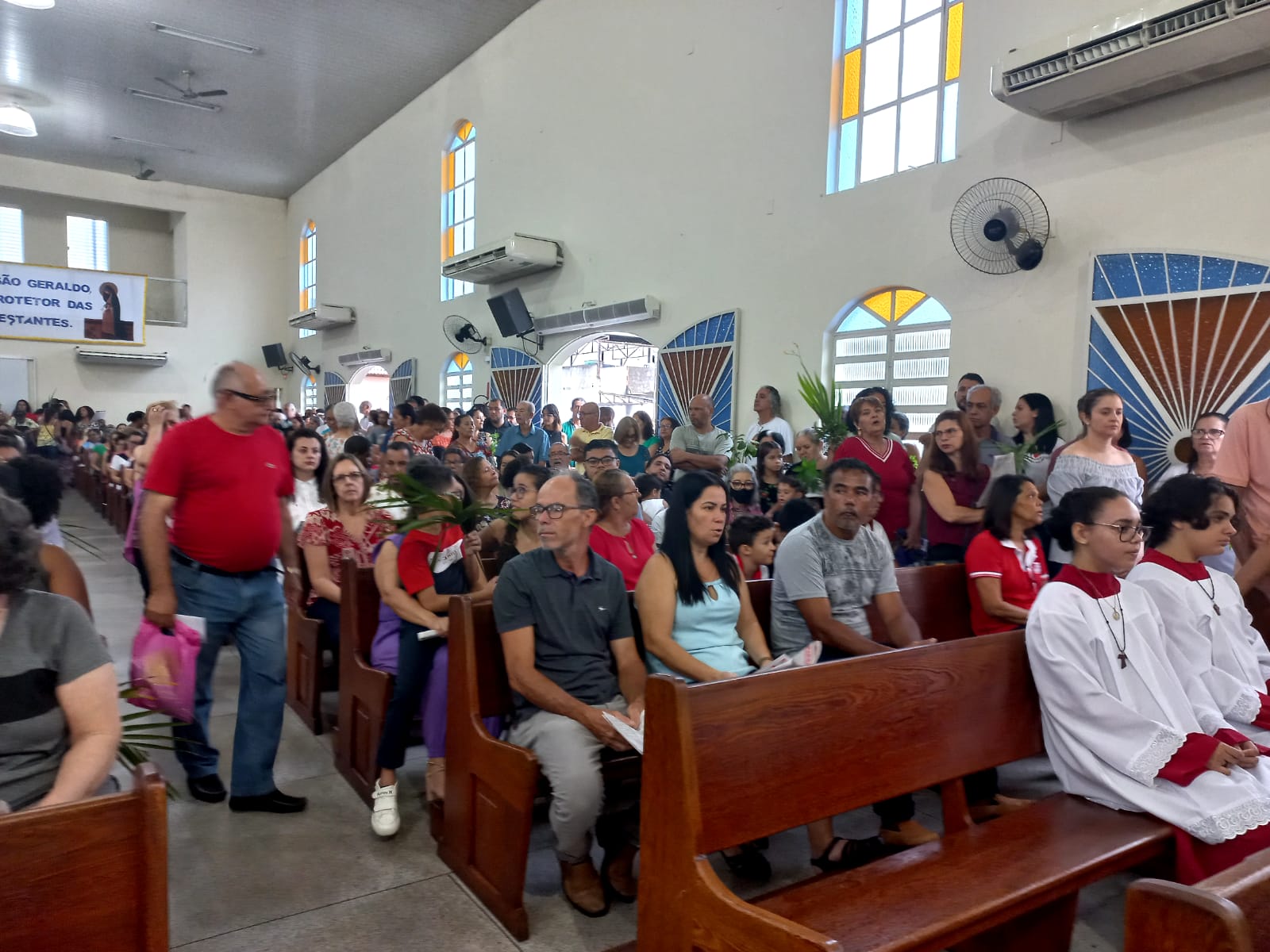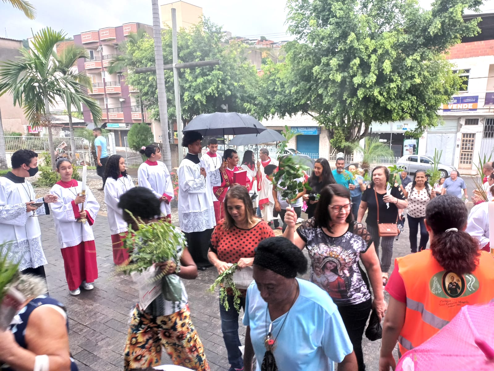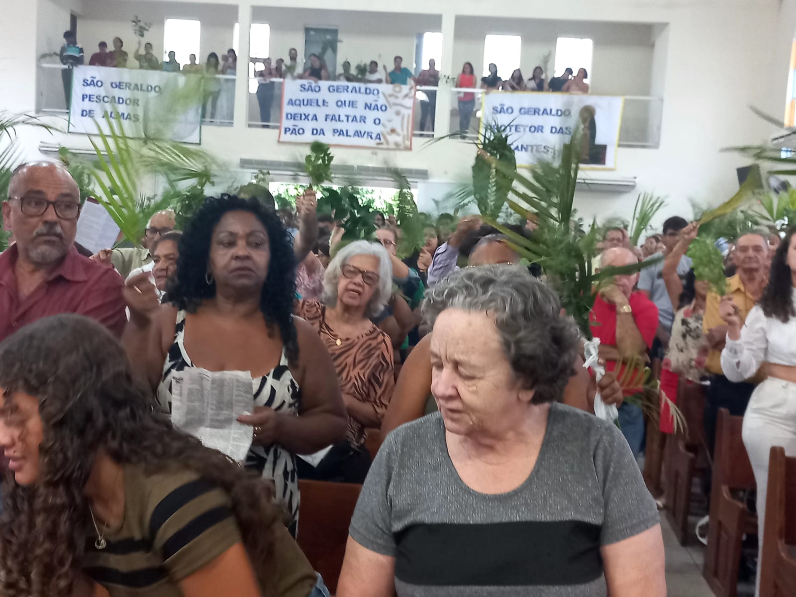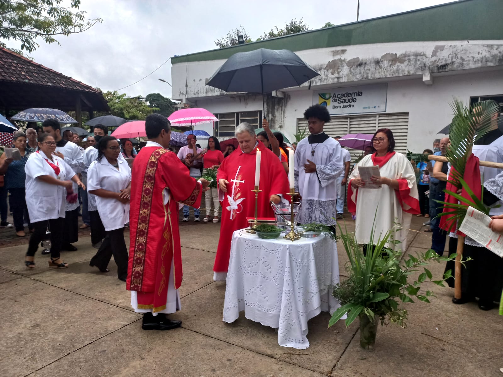 Mesmo com uma chuvinha branda no Bom Jardim, os presentes participaram da primeira parte celebrativa. Após a leitura do Evangelho e benção dos Ramos, os Fiéis seguiram em procissão para Matriz São Geraldo e Nossa Senhora das Graças. O Domingo de Ramos é a abertura da Semana Santa (Semana Maior) na Igreja Católica.