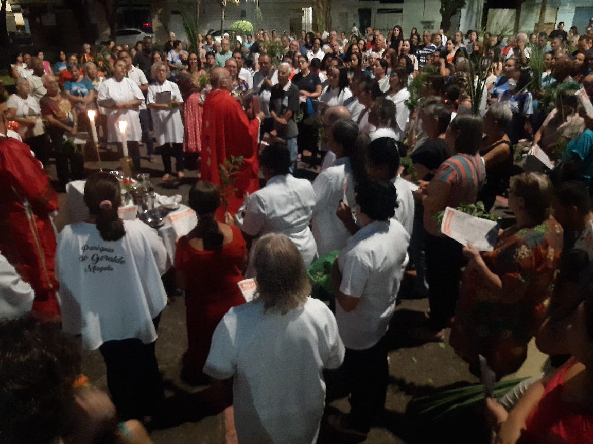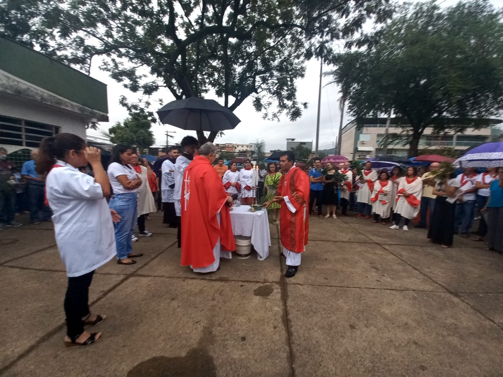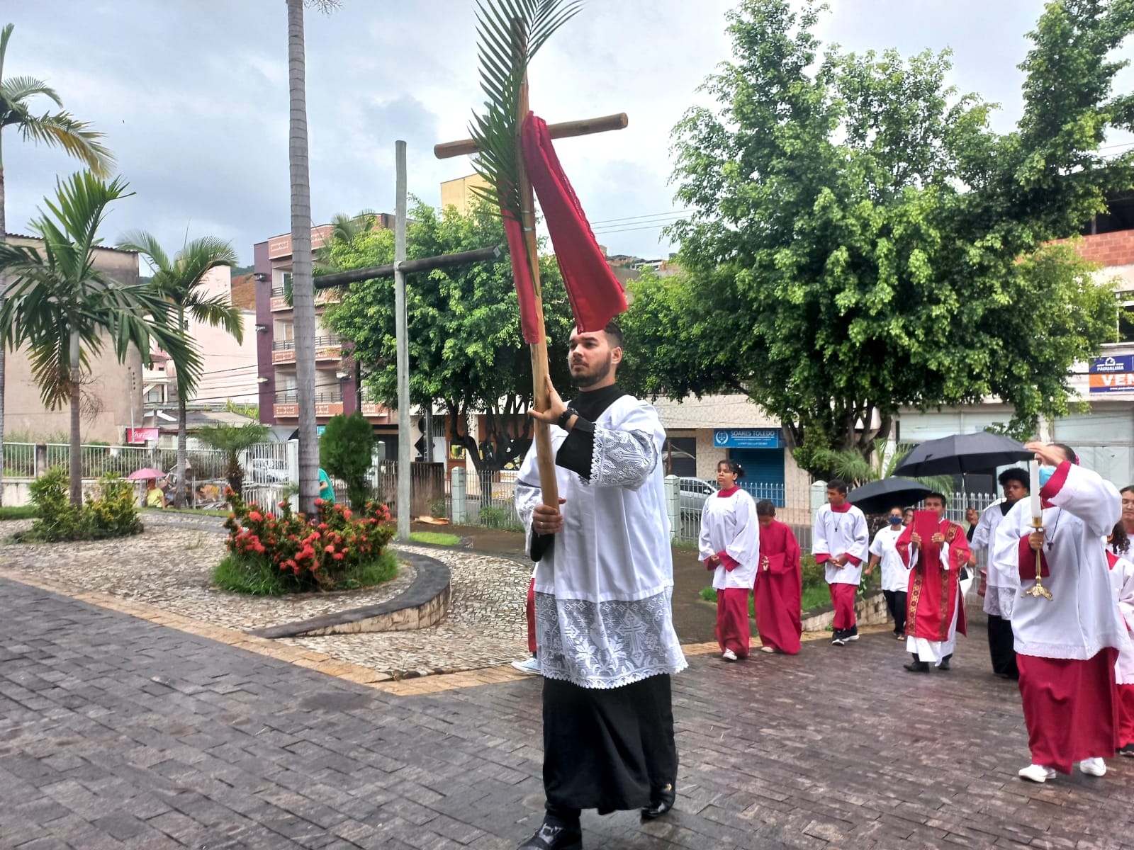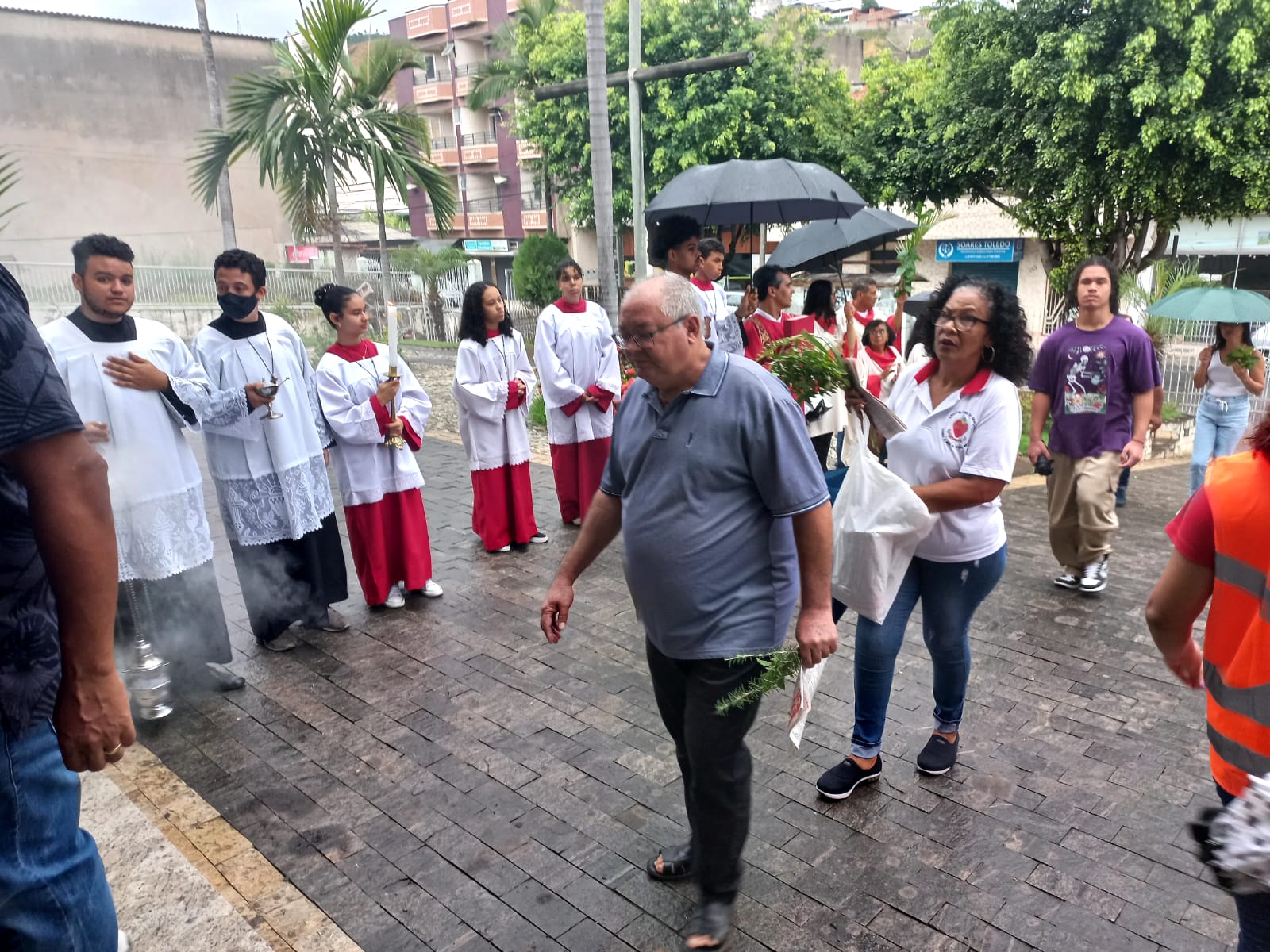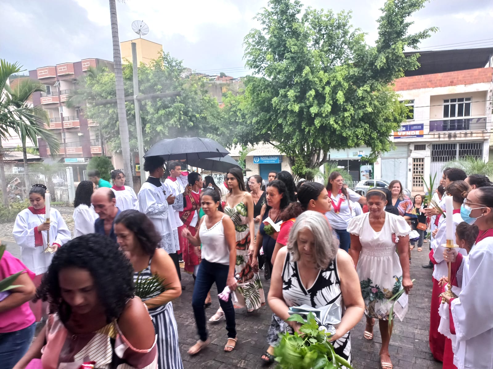 Mesmo com uma chuvinha branda no Bom Jardim, os presentes participaram da primeira parte celebrativa. Após a leitura do Evangelho e benção dos Ramos, os Fiéis seguiram em procissão para Matriz São Geraldo e Nossa Senhora das Graças. O Domingo de Ramos é a abertura da Semana Santa (Semana Maior) na Igreja Católica.